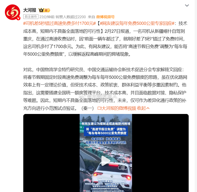 网友建议每年免费5000公里专家回应 请该网友把自己的建议系统化,要求字数不少于10万字,着重论述为什么结论是5000公里,而不是4900公里知道国家规定节假日,免除高速费用的根本用意是什么吗?不是想帮你省这点高速过路费,是想让你跨区域出行、消费,是想让你花钱消费的,你还怎么认真起来、去钻研如何省高速费的事情了呢?司机差5秒错过高速免费多付1700元,热点观点
