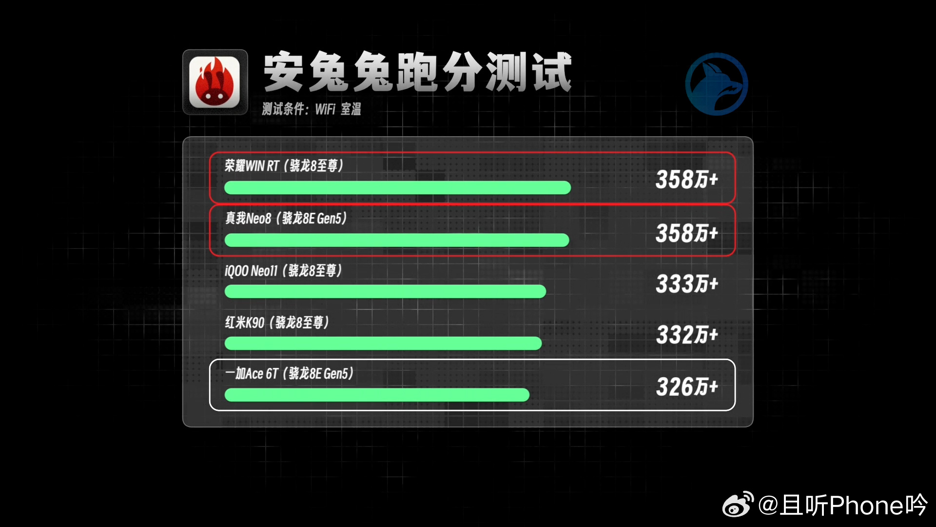 五款机型两款处理器娱乐兔跑分差距不大(图2),最多也就在10%左右,荣耀和真我最高,接近360W,相比最新旗舰8E Gen5要差15%左右。