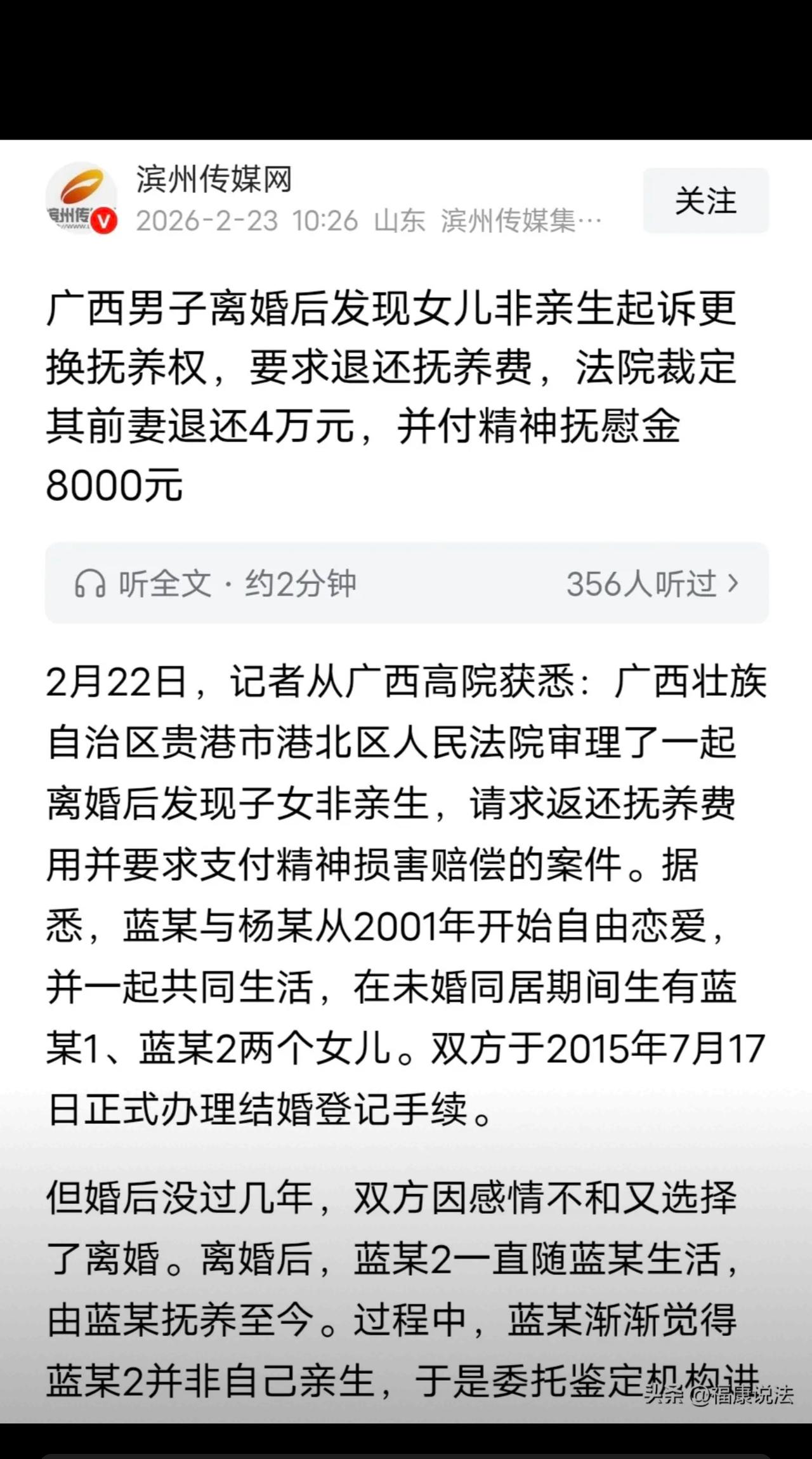 广西,男子离婚后小女儿归他抚养,大女儿归前妻,渐渐他发现小女儿不像自己,怀疑不是亲生,便去做了亲子鉴定,结果让他五雷轰顶,小女儿果真不是他亲生的,男子一怒之下告上法院,要变更抚养权,并要求前妻返还抚养费,赔偿精神损失费,法院判决让人意外。 蓝某和前妻早年同居相伴,先后生下两个女儿,后来才补办结婚证,本以为一家四口能安稳度日,可柴米油盐的磨蚀,最终让两人走到离婚。 离婚后,蓝某主动扛起抚养小女儿的责任,十几年里省吃俭用,对女儿有求必应,把所有父爱都给了孩子,身边人都夸他是负责任的好爸爸。 可随着孩子长大,身边的闲言碎语越来越多:“这孩子跟你长得一点都不像”,说的人多了,蓝某心里的疑云再也压不住。 抱着忐忑又痛苦的心情,他偷偷去做了亲子鉴定,当看到“排除生物学父亲”的结果时,这个中年男人彻底崩溃—— 他含辛茹苦养了十几年的女儿,真的不是亲生的! 多年的付出、真心、日夜操劳,全成了一场精心隐瞒的骗局,换谁能接受?愤怒又心寒的蓝某,直接将前妻告上法庭,要求变更抚养权、追回抚养费,还要精神损失赔偿! 网友看完直接炸锅: ✅“心疼死老实人了!隐瞒这么多年,良心真的过得去吗?” ✅“钱能要回来,可十几年的父爱和感情,怎么赔?” ✅“大人造的孽,最无辜的还是孩子啊” 法院查明真相后直接判定:前妻在同居及婚姻期间,故意隐瞒与他人怀孕生子的事实,严重违背夫妻忠实义务,存在重大过错! 最终判决: 小女儿由前妻抚养;前妻返还抚养费40000元,赔偿精神损害抚慰金8000元。 钱不多,但这是给被欺骗者的公道! 我真的特别共情这位父亲。 他付出的从不是单纯的抚养费,而是十几年实打实的父爱、日夜的陪伴和毫无保留的信任,最后却被最亲近的人欺骗,这种心理打击,远比金钱损失更伤人。 婚姻的底线永远是忠诚,做人的根本永远是诚信,别把别人的善良当软肋,更别把老实人的包容,当成肆意伤害的资本。 最无辜的还是孩子,从小在父爱里长大,却因为大人的过错,成了这场闹剧里最受伤的人。 对此你怎么看?你觉得这个判决解气吗?