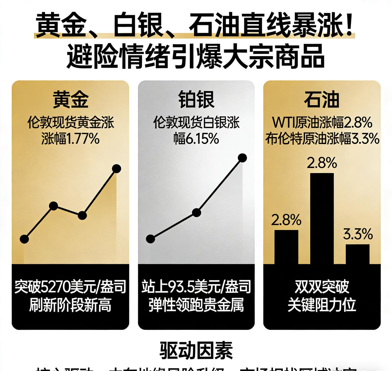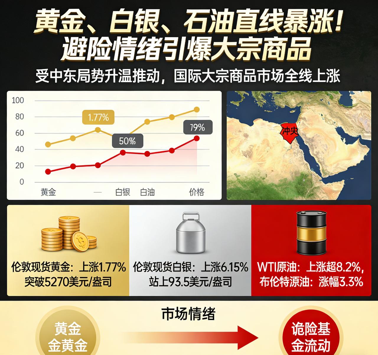 黄金、白银、石油直线暴涨!避险情绪引爆大宗商品。 受中东局势急剧升温、全球避险资金大举涌入推动,国际大宗商品市场迎来全线暴涨,黄金、白银、原油同步大幅冲高,市场进入危机定价模式。 截至2026年2月28日早盘,伦敦现货黄金直线拉升,上涨约1.77%,突破5270美元/盎司,刷新阶段新高;伦敦现货白银涨幅更为迅猛,大涨约6.15%,站上93.5美元/盎司,弹性显著领跑贵金属板块。能源市场同步走强,WTI原油上涨超2.8%,布伦特原油涨幅达3.3%,双双突破关键阻力位。 本轮行情核心驱动为中东地缘风险升级,市场担忧区域冲突扩大、能源通道受阻,叠加美元走弱、降息预期与央行购金托底,多重利好共振推动避险资产集体飙升。国内市场同步跟涨,黄金T+D、沪银主力合约大幅上行,原油期货站稳500元/桶关口。 短期来看,地缘局势仍是主导行情的核心变量,避险资金持续流入支撑价格高位运行,市场波动显著加大。白银市场行情 黄金白银 白银价格行情 白银金价 白银价格巨震 黄金避险行情 国际石油走势