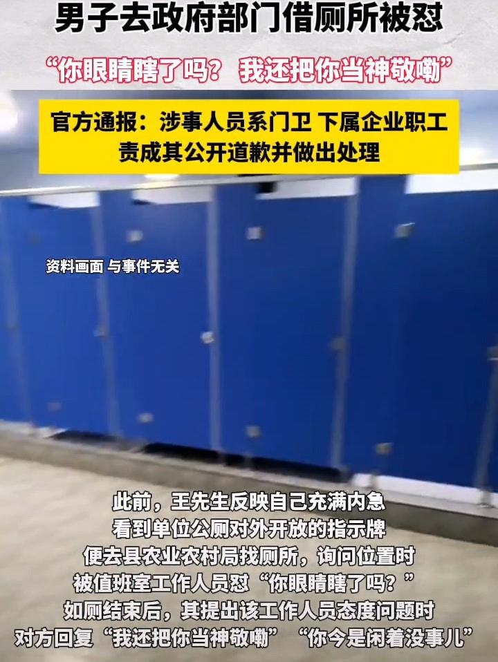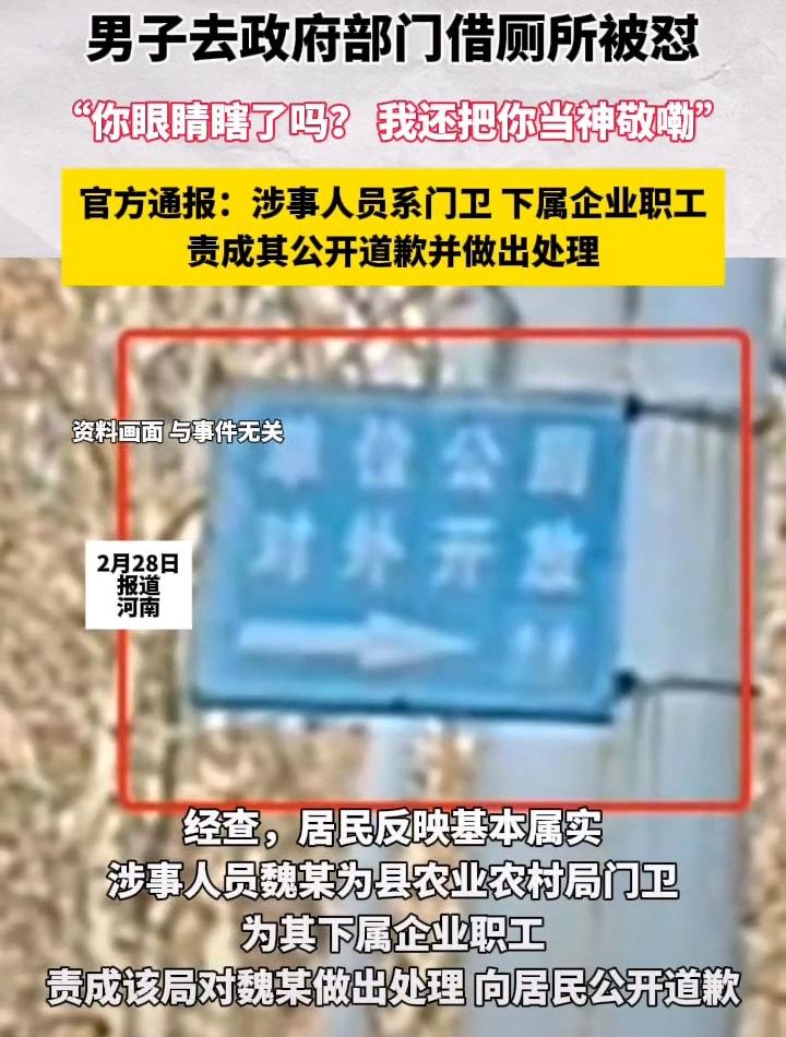 男子去政府机关借厕所遭“辱骂”,沟通被怼“我还把你当神敬嘞”,官方通报。 官方通报(河南内乡·男子借厕所遭辱骂事件) 发布时间:2026年2月27日晚(内乡网信) 调查结论:群众反映基本属实 事件经过 2月14日,居民王先生因内急,到内乡县农业农村局(公厕对外开放)借厕所,询问位置时被门卫魏某言语粗暴对待: - “你眼睛瞎了吗?” - 沟通态度时被怼:“我还把你当神敬嘞” 处理结果 1. 涉事人员:魏某,县农业农村局门卫,下属企业职工 2. 责成农业农村局对魏某依规依纪处理 3. 责令魏某向王先生公开道歉 4. 农业农村局开展纪律作风专项整顿辱骂 公务员辱骂群众 公职人员上访