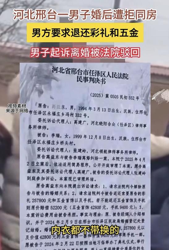 “家丑外扬!”河北邢台,男子给了女子30多万彩礼,二人登记结婚,可婚后女子拒绝同房,结婚10个月还分房睡,女子甚至睡觉都不脱衣服,极少换衣服,更不让丈夫碰,男子无奈提出离婚,让人奇怪的是,女子既不同意离婚,也不退彩礼。男子告上法院,要求离婚,法院不支持离婚,一怒之下租礼炮去女方家要说法。 河北邢台,经过媒人介绍,男子认识了女子,两人相处了一段时间后,双方家长就商量起了婚事,女子家人提出要30多万彩礼,男子家人虽然觉得压力很大,但为了儿子的婚事,还是咬牙答应了。 按照当地习俗,男子按时将30多万彩礼送到女方家,双方顺利办理了结婚登记,举办了婚礼,看似一切都朝着美好的方向发展。 可婚礼结束后,男子才发现,这场婚姻从一开始就充满了诡异。新婚之夜,女子就以身体不适为由,拒绝和他同房,独自搬到了另一个房间睡觉, 男子虽然觉得有些不妥,但想着刚结婚,女子可能还有些拘谨,就没有过多强求,想着慢慢相处,总会好起来的。 可他万万没想到,这一分房,就持续了整整10个月。这10个月里,两人虽然同住一个屋檐下,却形同陌路,女子每天按时上下班,回到家就躲在自己的房间里,很少和他交流,更别说主动亲近他。 更让男子无法接受的是,女子睡觉从来都不脱衣服,哪怕是炎热的天气,也始终穿着完整的衣物,平时也极少换衣服,浑身上下都透着一股疏离感。 男子也曾尝试过和女子沟通,试图了解她的想法,可女子总是态度冷淡,要么沉默不语,要么找各种借口推脱,始终不肯敞开心扉,也坚决不让男子碰自己一下。 日复一日,男子的耐心被一点点耗尽,他觉得这样的婚姻毫无意义,没有夫妻间的温情,甚至连最基本的相处都做不到,和单身没什么区别。 忍无可忍之下,男子向女子提出了离婚,他想着,既然两人无法好好相处,不如好聚好散,返还彩礼,各自开始新的生活。 可让他意想不到的是,女子竟然明确拒绝了离婚,无论他怎么劝说,都不肯点头,可与此同时,她也拒绝退还当初收下的30多万彩礼,态度坚决又强硬。 男子彻底陷入了两难,不离婚,两人无法正常相处,守着一段名存实亡的婚姻;离婚,女子不同意,彩礼也拿不回来,家里借的债还没还清,30多万的彩礼对他来说,是全家的希望,更是一笔无法承受的损失。 无奈之下,男子只好选择拿起法律武器,将女子告上法院,请求法院判决离婚,并要求女子退还30多万彩礼。 他本以为,自己有理有据,法院会支持他的诉求,可法院审理后,认为两人虽然婚后相处不和,但尚未达到感情破裂的程度,且男子提交的证据不足以支撑离婚诉求,最终驳回了他的离婚请求,也没有支持他要求返还彩礼的主张。 愤怒之下,男子也顾不上什么“家丑不可外扬”,直接租了礼炮,带着几个亲戚,浩浩荡荡地跑到女方家要说法。 礼炮在女方家门前不停燃放,吸引了周边不少邻居围观,一时间,围观的人越来越多,大家议论纷纷,女子家人觉得颜面尽失,却依旧不肯松口,既不答应离婚,也不退还彩礼。 男子站在女方家门前,看着围观的人群,诉说着自己的委屈,他说自己花光全家积蓄,借了一身债,就想娶个媳妇好好过日子, 可没想到落得这样的下场,女子的做法,不仅毁了他的婚姻,也拖垮了他的家庭。他只想拿回属于自己的彩礼,顺利离婚,可却比登天还难。 目前,双方依旧僵持不下,男子没有放弃,还在准备收集更多证据,继续通过法律途径维权,而女子依旧态度强硬,既不离婚,也不退还彩礼。 对此,你们有什么看法,欢迎评论留言~
