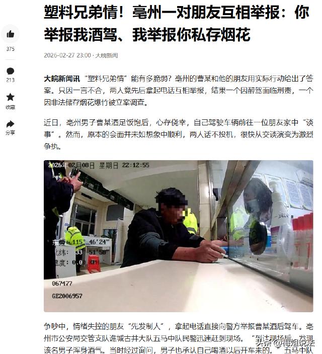安徽亳州,曹某酒后开车去朋友家,两人聊天起争执,朋友直接报警举报曹某酒驾。民警到场后,曹某承认酒驾,又反手举报朋友非法储存烟花。民警一查,还真在朋友家找出不少烟花。最后,曹某因醉驾面临刑事处罚,驾照吊销且5年内不得重考,朋友也因非法储存危险物质被立案调查。 民警赶到的时候,曹某还没从争执的火气里缓过来。 他没躲没藏,民警一测酒精,数值直接超标,妥妥的醉驾。 本来还挺硬气的曹某,看到民警的检测结果,瞬间蔫了半截。 但也就蔫了一会儿,他转头就盯着朋友,眼神里全是不服气。 你不是狠吗,敢报警抓我。 那我也不让你好过,我知道你家藏着啥。 曹某当场就跟民警说,朋友家非法储存烟花,藏了不少,不信去查。 民警一开始还以为是他气头上乱咬人,没太当回事。 毕竟俩人刚吵完架,互相报复也很常见。 可本着负责的态度,民警还是跟着朋友去了他家。 一进门,掀开客厅角落的布帘,一堆烟花赫然在目,包装都没拆,堆得老高。 朋友当时脸就白了,支支吾吾说不出话。 谁能想到,自己一时赌气举报朋友,反倒被朋友反手将了一军,把自己也搭进去了。 其实曹某本来不该走到这一步。 事发那天晚上,他跟几个熟人一起喝酒,喝到半夜才散场。 酒劲上来,脑子有点飘,但他觉得自己意识还清醒。 想着朋友家离得不远,就几步路的距离,大晚上的,路上肯定没有交警查岗。 侥幸心理一上来,他就忘了酒驾的危害,也忘了法律的规定。 拉开车门,一脚油门就往朋友家赶,心里还盘算着跟朋友唠唠嗑,解解闷。 他没想着,这一脚油门,不仅踩碎了自己的安稳,也把朋友的侥幸彻底戳破。 到了朋友家,俩人一开始聊得还挺投机,从家常说到工作,有说有笑。 可聊着聊着,就因为一件小事吵了起来。 越吵越凶,谁也不肯让着谁,语气也越来越冲。 朋友被曹某吵得急了,也没多想,掏出手机就打了报警电话,直接举报曹某酒驾。 他以为这样能治住曹某,让曹某服软认错。 没想到,曹某也是个暴脾气,被举报后彻底急眼了,当场就翻了脸。 俩人吵得更凶了,直到民警赶到,才勉强平息下来。 曹某承认酒驾的时候,心里就憋着一股气。 他知道自己酒驾跑不了了,索性破罐子破摔,把朋友藏烟花的事给捅了出来。 后来民警核实,朋友藏的那些烟花,没有任何合法储存手续,也没有符合安全标准的储存条件。 就那么随意堆在客厅角落,旁边还有电线和杂物,一旦发生意外,后果不堪设想。 朋友说,那些烟花是过年的时候没放完剩下的,想着留着以后再用,就随手放在家里了。 他觉得就几箱烟花,放在家里没事,没人会查,也没想到会触犯法律。 可他不知道,烟花爆竹属于易燃易爆危险物质,私自储存本身就是违法行为。 这俩人,一个心存侥幸酒驾,一个明知故犯私藏烟花,最后落得个两败俱伤的下场。 曹某醉驾要负啥法律责任,朋友私藏烟花又该被怎么罚?为什么一个要被刑事处罚,一个要被立案调查呢? 根据《关于办理醉酒危险驾驶刑事案件的意见》第四条规定,在道路上驾驶机动车,经呼气酒精含量检测,显示血液酒精含量达到80毫克/100毫升以上的,公安机关应当依法立案。 曹某酒后开车上路,酒精检测超标,已构成醉驾,违反了刑法第一百三十三条之一的危险驾驶罪,所以才会面临刑事处罚,驾照被吊销且5年内不得重考。 只要醉驾,就不是简单的罚款扣分,而是要负刑事责任,留下案底,影响自己和家人。 根据治安管理处罚法第三十条规定,违反规定,储存爆炸性、毒害性等危险物质的,处十日以上十五日以下拘留;情节较轻的,处五日以上十日以下拘留。 烟花爆竹属于爆炸性危险物质,他没有合法储存许可,私自在家中储存大量烟花,已经违反了这条规定,情节严重的还可能触及刑法中的非法储存爆炸物罪,所以被立案调查完全是咎由自取。 很多人觉得家里放几箱烟花没事,其实这已经踩了法律红线。 这俩人都心存侥幸,又一时冲动,互相报复,最后双双触犯法律。 曹某不该酒驾,更不该在被举报后恶意报复;朋友不该一时赌气举报,更不该私自储存烟花,漠视公共安全。 最后,曹某因醉驾面临刑事处罚,驾照吊销且5年内不得重考,朋友因非法储存危险物质被立案调查,后续将依法接受处理。 俩人本来是朋友,却因为一时冲动和侥幸,闹得两败俱伤,既丢了面子,又要承担法律责任,真的太不值了。 你们觉得,这俩人到底谁更冤?如果是你,遇到这种争执,会选择报警举报,还是冷静下来好好沟通?评论区说说你的看法。
