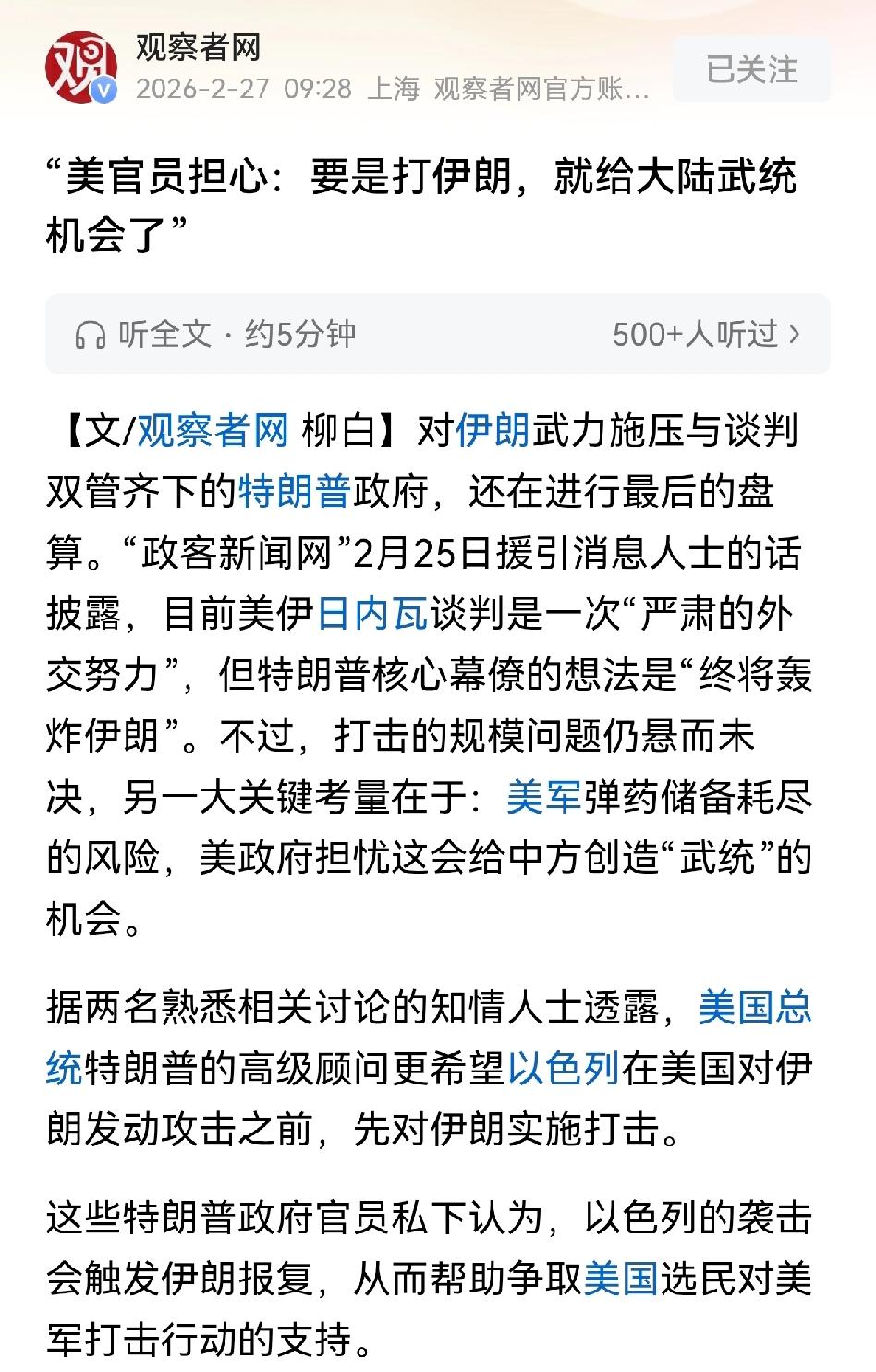 美国以色列对伊朗展开军事打击,以色列更是宣布要进行4天的连续进攻。在开打前,美国官员担心:要是打伊朗,就给大陆武统的机会了。在美国考虑对伊朗采取军事行动前,最重要的一个考量,就是美国军队的弹药储备耗尽的风险,这会给老中创造出机会。不管这是不是美政府放出来的烟雾弹,现在美国已经对伊朗动手了,局势如何变化,伊朗能不能把美国拉下水,更关键的是看伊朗的导弹给不给力,能不能像胡塞武装那样从沙漠捡到给力的导弹! 老美一直不敢动手,就是怕陷入中东,所以这次让以色列打先锋,自己躲在两艘航母上进行空中袭击。