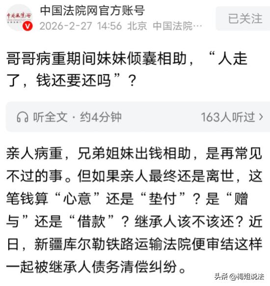 新疆,女子见哥哥病重,毫不犹豫转15万治病,可哥哥还是走了。女子找侄子商量,想从哥哥遗产里拿回垫付款,侄子却称是赠与,还拿聊天记录当证据。女子拿出聊天记录和证人证明是垫付,姑侄争论不下闹上法庭,费用判了! 好好的一家人,因为钱,闹得反目成仇。 2023年的时候,王某就病得不行了,躺在床上,连起身都费劲,脸色差得吓人。 他妹妹,也就是这起纠纷的女主,得知消息后,连夜赶了过去。 看到哥哥瘦得脱了形,说话都有气无力,她当场就哭了。 医生说,要想治病,得先交一大笔钱,后续还有各种治疗费用。 她没半点犹豫,心里就一个念头,不管花多少钱,都要把哥哥救回来。 可她也不是什么有钱人,平日里省吃俭用,攒下的钱根本不够。 整整两个月,她到处找人借钱,亲戚朋友借了个遍,甚至刷了好几张信用卡。 凑来凑去,终于凑够了15万,一分没留,全部转给了哥哥,用于治病。 那时候,她压根没想着要还,亲哥哥,都病成这样了,谈钱太伤感情。 她每天下班就往医院跑,端水喂药,洗衣擦身,忙前忙后,没半点怨言。 周围的人都看在眼里,都说王某有个好妹妹,比亲闺女还贴心。 可老天爷就是这么不公平,不管怎么治,哥哥的病情还是一天比一天重。 熬到2024年9月,哥哥还是走了,走的时候,拉着她的手,眼里全是愧疚。 她心里空落落的,哥哥没了,再多的钱,也换不回亲人。 料理完哥哥的后事,家里的积蓄也花得差不多了。 她才想起,那15万,是她东拼西凑借来的,还有信用卡要还,借亲戚的钱也要还。 哥哥有遗产,虽然不多,但足够还她这15万垫付款了。 她找到侄子,也就是哥哥的儿子,想着都是一家人,好好商量,侄子应该能理解。 她把事情的来龙去脉说了一遍,希望能从哥哥的遗产里,拿回自己垫付的15万。 没想到,侄子的态度,让她心凉透了。 侄子直接翻出手机里的聊天记录,扔到她面前,说这15万是她自愿给的,是赠与。 还说,钱给出去了,就没有往回要的道理,就算是亲姑姑,也不能反悔。 她当时就懵了,怎么也没想到,自己掏心掏肺救哥哥,最后竟被侄子倒打一耙。 她赶紧拿出自己的手机,翻出和哥哥的聊天记录,里面清清楚楚说着,这钱是垫付的,等哥哥病好后,从遗产里还她。 她还找来了当时借钱给她的亲戚,还有医院的护士,作为证人。 证人都能证明,她当时借钱,就是为了给哥哥治病,从来没说过是赠与。 可侄子根本不认,一口咬定,聊天记录是伪造的,证人也是她找来帮腔的。 侄子却丝毫不让步,说她就是想趁哥哥刚走,霸占哥哥的遗产。 好好的姑侄情分,彻底闹掰了。 她没办法,只能把侄子告上了法庭,她不想争什么,只想拿回自己垫付的15万。 那么,亲戚之间垫付的医药费,没写借条,到底算赠与还是借款?侄子拿聊天记录当证据,女子能要回这15万吗?法律上到底怎么认定? 依据《民法典》第657条规定,赠与合同是赠与人将自己的财产无偿给予受赠人,受赠人表示接受赠与的合同。 也就是说,赠与就是无偿给,不用还,但前提是,赠与人得明确表示是赠与,受赠人也得接受。 女子给哥哥转15万的时候,没说过是赠与,聊天记录里,还明确说是垫付,等哥哥病好后从遗产里还。 《最高法关于审理民间借贷案件适用法律若干问题》的规定第二条,出借人起诉时,只要能提供证据证明借贷关系存在,法院就会受理。 女子有和哥哥的聊天记录,还有证人证言,这些证据放在一起,就形成了完整的证据链,能证明这15万是垫付,是借款,不是赠与。 侄子说这是赠与,可他手里的聊天记录,根本没有女子明确表示赠与的内容。 不能仅凭他一句话,就认定是赠与。 另外,这笔钱是女子东拼西凑借来的,数额不小,15万对于普通家庭来说,不是一笔小数目。 从常理来说,没有人会平白无故把这么大一笔钱,无偿赠与给哥哥,尤其是在自己经济不宽裕,还需要借钱的情况下。 哥哥的遗产,本来就应该先偿还生前的债务。 女子垫付的15万,属于哥哥的债务,理应从遗产中优先偿还。 法院审理后,认定女子提供的证据真实有效,双方存在借贷关系,不是赠与。 最终,判决侄子从其父亲王某的遗产中,返还女子垫付的15万元治病款。 这事其实很简单,亲情归亲情,金钱归金钱,不能因为是亲戚,就想赖账,就无视别人的付出。 女子救哥哥,垫付15万,没图什么回报,只是想让哥哥能好起来。 可侄子却借着哥哥去世,想霸占这笔钱,把姑姑的好心当成驴肝肺,真的太寒心了。 你觉得侄子的做法过分吗?如果是你,会轻易原谅这样的侄子吗?