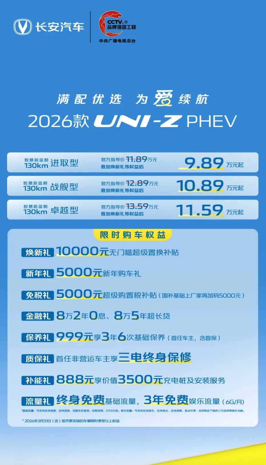 仅售9.89万元起!2026款UNI-Z PHEV价格公布,共推出3款车型,指导售价11.89万元-13.59万元,叠加权益后限时优惠价9.89万元-11.59万元,作为参考,新款长安UNI-Z PHEV的长宽高分别为4730/1890/1660毫米,轴距为2795毫米,新车纯电续航130km,综合续航1250km,百公里综合油耗仅1.3L。充电方面,新车支持85kW快充,电量从30%充至80%仅需15分钟。【来自懂车帝车友圈】