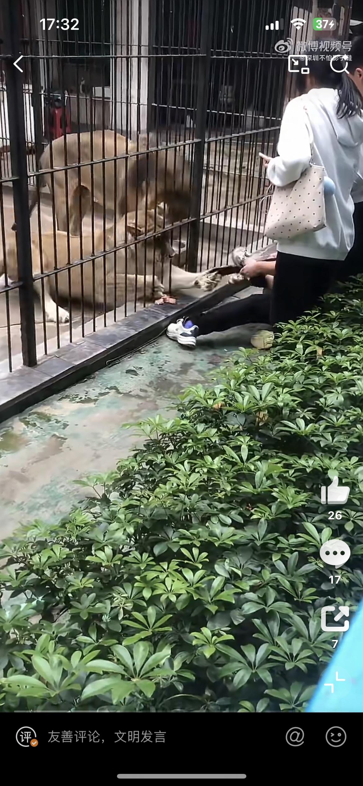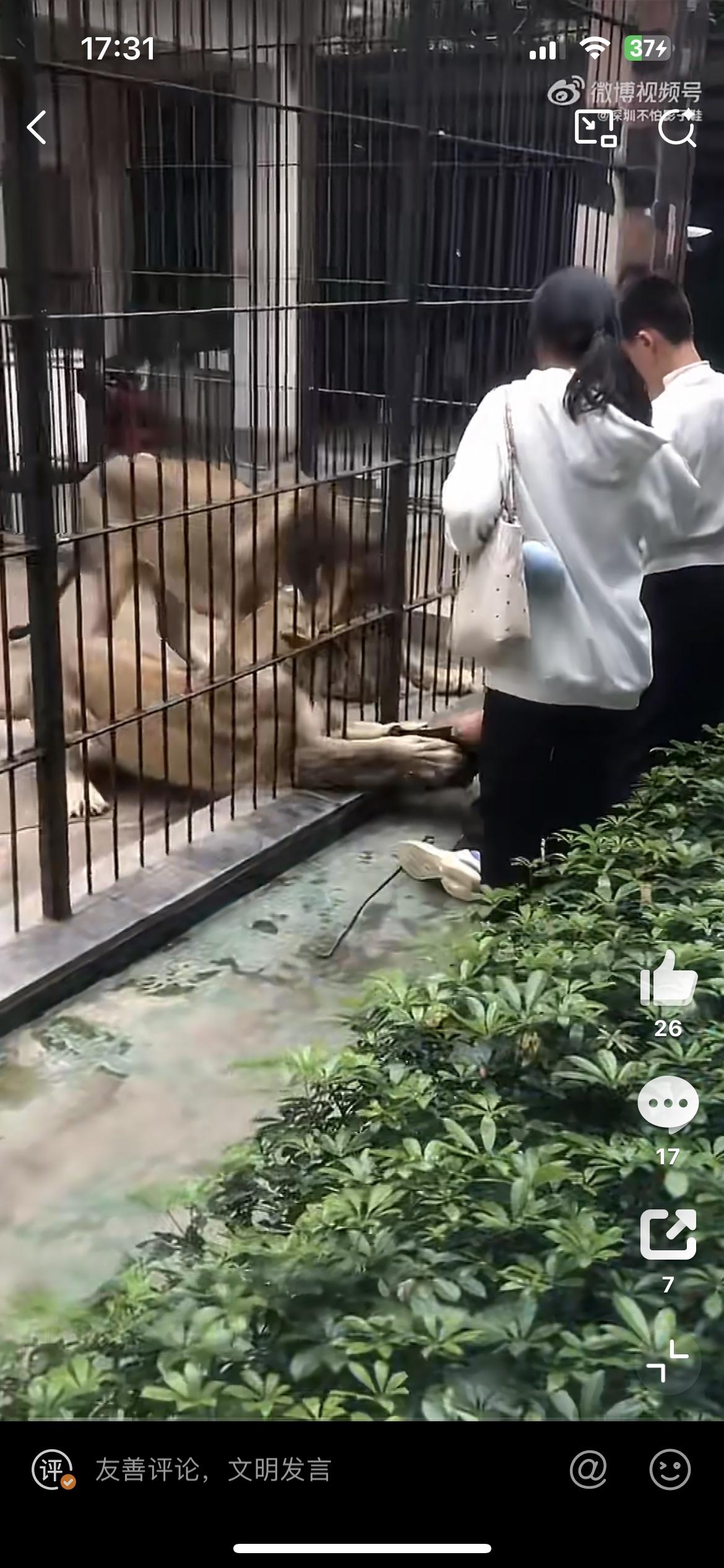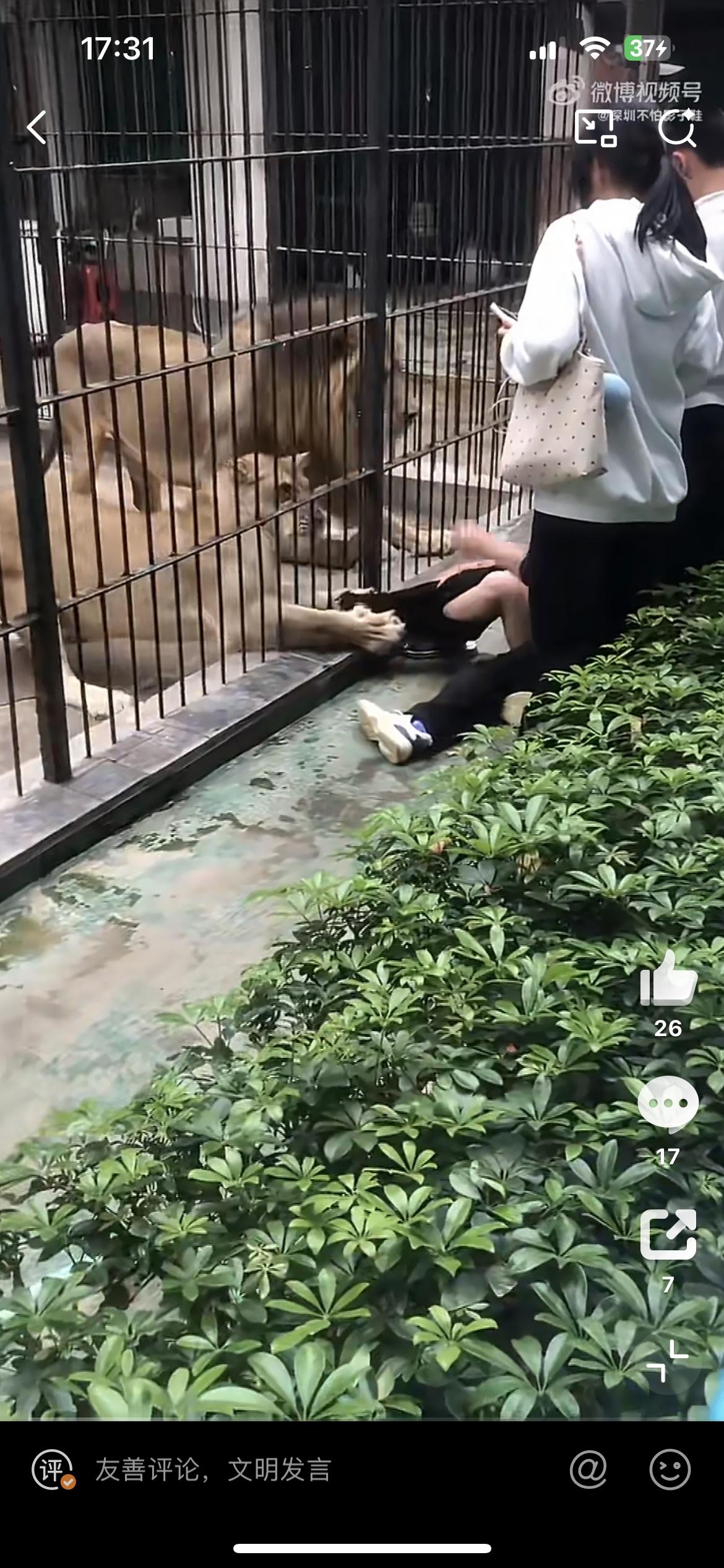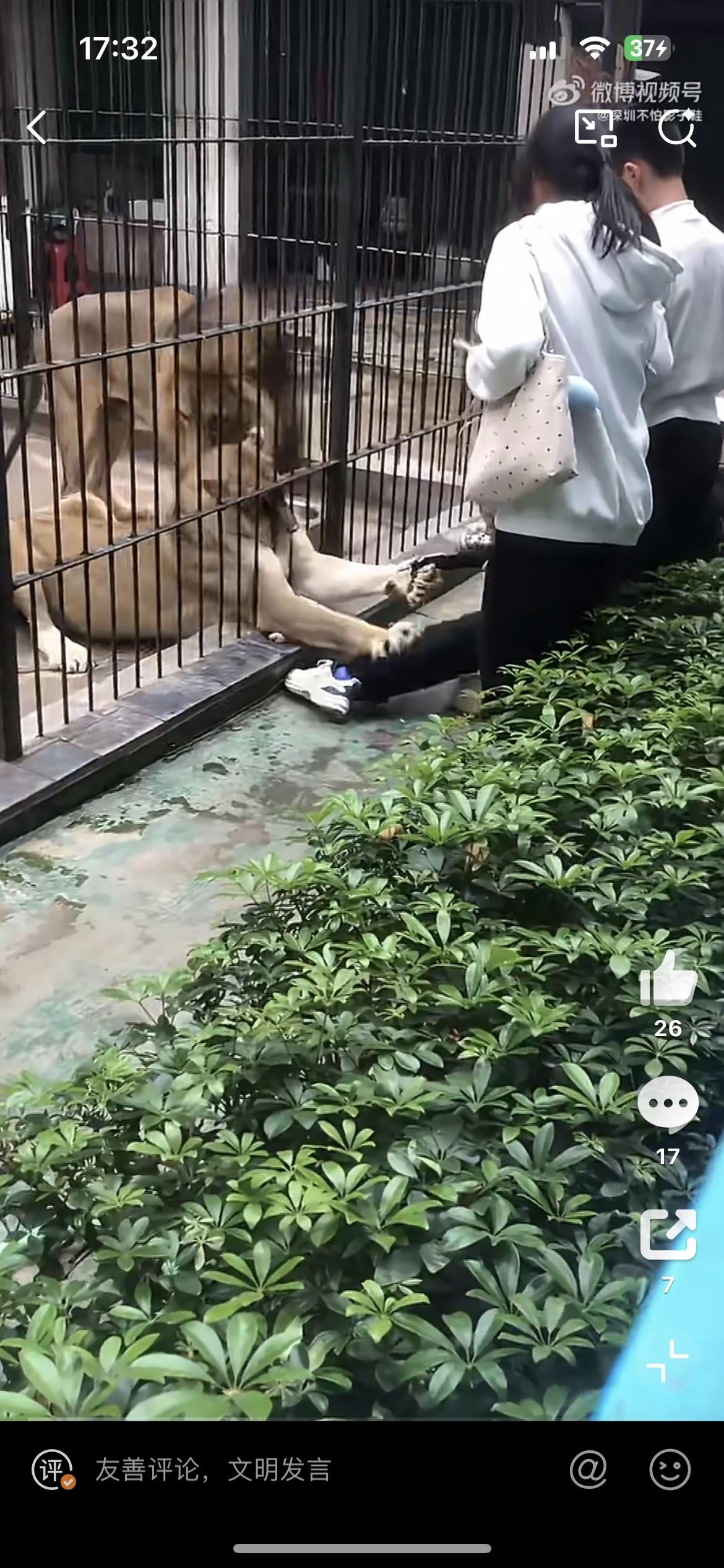一女孩近距离投喂狮子,被一头发狂的母狮抓住裤子,幸好被旁边的男子拼死护住,否则后果不堪设想。2月26日,事发汕头中山公园动物园。女孩裤子都被狮子扯掉了,幸好没有受伤。从现场看,其他游客都是隔着栅栏观看狮子,为啥这个小女孩能进入栏杆内,仅仅隔着铁笼子,问题是铁笼子内狮子的长腿和爪子是可以伸出来的,这也太危险了吧。狮子女生