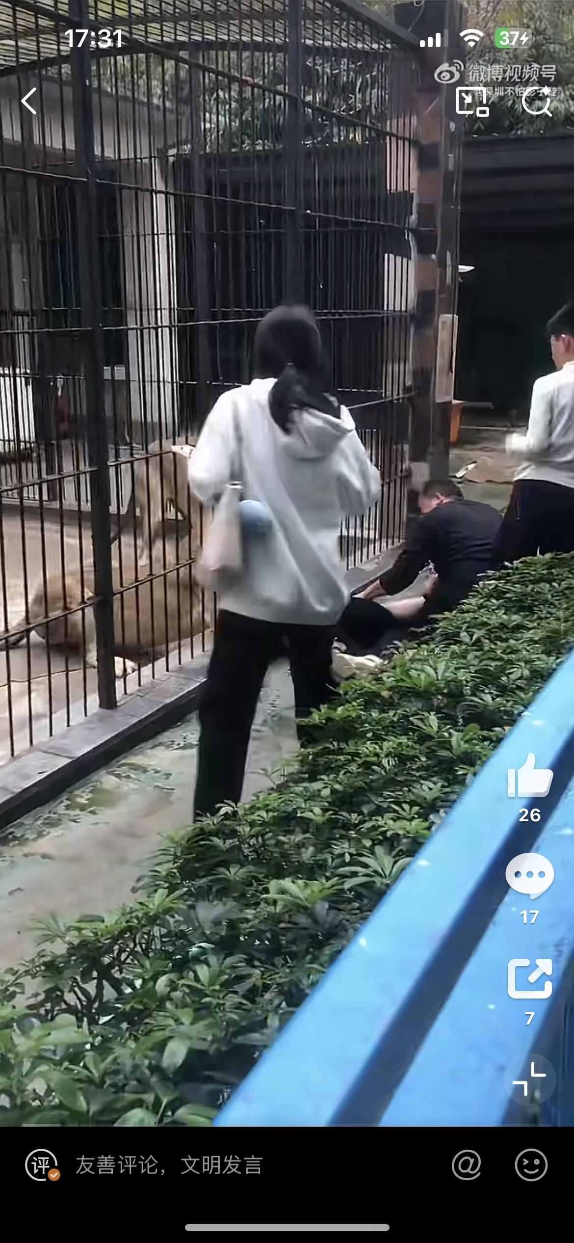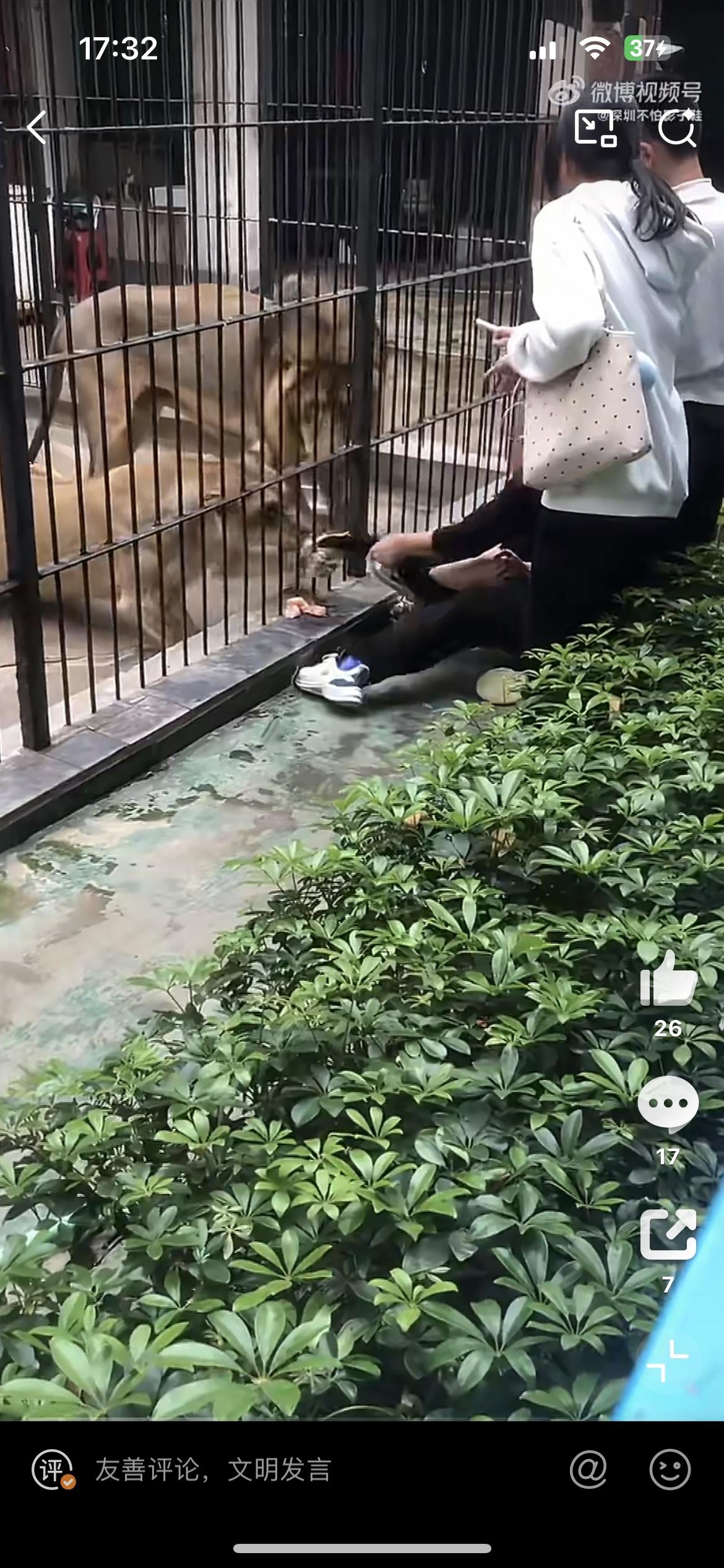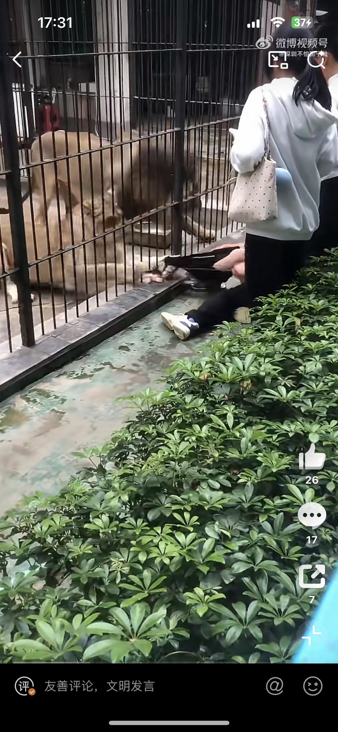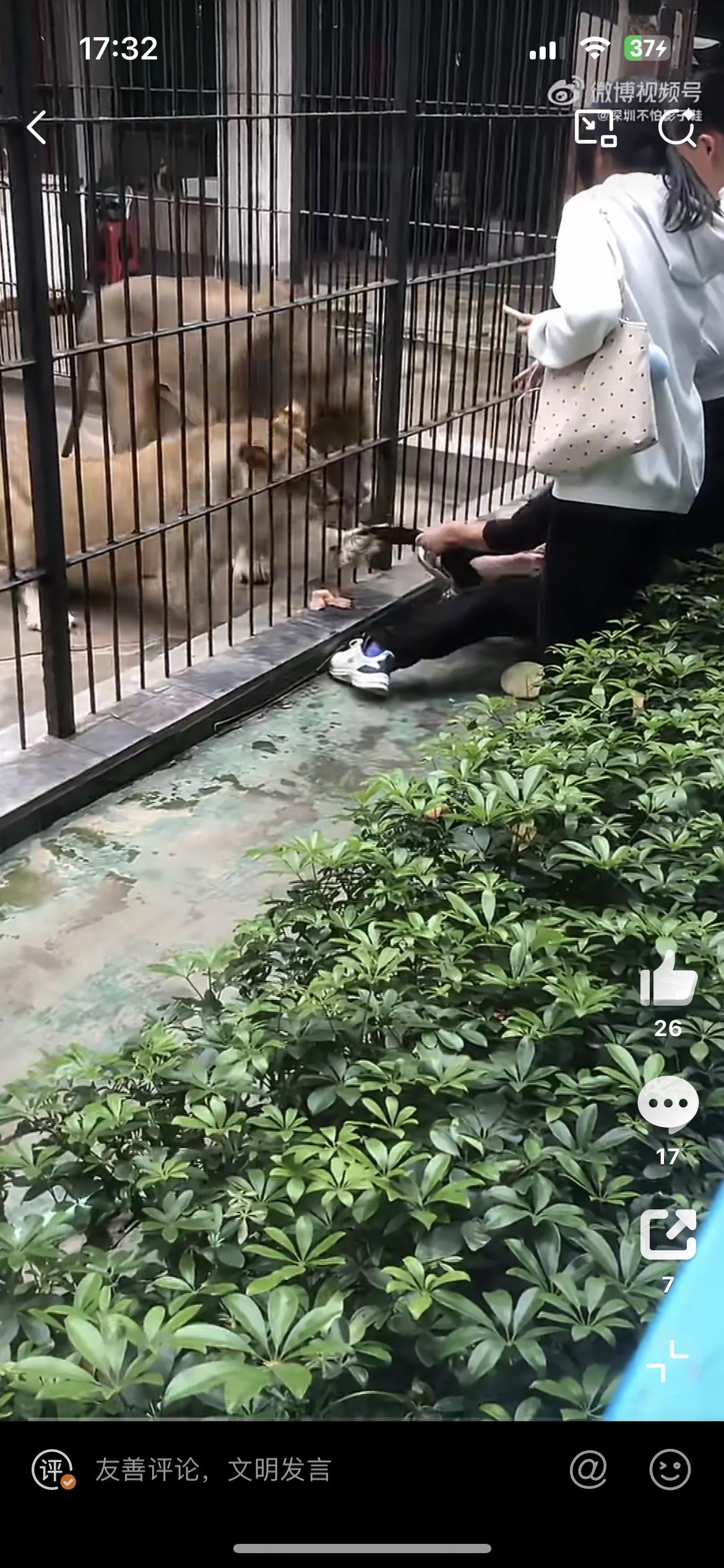一女孩近距离投喂狮子,被一头发狂的母狮抓住裤子,幸好被旁边的男子拼死护住,否则后果不堪设想。2月26日,事发汕头中山公园动物园。女孩裤子都被狮子扯掉了,幸好没有受伤。从现场看,其他游客都是隔着栅栏观看狮子,为啥这个小女孩能进入栏杆内,仅仅隔着铁笼子,问题是铁笼子内狮子的长腿和爪子是可以伸出来的,这也太危险了吧。狮子女生