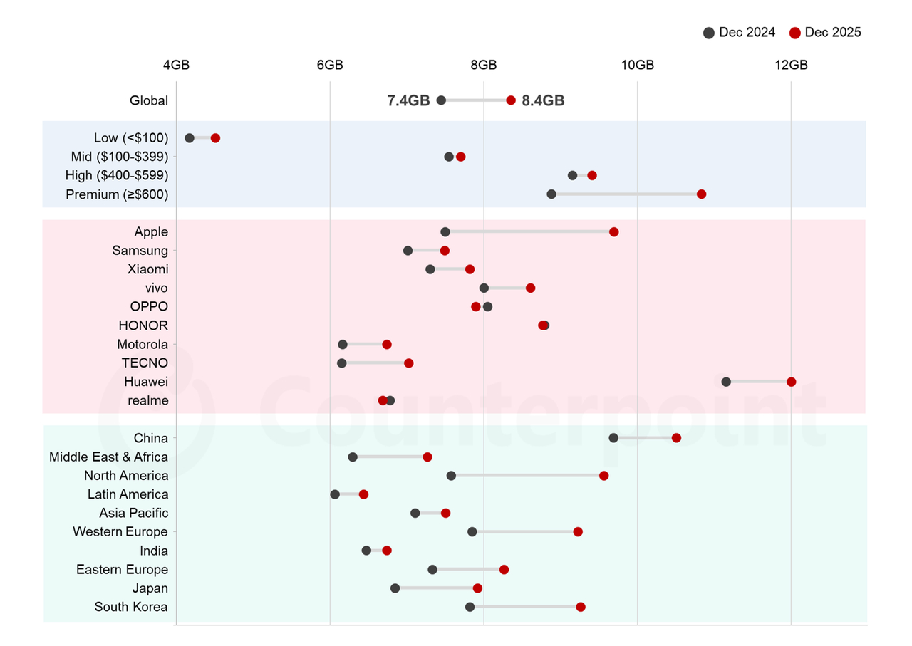 根据Counterpoint手机型号销售追踪报告,2025年12月全球智能手机平均DRAM容量达到8.4GB,高于2024年12月的7.4GB。全球市场我们国家的平均容量依旧第一,华为12G的平均内存在10大品牌中排名第一。大家现在用的手机运行内存都是多大的?