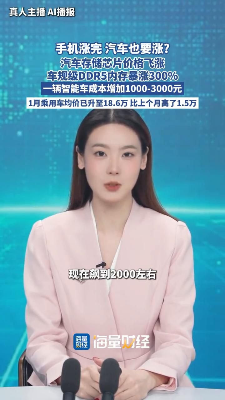 手机涨完汽车也要涨?汽车存储芯片价格飞涨,车规级DDR5内存暴涨300%,一辆智能车成本增加1000-3000元,1月乘用车均价已升至18.6万,比上个月高了1.5万。 海量财经主播雪宁。 手机涨完汽车也要涨?继手机集体涨价后,车规级内存价格飙涨2-4倍。蔚来汽车CEO李斌委婉提醒,建议早些购车。车规级芯片涨价比手机还狠,DDR5内存直接暴涨300%。为什么?因为芯片厂都跑去给Al做"超级内存"HBM了,利润高好几倍。 汽车用的DDR4产能被压缩,车企采购份额又不到5%,根本抢不过谷歌那些AI大厂。结果就是一辆智能车原本700元的芯片成本,现在飙到2000左右,凭空多出1000到3000元。蔚来李斌都急了,"我们在和AI抢资源压力很大"。雷军也说,光内存今年可能就要涨几千。 数据已经显现,2026年1月乘用车均价涨到18.6万,比上个月高了1.5万,新能源车更是冲到19.5万。所以想买车的可能真得早做打算了。