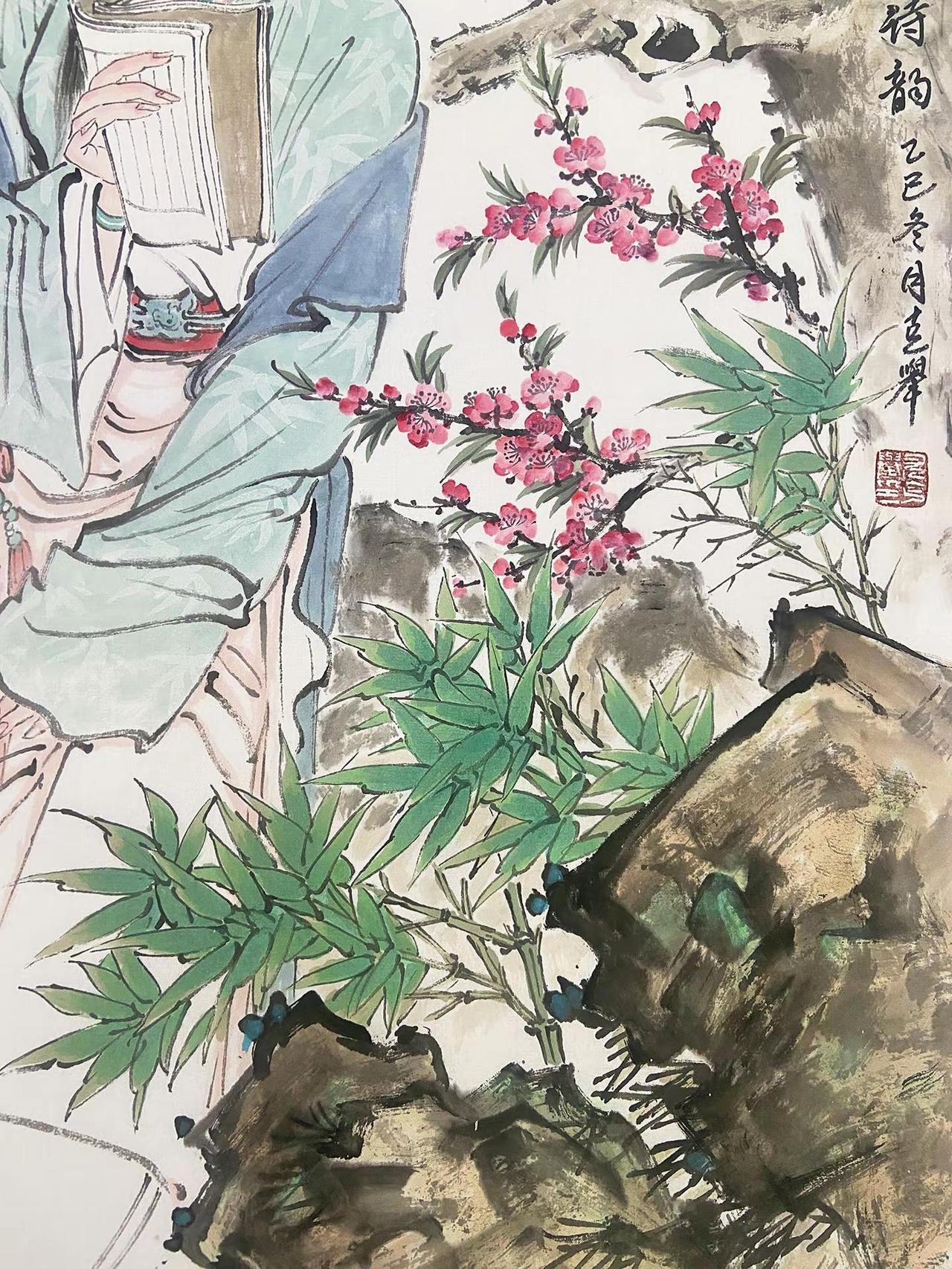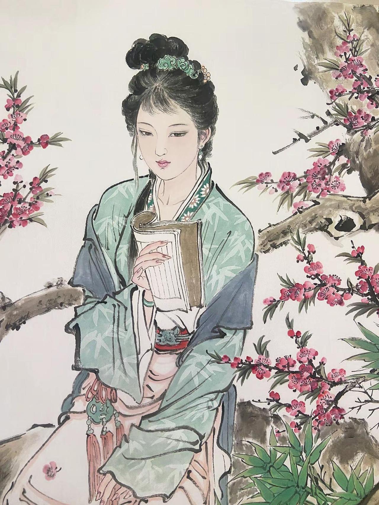 青石为席,竹影为帘,她在桃树下静展书卷。衣袂拂过的风,带着花瓣的轻香;目光停驻的字,藏着心底的诗。这一方小园,便是她的整个天地,诗与春,都在她的指尖与眉间。古风人物绘画 创作者中心 水墨画 国画