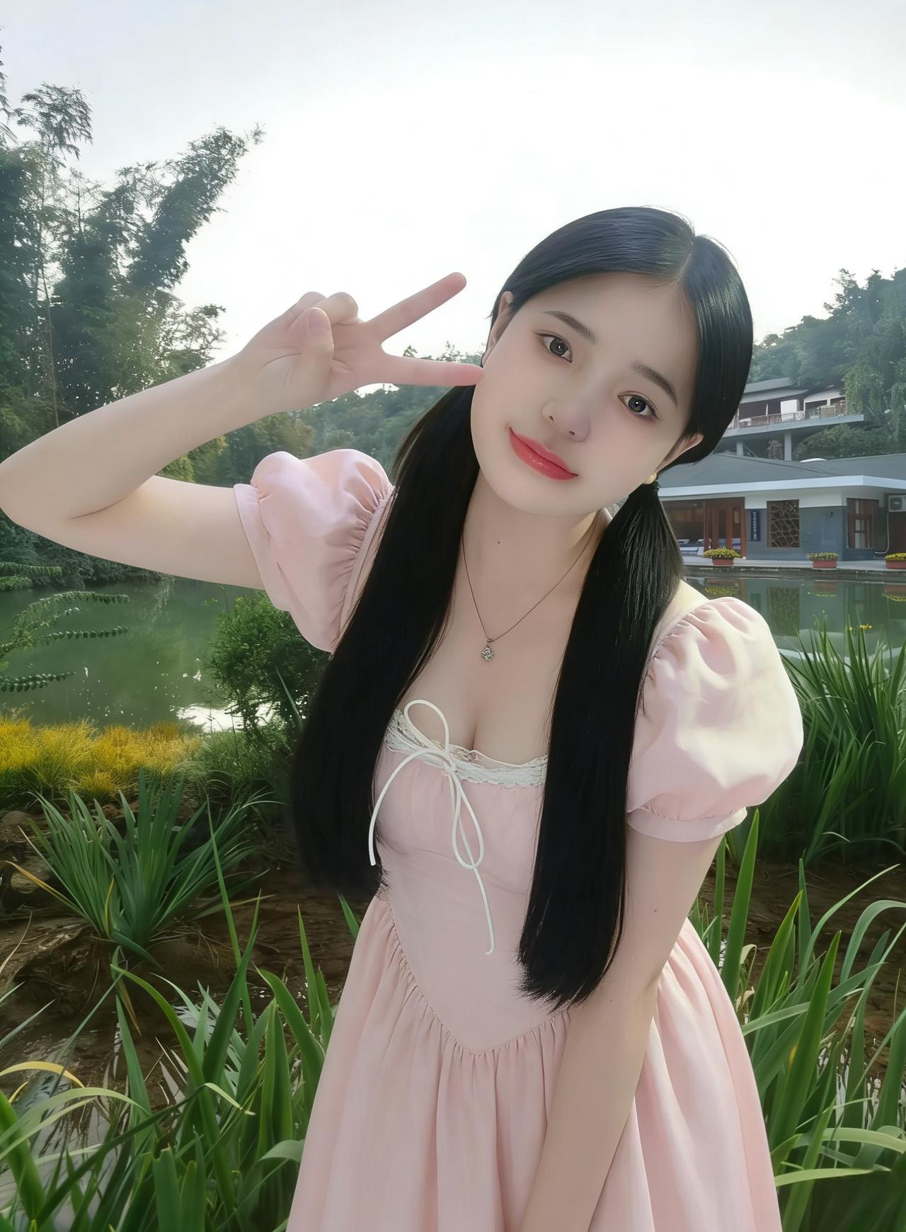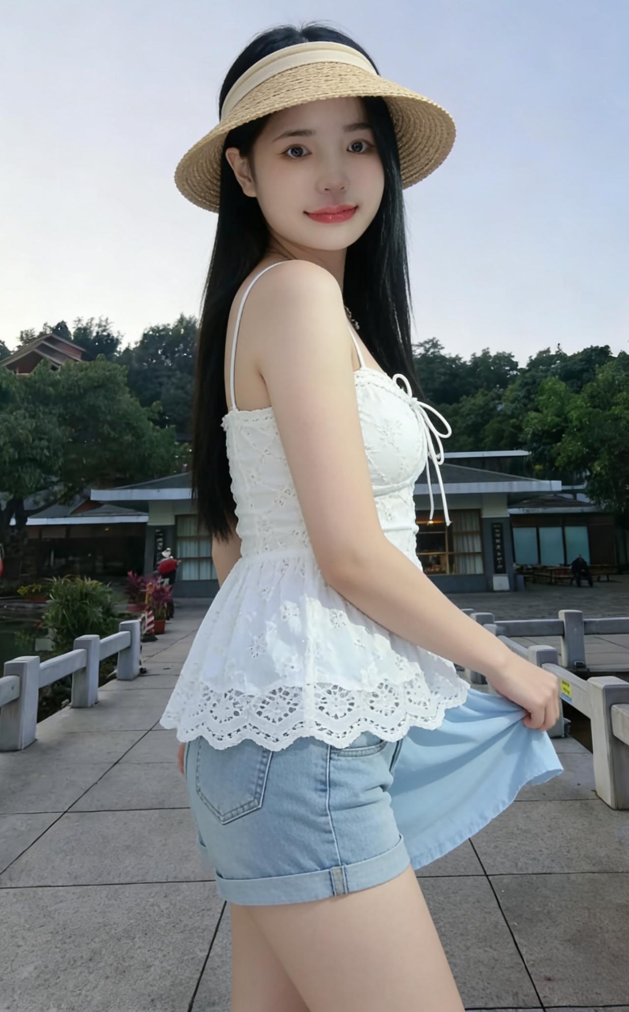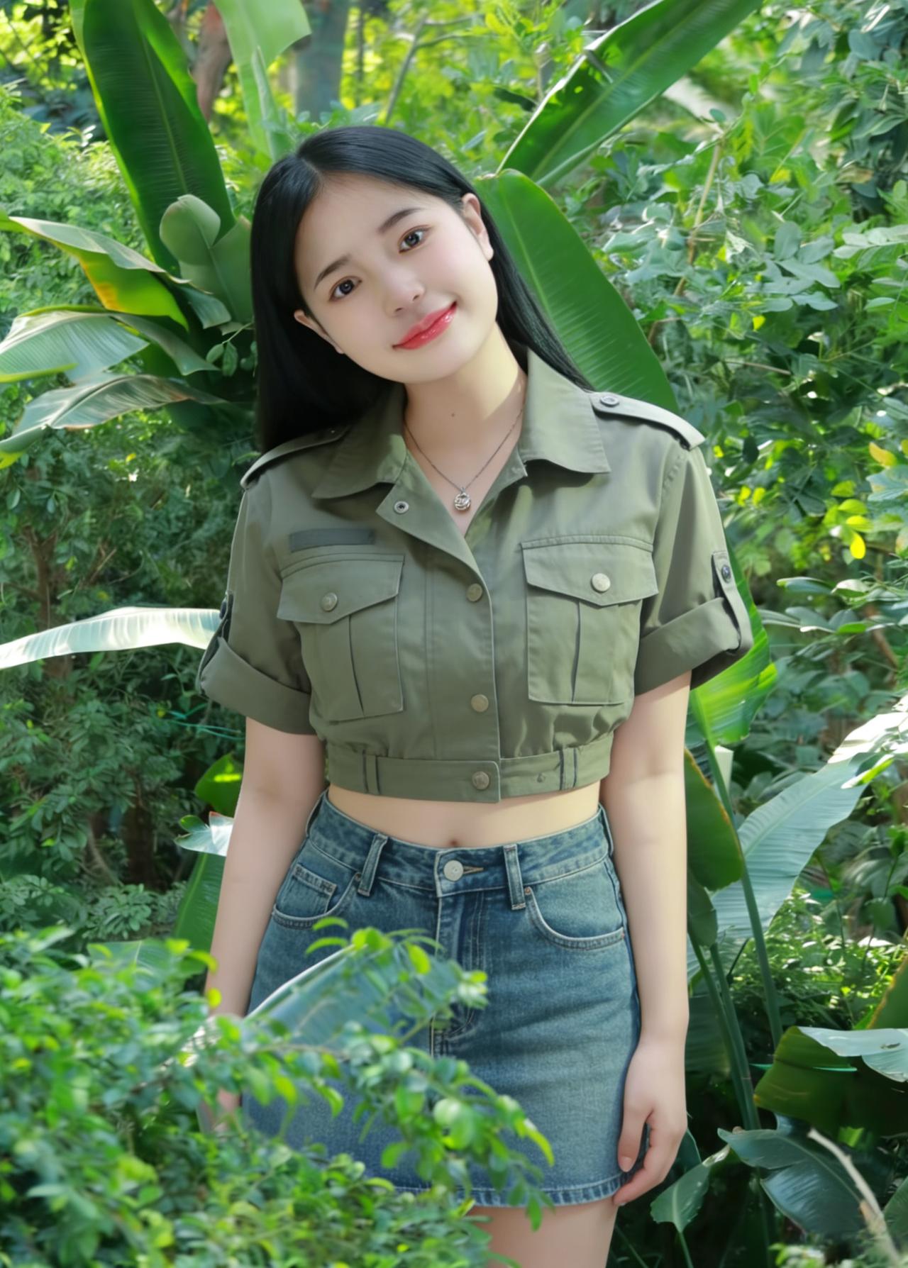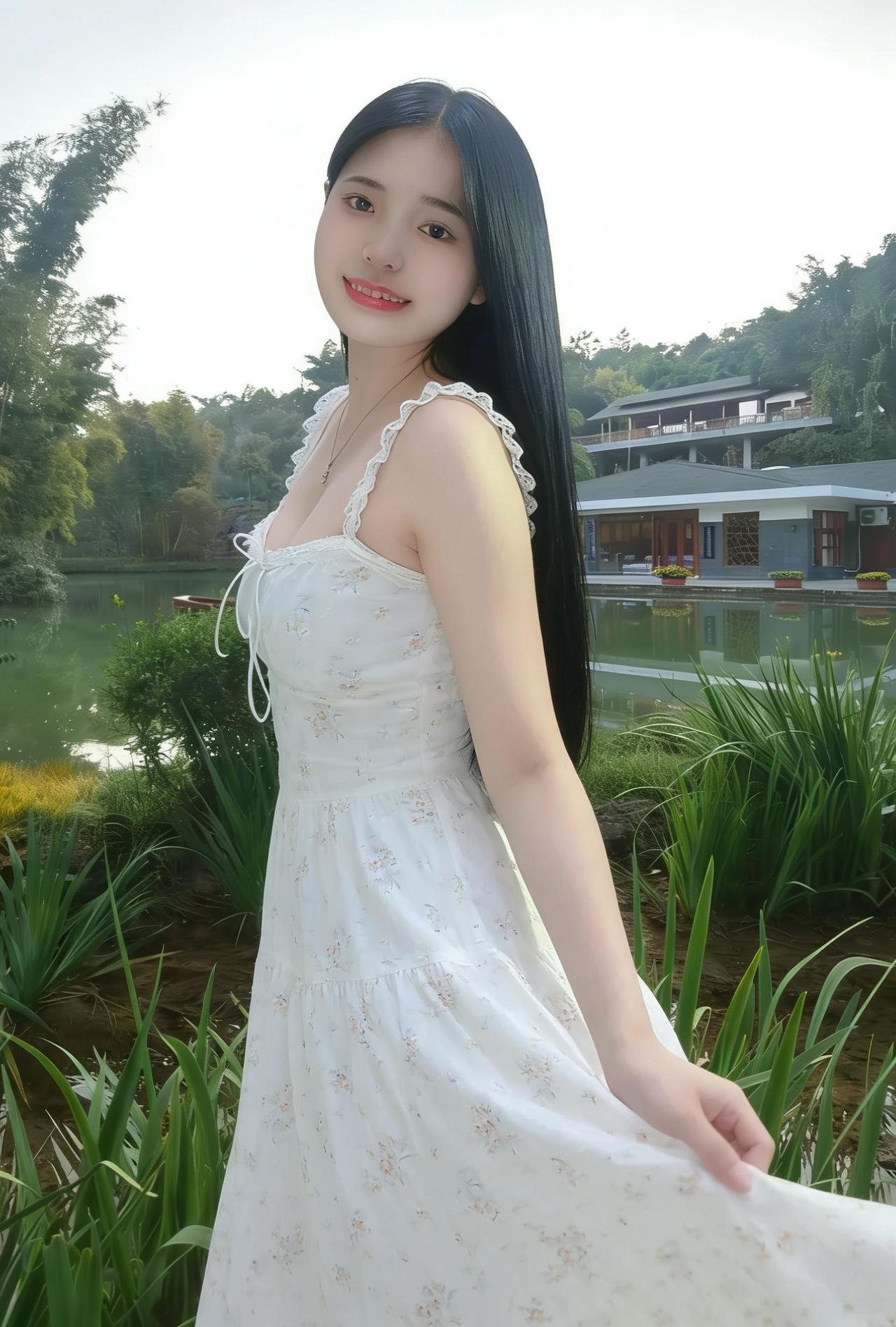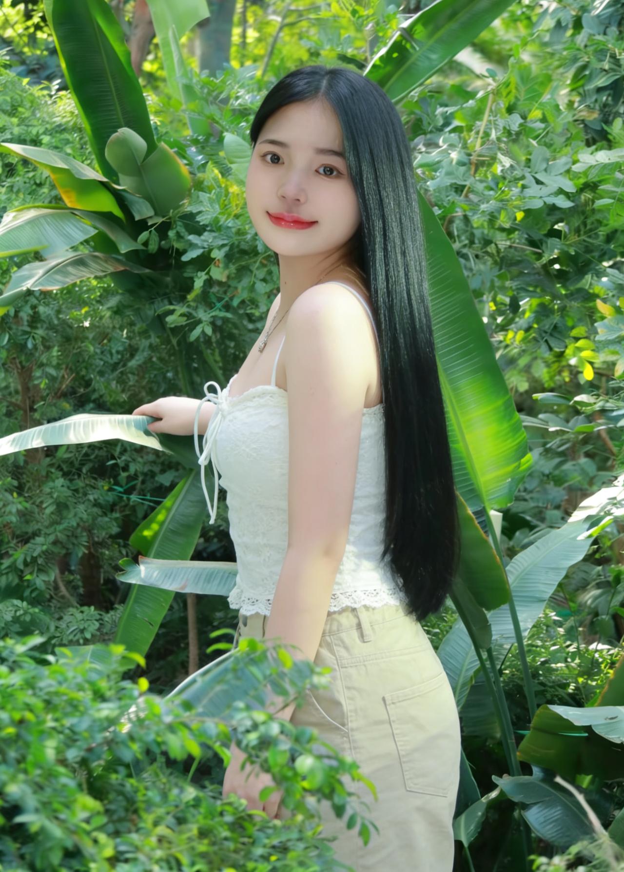 幽林藏秀色,玉立倚清光。 云袂裁云影,青丝覆雪霜。 明眸含远黛,素颈缀银珰。 不语心先醉,风轻韵自长。