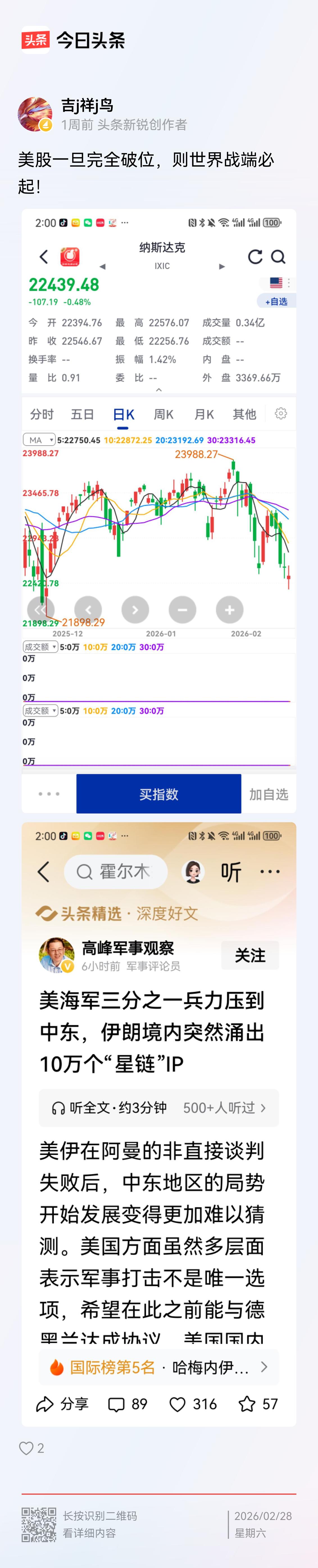 美以向伊朗开战了!重要的事情说三遍:美股如果完全破位,世界战端必起!美股一旦完全破位,则世界战端必起!美股一旦完全破位,则世界战端必起! 终于,在A股向上将实现4200点关口突破,而美股顶部呼之欲出之际,号称“和平总统”的特朗普坐不住了,在今天联合以色列发起了对伊朗的轰炸!为了中期选举的政治利益,为了美股不崩盘,为了重新控制中东产油区,为了在大国竞争中争取有利形势,特朗普孤注一掷,果断发动了战争。 美以能如愿吗?世人拭目以待!