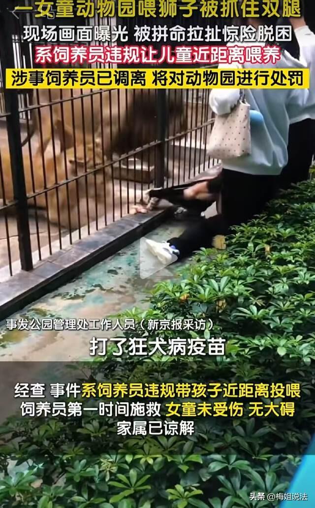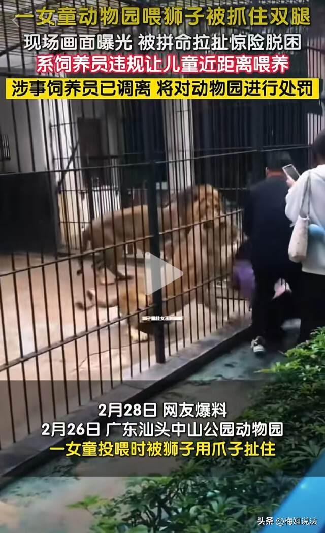 广东汕头,一女孩在动物园近距离投喂狮子,下一秒狮子突然伸爪死死抓住她的裤子,猛地往笼里拖!旁边男子拼死拽住女孩,与狮子展开近半分钟“人狮角力”。女孩吓得当场大哭,现场尖叫声四起。 2月26日,广东汕头中山公园动物园内,一名女孩正站在狮笼外,手里拿着食物准备投喂。笼子里三只狮子慵懒地趴着,看起来人畜无害。 下一秒,惊悚的一幕发生了。 一只母狮突然暴起,利爪闪电般伸出围栏缝隙,精准抓住女孩的裤腿,猛地往笼里拖拽!女孩瞬间被拉得一个踉跄,整个人差点贴上铁笼。 狮子一边拖一边撕咬裤子,喉咙里发出低沉的咆哮。 尖叫声瞬间炸开。 千钧一发之际,旁边一名男子(事后证实是饲养员)冲上前,死死拽住女孩的手臂,与狮子展开了一场惊心动魄的拉锯战。 狮子死不松爪,男子一边拖拽一边捡起地上的铁杆捅向狮子,试图逼它松口。 整整近半分钟,人狮角力。最终,女孩被成功拽回安全区域,当场吓得哇哇大哭,裤子已被撕破。 好好的女孩在动物园投喂怎么会被狮子袭击?如果不是旁边的饲养员死死拽住女孩的手臂,恐怕后果不堪设想。 原来事发区域为公园内动物园的狮舍,属于园方设置的“付费投喂项目”。 据工作人员推测,狮子是看到女孩手中的肉,伸爪去够,这才差点酿成人命关天的事故。 好在,小姑娘人没事。只是裤子破了,受到了惊吓,目前已经送到了医院去,且家属已经谅解了动物园。 目前该动物园因为存在安全隐患已经被要求停业整顿。 据悉,涉事的汕头中山动物园是私人动物园。位于中山公园内,门票30元。提供动物投喂互动项目,1.2米以下儿童及老人可免费入园。 也就是说,这个“付费投喂狮子”的项目,是明码标价、合法经营的。 这不禁让人困惑游客一旦在投喂时发生意外,法律上该如何划分责任呢? 《民法典》第一千二百四十八条规定:动物园的动物造成他人损害的,动物园应当承担侵权责任;但是,能够证明尽到管理职责的,不承担侵权责任。 也就是说,动物园承担的是**过错推定责任**——只要动物伤人,先推定动物园有过错,除非它能证明自己“已经尽到管理职责”。 在本次事件中,园方设置付费投喂项目,却让游客能近距离接触猛兽,围栏缝隙大到狮爪能伸出来抓人,显然没有尽到充分的安全保障义务。更关键的是,园方自己也承认“平时可以靠近投喂确实有不妥之处”,这等于自认管理有漏洞。 所以园区有不可推卸的责任。 但若园方设置了明显的警示标识(如“严禁伸手”“保持距离”)和工作人员劝阻,游客仍强行投喂,那游客自身需要承担一定责任。本案中,女孩是在付费投喂区域内正常投喂,没有明显违规行为,园方很难免责。 对于此事,您怎么看?欢迎留言交流。 作品声明:内容来源于杭州网 事件时间:2026—02—27 事件地点:汕头市