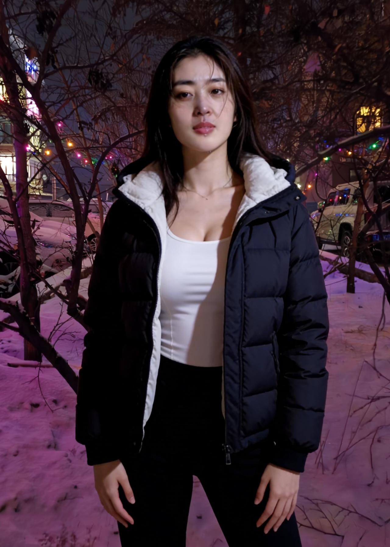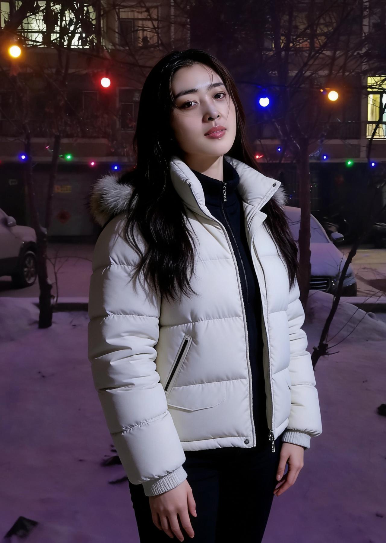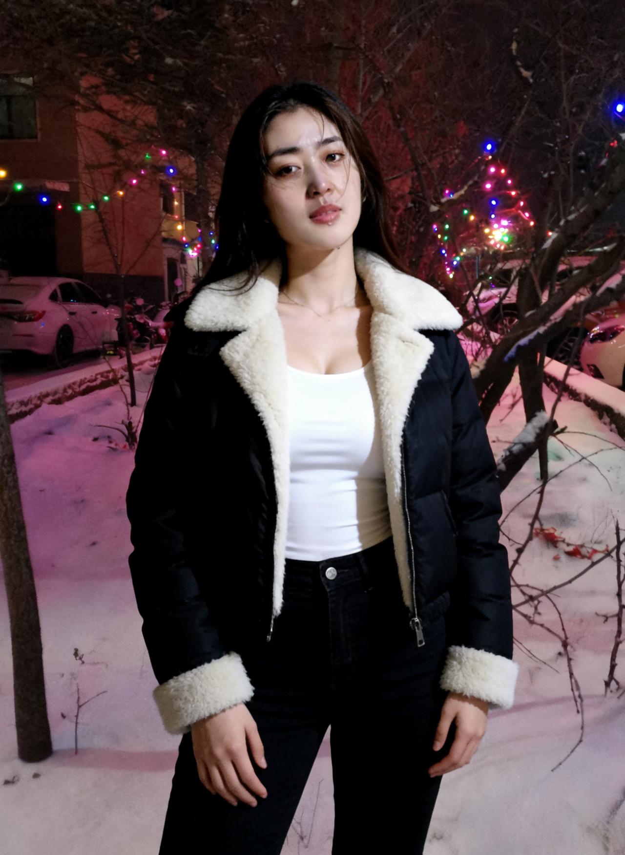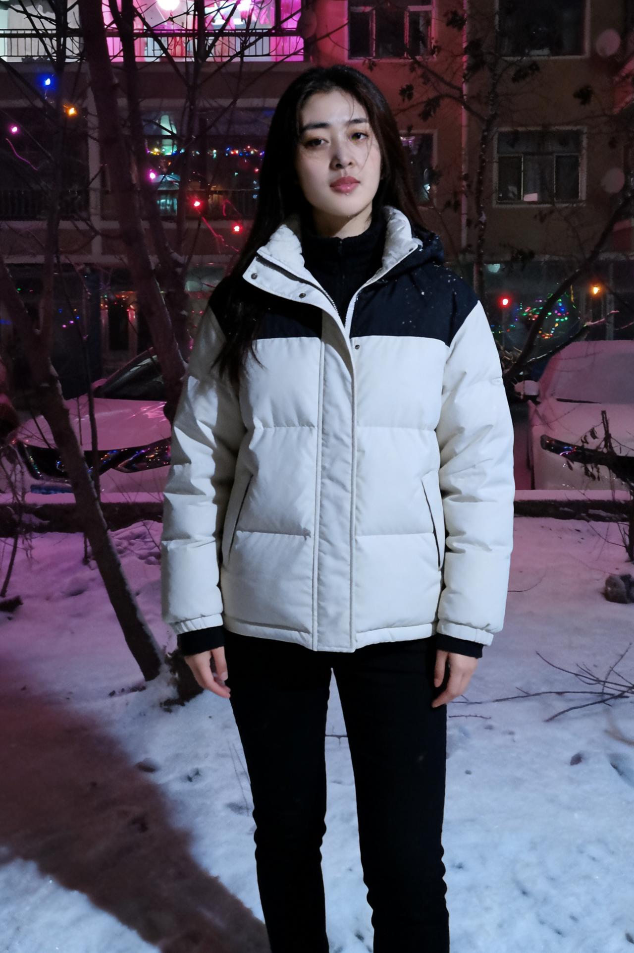 《夜色中,与她相逢》 我在小区的雪夜里慢行, 撞见一场无声的惊艳,撞碎了孤独的冰。 ~ 她站在光影的交汇处, 像雪藏的梅,忽然绽开在市井。 黑与白的衣袂,是冬的平仄, 她的眉眼,是平仄里最动人的韵。 ~ 身后是万家灯火的温, 身前是漫天风雪的冷。 她把冷暖揉进一身穿搭, 像把生活的甜与咸,都酿成从容。 ~ 彩色灯串在枝桠间跳动, 像撒落的星子,缀在她的背景中。 她的静默,不是疏离, 是与夜色和解的从容。 ~ 我走过她身旁,风停了一瞬, 雪粒落在肩头,像时光的吻。 小区的夜色因她而生动, 那些平淡的晨昏, 忽然有了值得珍藏的痕。 原来人间的美好, 从不是远方的星河, 是此刻,雪夜,灯明, 是她站在那里, 成为烟火人间,最温柔的印证。