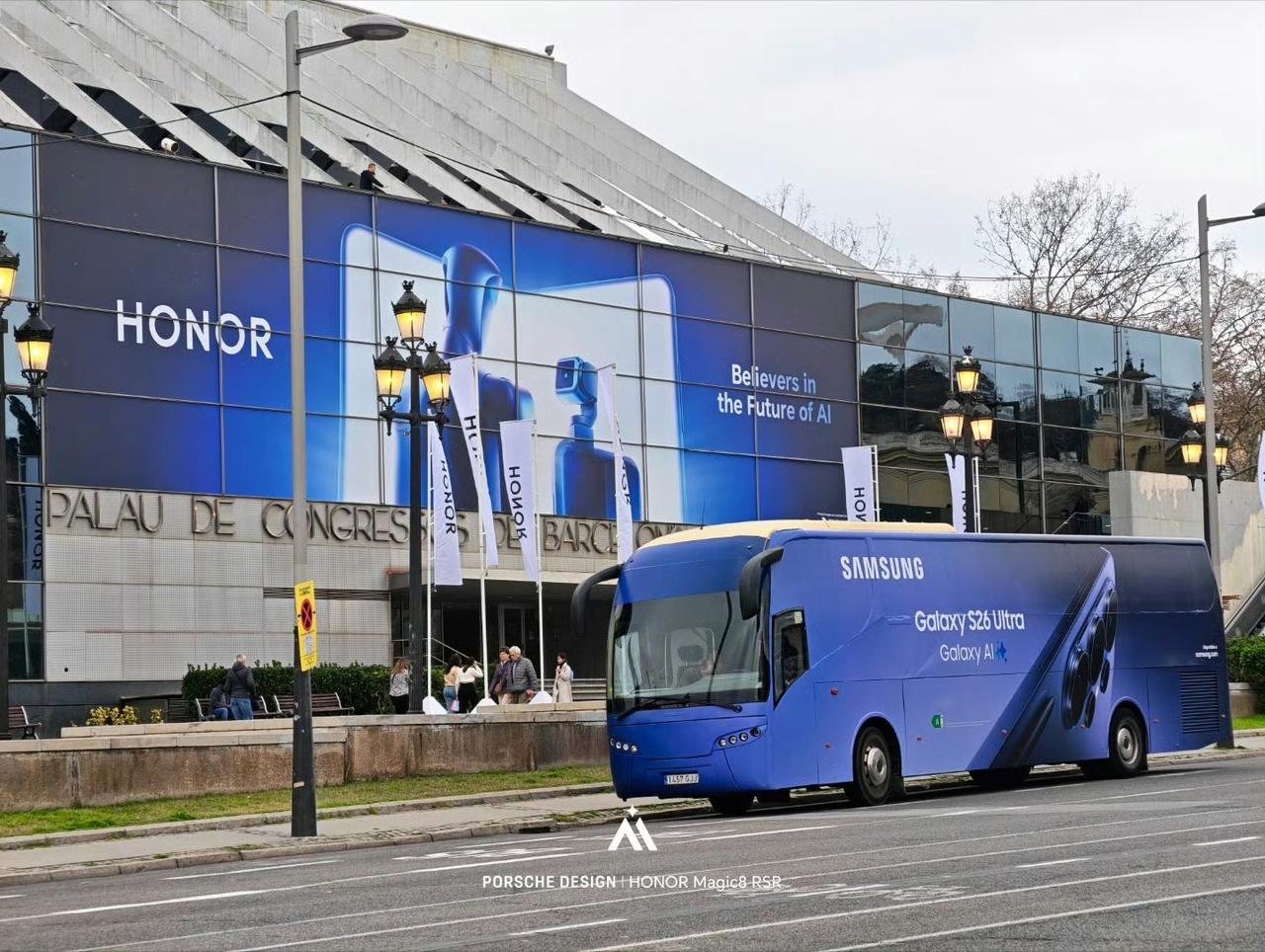 MWC名场面来了!三星宣传车在荣耀展馆附近疯狂绕圈,主打一个贴身盯防,这波骚操作
