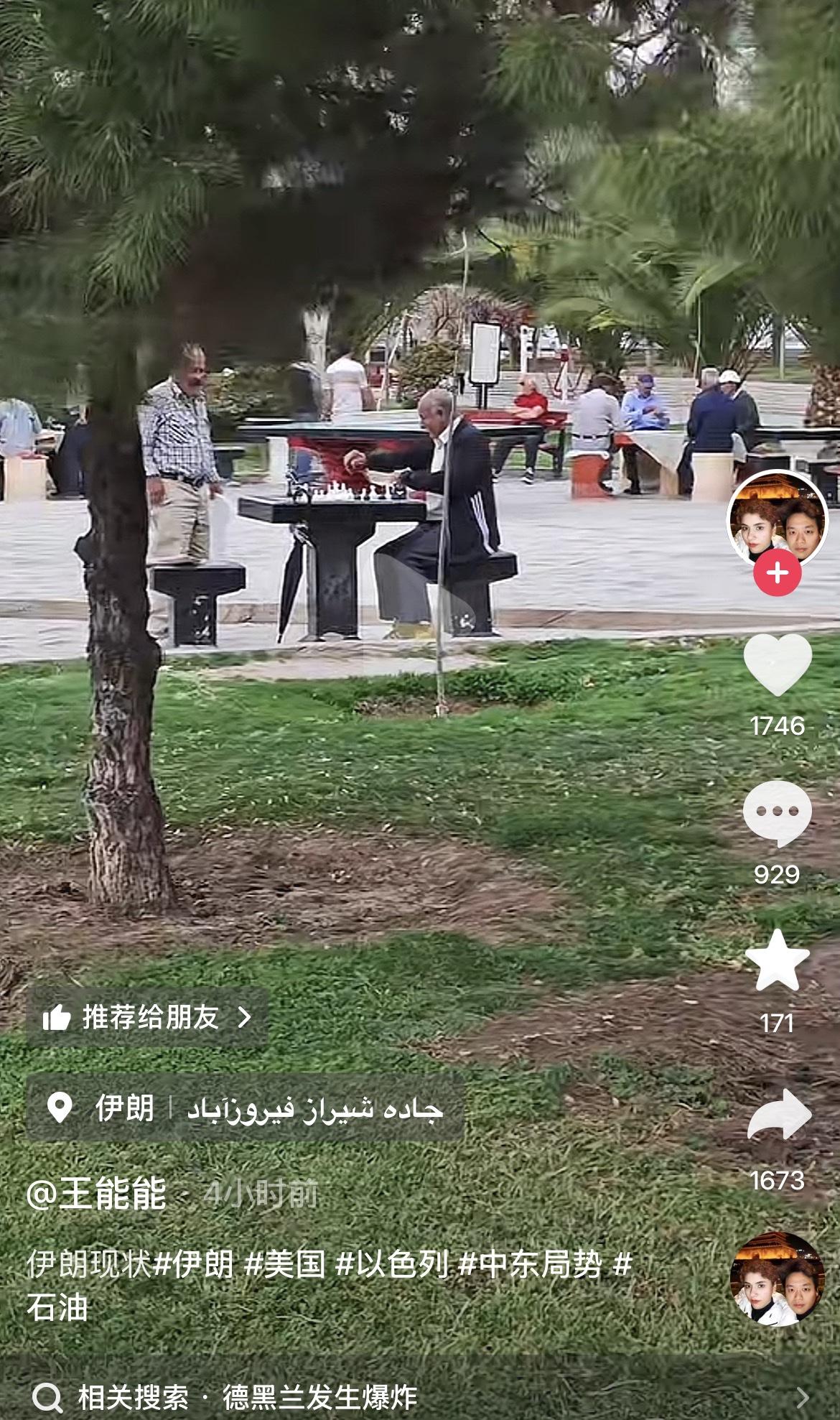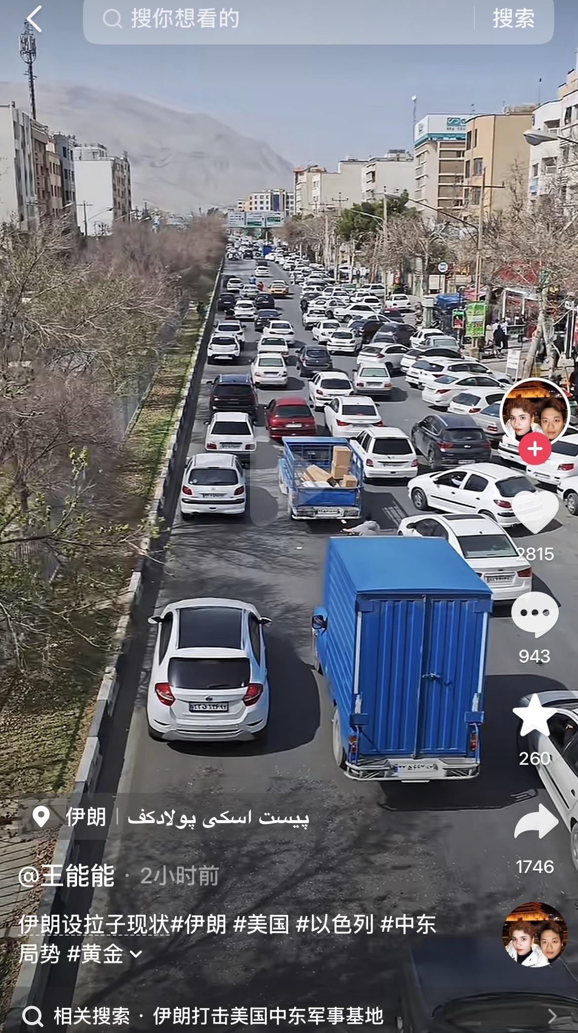 看在伊朗旅游的博主2个小时前的分享, 大街上商店都挺正常的, 公园里面琴棋书画也还在继续, 路上汽车是堵了些, 手机信号也是时断时续的。 博主还调侃说, 他们都不紧张, 你们紧张啥, 下面有网友评论, 紧张的都是炒股的…… 愿世界和平! 伊朗 美伊冲突是否会升级为全面战争