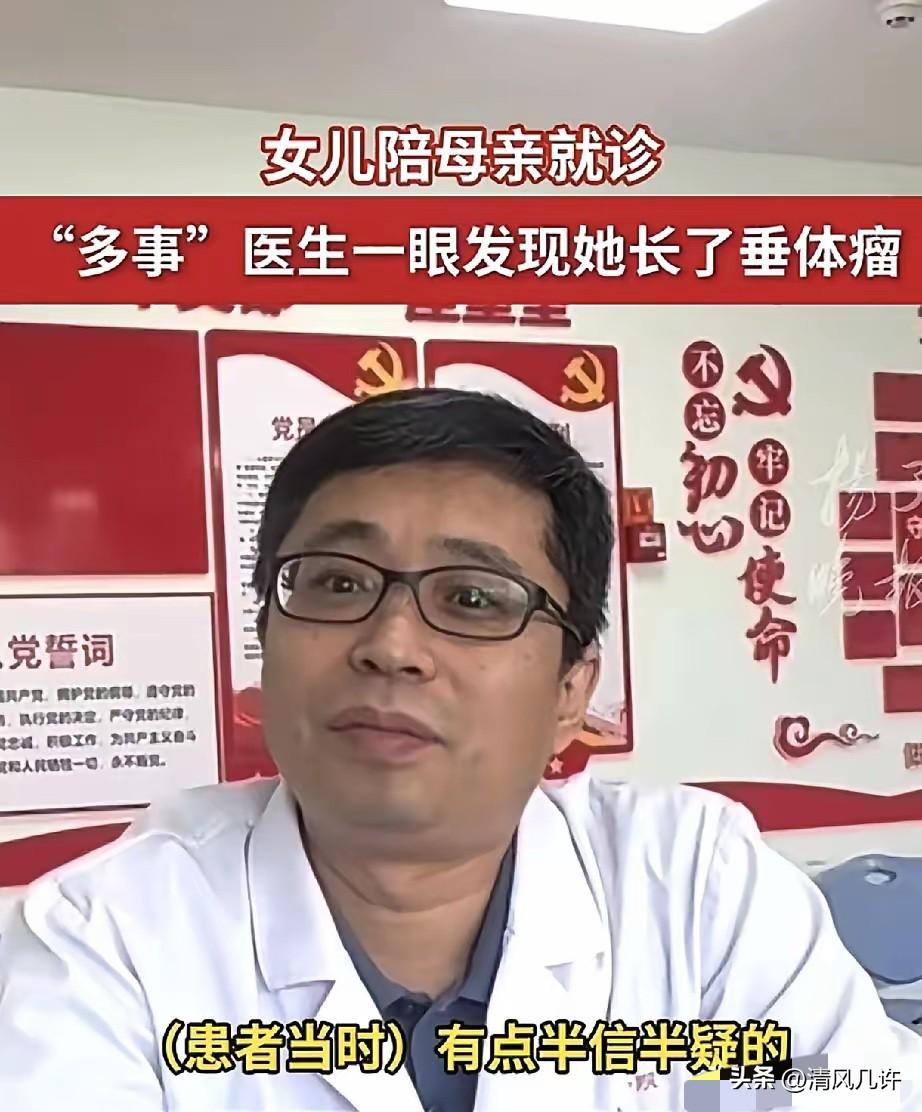 江苏苏州,一女子戴着口罩陪母亲看病,医生给老人看完说没事,目光却突然落在她身上。女子连脸都没露,医生仅凭她的眉骨,竟一眼看出她长了垂体瘤。见女子不信,医生直接说:你去查一下,要是正常的话,40块钱诊断费我报销! 这位女子是张女士,那天陪母亲来苏大附一院神经外科复诊,母亲的术后恢复情况一切正常,她全程安安静静坐在一旁,口罩遮了大半张脸,只露出眉骨和额头,连一句身体不适的话都没说。 神经外科副主任刘建刚给张母看完病历,习惯性扫过诊室里的每一个人,目光落在张女士露出口罩的眉骨上,突然顿住,喊住了准备起身离开的她。 张女士愣在原地,只觉得莫名其妙,自己既没挂号也没问诊,医生怎么会突然盯上自己。她扯了扯口罩,想把脸遮得更严实,心里满是疑惑,甚至觉得医生是不是看错了,或是随口找个由头搭话。 刘建刚没绕弯子,直接说出判断,眉骨突出的形态,是生长激素型垂体瘤的典型信号,建议她立刻去查生长激素,费用四十块,要是结果正常,这笔钱他私人报销。这话一出,张女士第一反应是觉得离谱,四十块钱不多,可被一个陌生医生说脑子里长了瘤,任谁都难接受。 她摆摆手想走,母亲也在一旁劝,说医生别开玩笑,张女士身体一直挺好,没任何不舒服的地方。刘建刚却很笃定,他见过太多因忽视身体细微变化拖到严重的病例,生长激素型垂体瘤的面容改变缓慢又隐蔽,朝夕相处的家人都难察觉,却逃不过长期积累的职业敏感。 张女士拗不过医生的坚持,也觉得四十块钱买个安心不算亏,转身去了抽血窗口。缴费时,她看见刘建刚跟在身后,直接在收费处刷了卡,动作干脆利落,没有半分犹豫。 抽完血等待结果的半小时里,张女士坐立难安,母亲攥着她的手,手心全是汗,反复念叨要是没事就好。她自己也忍不住回想,这两年总觉得眉骨越来越突出,脸型也变宽了,一直以为是年纪增长加上长胖,从没往疾病上想,甚至还跟朋友打趣说自己是“发福显壮”。 化验单一出来,张女士盯着报告单上的数字,瞬间僵住。 生长激素指标远超正常范围,足足超标十多倍。她拿着单子跑回诊室,刘建刚看完,立刻安排她做头颅磁共振,结果更清晰地显示,她的颅内长着一个直径1.2厘米的垂体瘤,正是生长激素型。那一刻,张女士红了眼眶,既后怕又庆幸,后怕自己一直忽视身体的信号,庆幸医生的一句提醒,让她没错过最佳治疗时机。 后续的治疗很顺利,刘建刚为她安排了神经内镜下经鼻蝶窦微创手术,不用开颅,创口小恢复快。 手术当天,张母守在手术室外,直到医生说手术成功,才瘫坐在椅子上长舒一口气。术后一周,张女士的生长激素指标就恢复了正常,眉骨的肿胀也慢慢消退,她终于明白,那些被自己忽略的面容变化,都是身体发出的求救信号。 这件事被张女士分享到网上后,迅速引发热议,网友纷纷为刘建刚的职业素养点赞。没人想到,这份火遍全网的“一眼识瘤”,并非偶然。 刘建刚从业二十余年,始终保持着对患者面容的细致观察,这早已不是第一次。三年前,他在面馆用餐时,留意到邻座年轻小伙的太阳穴和额头隆起、鼻唇肥厚,正是垂体瘤的典型特征。他主动上前表明医生身份,诚恳提醒对方检查,小伙最终确诊并成功手术,出院前还特意送来锦旗致谢。 刘建刚常说,医生的职责不只是治疗已出现的病症,更要捕捉那些未被察觉的隐患。 生长激素型垂体瘤会缓慢改变患者的面容,眉弓突出、鼻子变宽、嘴唇增厚、下颌前突,这些变化悄无声息,却能成为救命的线索。 他从不会因为对方是陪诊家属就视而不见,也不会因为对方的质疑就放弃提醒,四十块钱的诊断费,是他对自己职业判断的笃定,更是对生命的敬畏。 张女士康复后,专程带着锦旗去感谢刘建刚,锦旗上写着“一眼识瘤救性命,仁心仁术暖人心”。 她还把这段经历讲给身边的朋友听,提醒大家留意身体的细微变化,别像自己一样把疾病信号当成普通的身体变化。这件事也让更多人关注到垂体瘤这类“隐形杀手”,不少人主动去医院做相关检查,及时发现了潜在的健康问题。 城市里的医院每天都上演着生老病死,医生们见惯了病痛与离别,却依旧愿意为每一个陌生人多停留一秒,多问一句。 刘建刚的“多事”,不是多管闲事,而是刻在骨子里的医者仁心。那四十块钱的诊断费,看似微不足道,却成了一道守护生命的防线,让一个普通女子的人生,避免了被疾病拖入深渊。 后来,张女士的母亲逢人就夸女儿遇到了好医生,说要不是刘医生,现在还不知道是什么情况。 张女士也慢慢走出了确诊时的恐慌,开始重视健康管理,也学会了像医生一样,留意身边人的身体信号。她知道,这场偶然的相遇,不仅是自己的幸运,更是医者与患者之间最纯粹的温情联结。 各位读者你们怎么看?欢迎在评论区讨论。