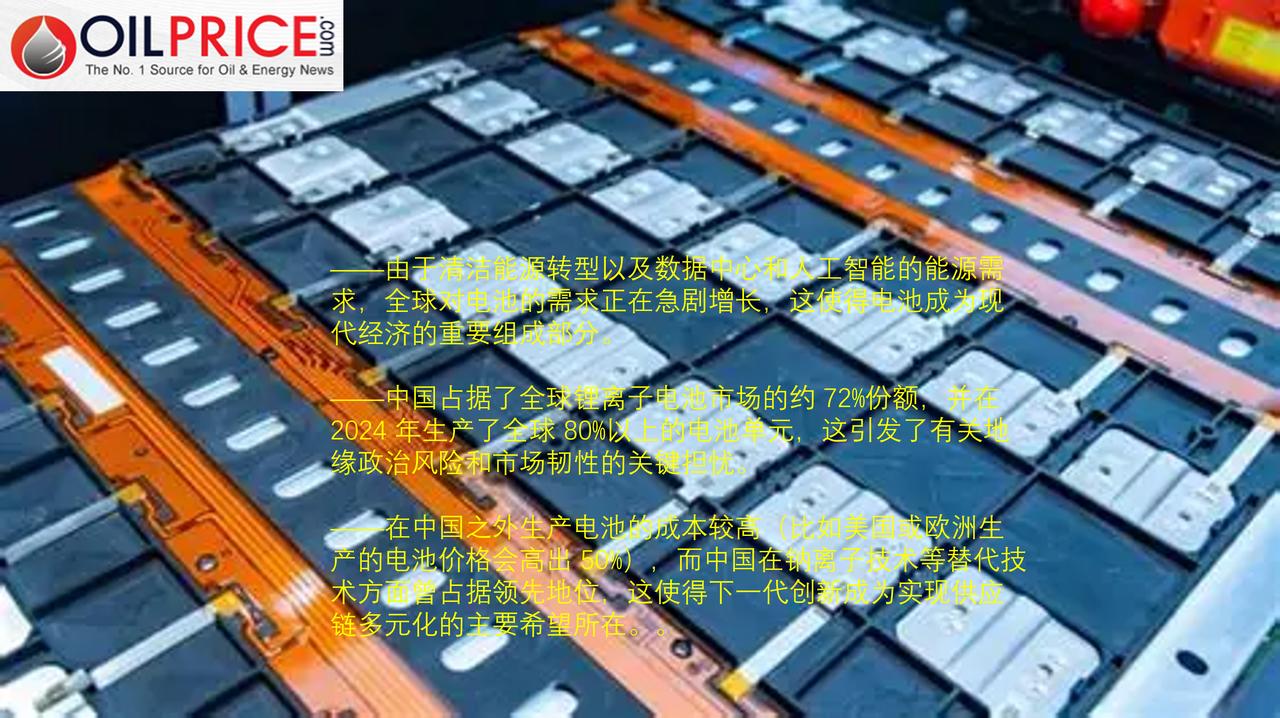 外媒认为电池技术革新是摆脱中国供应链主导地位的关键 全球电池市场正蓬勃发展,对新型及更优质电池技术的需求呈爆炸式增长,这一趋势受到清洁能源转型、数据中心和人工智能广泛应用的推动。在能源和科技行业能源需求激增的情况下,电池成为保障全球能源安全的关键备用能源来源。 国际能源署指出:“随着应用领域的不断拓展以及成本持续降低,电池正在成为现代经济的重要组成部分。” 估计2025 年,全球锂离子电池市场将超过 1500 亿美元,同比增长超过 20%,且在 2026 年这一增长趋势也不会放缓。 在这一新的需求热潮的推动下,对先进及下一代电池技术的研发投资大幅增加。2025 年,电池和储能领域的突破成为了能源技术创新的主导方向,这凸显出能源安全已成为能源开发者的主要关注点,其重要性超过了成本效益和脱碳问题。但具有讽刺意味的是,这场旨在加强能源安全的行动却可能给全球电池供应链带来严重的风险和不确定性。 国际能源署发布的一份新报告警告称,随着全球经济对锂离子电池的依赖程度日益加深,对极少数锂资源供应商的依赖程度也相应增加。其中,中国在供应链中占据主导地位。中国控制着全球锂离子电池市场约 72%的份额。更令人瞩目的是,2024 年,全球每 10 个电池单元中就有超过 8 个是在中国制造的。这些数据引发了有关地缘政治风险和市场韧性的关键问题和担忧。 多年来,中国一直在稳步且持续地增加并巩固锂资源的供应以及相关产品的附加值。最近的一篇《连线》杂志文章提到,像宁德时代、比亚迪、国轩高科和蔚来这样的中国领先电池制造商如今已成为全球电动汽车和能源系统的主要供应商。在很大程度上,其他国家试图与中国竞争的努力实在是力度太小、为时已晚。尽管世界上许多国家都在努力提升自身的电池生产能力,但他们仍然依赖中国作为主要原材料的供应方。 要在不向中国进一步施加巨大压力的情况下实现短期能源安全目标,这是一项规模巨大且至关重要的政治挑战。由于人工智能热潮导致的能源需求预测,正在重新塑造全球的优先事项,并使世界各国领导人处于两难境地,因为长期的能源安全战略已被眼前的能源安全威胁所掩盖。 国际能源署指出:“这种结构性失衡短期内不太可能得到改变。”其提及的是中国在电池制造领域的巨大经济和工业优势。“要解决这一问题,就需要大幅增加投资,并在电池产业链的各个环节加强国际合作。” 问题在于,在中国生产电池的成本实在太低了,所以在其他地方生产这些产品似乎都是不明智之举。即便有政策手段来激励和补贴国内的锂离子供应链,美国或欧洲生产的电池价格仍要比中国生产的高出 50%。 所以,如果在锂资源方面世界无法超越中国,那是不是就可以完全放弃所谓的“白色黄金”——用于清洁能源技术的锂资源呢?当前电池技术的创新热潮中,很大一部分都聚焦于这一迫切需求。但这并非易事,因为锂是一种非常实用、价格低廉且能量密度高的材料。但它也有其缺点。除了供应链不足之外,锂的开采和提取还会对人类和环境的健康与福祉造成重大威胁,并给有限的水资源带来巨大压力。 目前有许多替代电池的原型正在不同的研发阶段,每种都有其自身的优点和权衡之处。设计种类繁多,有的极具未来感,如量子电池;有的则非常普通,如泥土电池。一种很有前景的替代品是钠离子电池,它有可能使市场更加多样化,并创造一个在地理分布上更加均衡的竞争环境。钠价格低廉、储量丰富,且比锂更节水。而且几乎随处都能获取。但有一个问题——中国也已经占据了这个市场的主导地位。