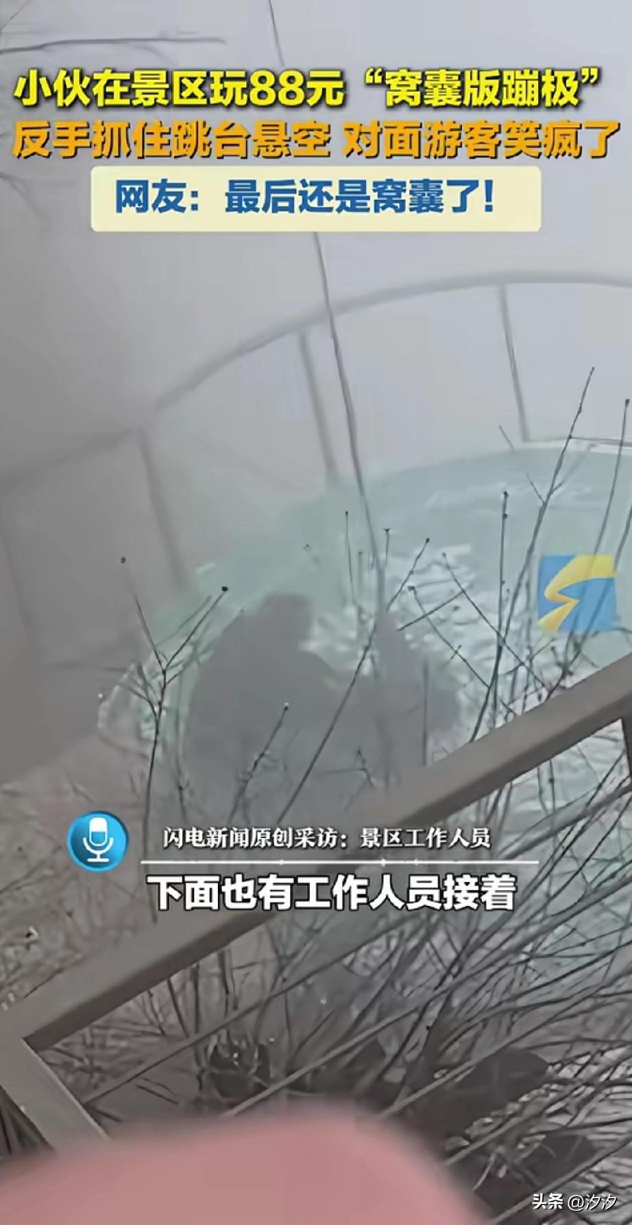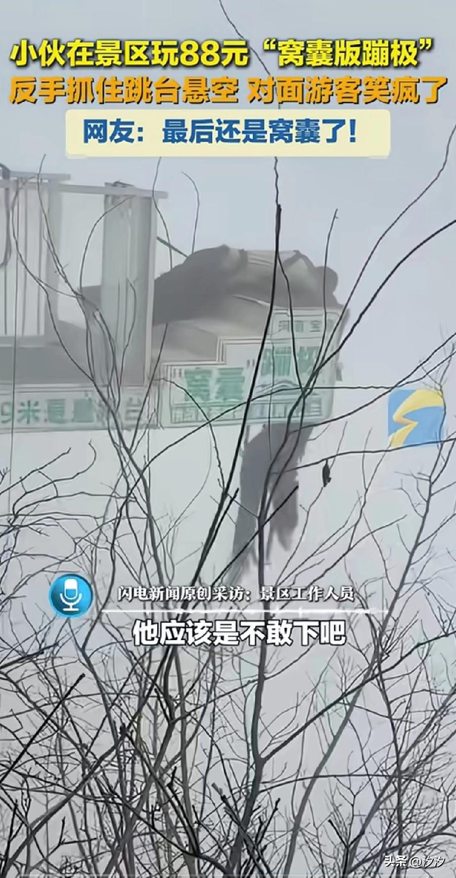 男子在新乡的一个景区, 花了88元玩窝囊版蹦极, 因为太过害怕, 被工作人员给推了下去, 小伙子扒着跳台, 求生欲极强, 把对面的游客都逗笑了, 但是实际上绳子是慢慢放下去的, 只是站在上面感觉非常高, 觉得非常吓人而已, 实际上过程一点都不害怕, 人也是慢慢落地的, 下面还有工作人员来接, 可以说还真的是窝囊般的蹦极!