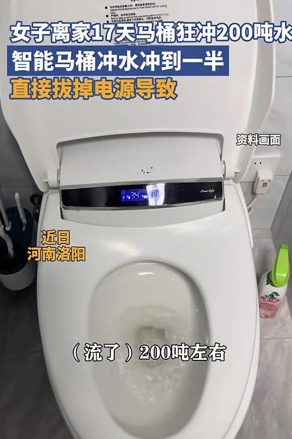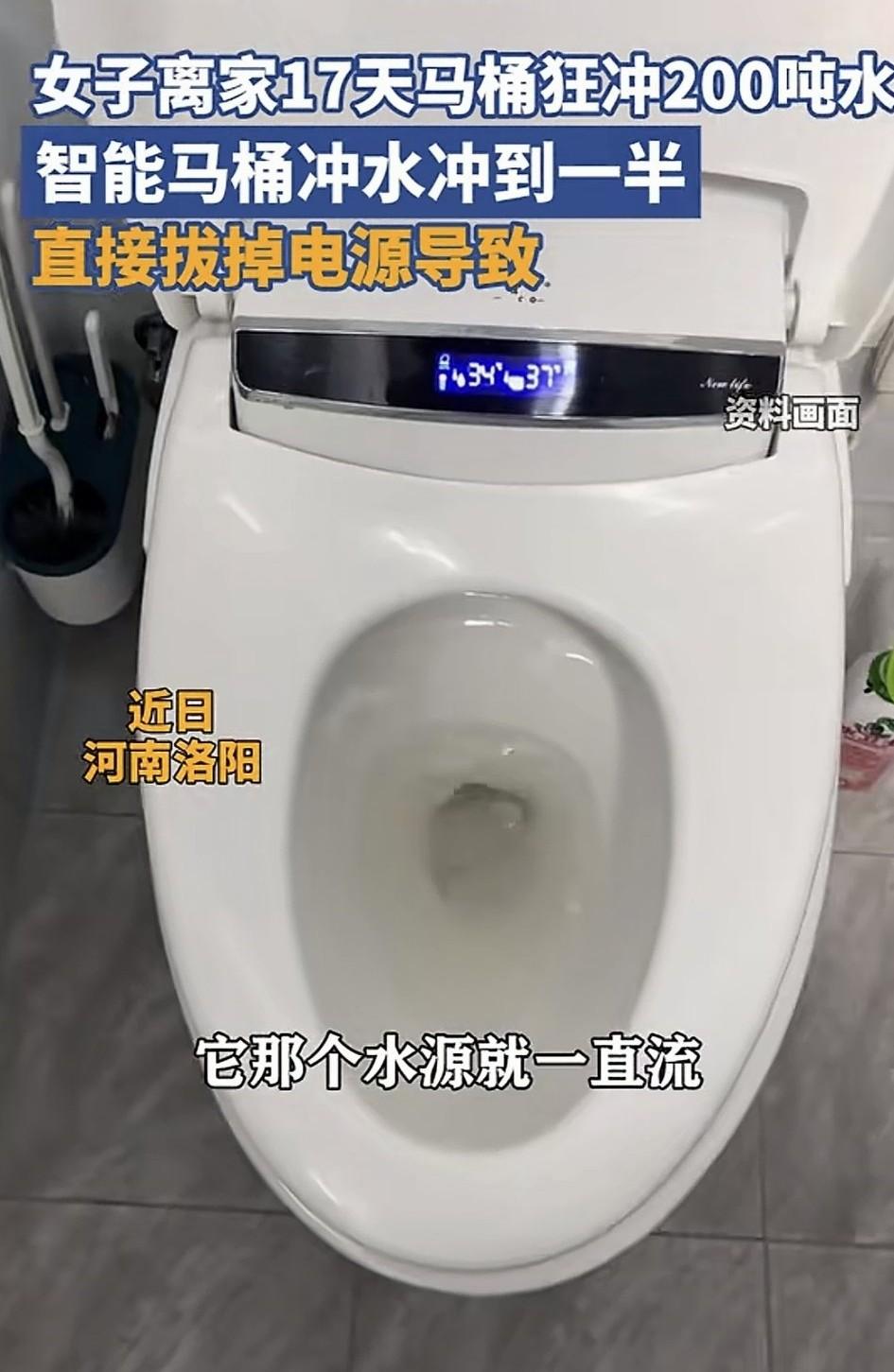 大意了!河南洛阳,一女子春节期间离家17天,回家后发现,竟因自己离家前上个厕所,智能马桶水还没冲完,女子就拔掉了马桶电源,导致其阀门未复位,让马桶连续冲了17天的水。最终耗水超200吨,合计水费840元。 据女子描述,当时离家时就上了一个卫生间,可着急走,马桶冲水冲到一半的时候,女子就把拔掉了电源走了。可让她没想到是,正是这个操作使得马桶一直处于冲水状态。 期间她也接到自来水公司的电话,说是她家一天用了十几吨的水,但女子还在外面也无法及时回家查看情况,于是就将这事搁在那了。 直到女子17天后回来才发现,原来是马桶没日没夜的流了17天水。而这期间大概用了200吨左右的水,水费差不多4块2一吨,合计840元左右。 对此有网友就表示:我今年也差点犯这个错误了,当时本来已经把智能马桶电源关了,临走老公要上厕所,又打开电源,上完厕所冲水,刚冲完就关了电源,结果发现水一直在流。于是我们又赶紧把电源重新打开,等水不流了,再把电源关闭了。不然就肯定是女子这种情况了。 还有网友表示:我们每次出门久的话,都要把水阀关上,不用的电器插头拔了,断水电气,只留冰箱一个单独闸没关,不是怕浪费钱,怕的是一周没人在家出意外。不过话说回来,自来水公司倒是很人性化,还知道给户主打电话,这个必须点赞。 不得不说,女子真是大意了,庆幸只是马桶冲水,这要是下水道堵了水淹了屋子,不但自己遭殃,这楼下也得跟着遭殃,到时候损失就更大了!所以正如网友所说,为了避免安全隐患,提醒大家出门必须得做到三断:断水、断气、断电!