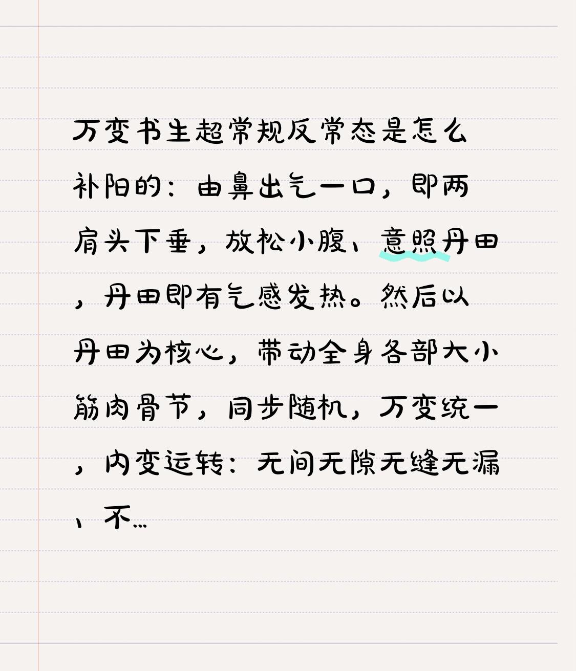 万变书生超常规反常态是怎么补阳的: 由鼻出气一口,即两肩头下垂,放松小腹、意照丹田,丹田即有气感发热。 然后以丹田为核心,带动全身各部大小筋肉骨节,同步随机,万变统一,内变运转:无间无隙无缝无漏、不停断不分节不断档,团屈磨贴滚扭相聚,天地旋转万物归一。(骨节齐鸣) 更妙的是:大动不如小动,小动不如蠕动,蠕动不如不动,不动之动才是生生不己之动! 比如站桩:外形不动如木桩然,内里生生不己之动。 又如躺桩:(动中之静是真静)静中之动是真动。 在意识结构中完全对功夫的训练和对疾病的治疗。