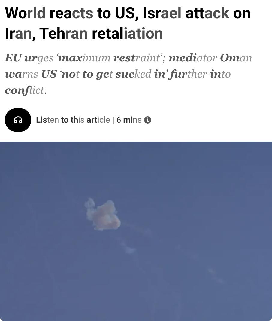 外媒:美以联合袭击伊朗引发全球紧张反应。 2026年2月28日,美以对伊朗发动"重大作战行动",打击其导弹工业和海军设施,特朗普呼吁伊朗人民推翻其政府;伊朗则报复性袭击以色列及卡塔尔、阿联酋、巴林、科威特等驻有美军的海湾国家,称美以的资产均为合法目标。 欧盟敦促各方保持最大克制,法国要求联合国安理会紧急开会。阿曼作为调停方警告美国勿进一步陷入冲突。中俄呼吁立即停火恢复谈判,挪威批评以色列违反国际法,乌克兰则指责伊朗政权暴力镇压抗议是冲突根源。