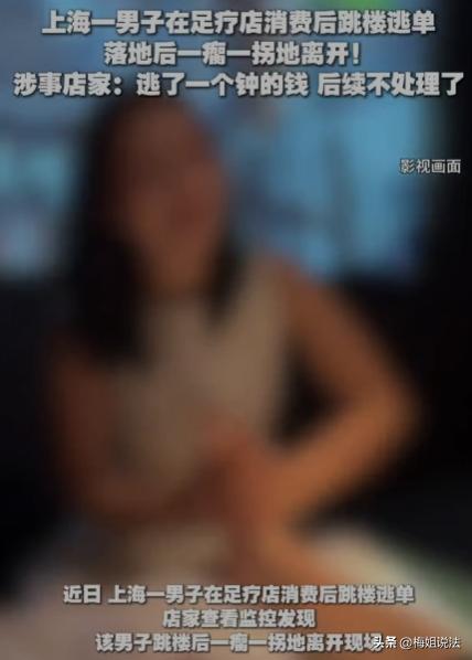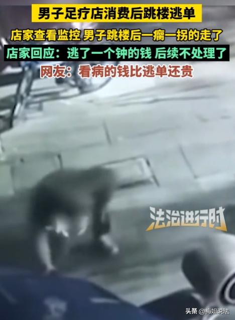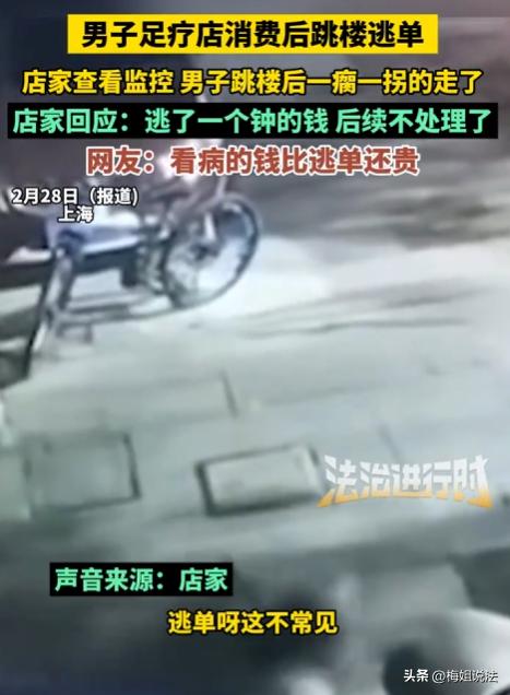 上海,一男子去足浴店消费,一个钟的服务结束后,不想付钱竟直接跳楼逃单,落地受伤后一瘸一拐逃离。店家调监控发现后,考虑到男子已受伤,后续不想再追究。此事在网上引发热议,网友纷纷调侃男子得不偿失。 好好的消费,付完钱走就行了,偏要搞这一出。 没人知道他那天是怎么想的,大概率是消费完,一算账,觉得不划算,又不想掏钱。 他是独自去的足浴店,没跟朋友一起,进门之后,店员热情接待,问他要什么服务。 他挑了一个常规项目,价格不算贵,就是市面上常见的那种。 挑好之后,负责服务的技师就领着他进了包间,包间不大,环境也一般,就是普通足浴店的样子。 技师按流程操作,他也没提任何异议,偶尔还会应一声技师的询问。 一个钟六十分钟,说快不快,说慢不慢,不知不觉就到点了。 技师停下手里的活,跟他说服务结束了,让他到前台结下账,然后就拿着工具离开了包间。 技师走后,包间里就剩他一个人,他没起身去结账,反而在房间里坐了好一会,估计是琢磨来琢磨去,还是不想付钱,竟生出了逃单的念头。 他起身走到包间的窗户边,看了看外面的情况,足浴店在二楼,不算太高,但也绝对不算低。 换做正常人,就算再不想付钱,也不会想到跳楼。 他倒好,心一横,直接翻窗跳了下去。 落地时,他自己也没站稳,重重摔在地上,疼得龇牙咧嘴。 缓了好一会儿,他才慢慢爬起来,一瘸一拐地,不敢停留,赶紧朝着远处跑了。 生怕被店家发现,抓个正着。 技师离开包间后,过了十几分钟,还没见他出来,以为他还在休息,就去敲门。 敲了好几下,里面一点动静都没有,技师有点慌了,赶紧喊来店家。 店家过来,用力推了推门,门是开着的。 走进包间一看,人没了,窗户大开着,风呼呼地往里面灌。 店家第一反应就是人跑了,逃单了,赶紧去调店里的监控,想看看人往哪跑了。 监控一调出来,所有人都看懵了。 清清楚楚拍到他翻窗、跳楼、落地受伤、一瘸一拐逃离的全过程。 店员都很生气,辛辛苦苦提供了服务,结果遇到这么个无赖,还搞出跳楼这么一出。 有人提议报警,把他抓回来,让他付账,还要赔偿店里的损失。 店家却摆了摆手,说算了。 看着监控里他一瘸一拐的样子,估计伤得不轻。 店家也是心软,觉得他已经受了伤,就算找到他,他可能也没钱付账,反而还要扯皮,索性就不追究了。 这事后来被店里的员工发到了网上,没想到一下子就火了。 网友们看了之后,大多是调侃他,说他这是赔了夫人又折兵,太得不偿失了。 有人说,就算足浴费再贵,也比不过医药费,这一跳,少则几千,多则几万,纯属脑子不清醒。 也有少数人说,店家太心软了,这种逃单的人,就该追究到底,不然以后还会有其他人效仿。 我看这事的时候,也觉得挺荒唐的。 但荒唐归荒唐,男子逃单,到底违不违法?店家不追究,他就真的不用承担任何责任了吗?他自己跳楼受伤,店家有没有责任? 男子逃单的行为,肯定是违法的。他去足浴店消费,和店家之间就形成了服务合同关系。 根据《民法典》第577条规定,当事人一方不履行合同义务或者履行合同义务不符合约定的,应当承担继续履行、采取补救措施或者赔偿损失等违约责任。 简店家提供了足浴服务,他就有义务支付相应的费用。 他不想付钱,还逃单,就是不履行合同义务,构成了违约。 就算店家不追究,他的违约行为也是事实,店家随时可以要求他支付消费费用。 根据《治安管理处罚法》第26条规定,强拿硬要或者任意损毁、占用公私财物的,处五日以上十日以下拘留,可以并处五百元以下罚款;情节较重的,处十日以上十五日以下拘留,可以并处一千元以下罚款。 他这种逃单行为,虽然金额可能不大,但本质上是故意逃避支付费用,属于占用店家的服务而不付款,要是情节严重,比如多次逃单,就可能被认定为寻衅滋事,面临治安处罚。 他是单次逃单,店家又不追究,大概率不会被拘留罚款,但费用还是要付的。 跳楼是他自己的选择,店家没有强迫他,也没有过错,所以他的受伤,只能自己承担后果,跟店家没关系。 但足浴店的窗户,只要符合安全标准,就没有问题。 他是为了逃单主动跳窗,责任全在他自己。 其实这事就是逃单后店家不追究,当事人是否还需要承担法律责任的问题。 目前,店家不追究,只是放弃了自己的追偿权利,但不代表当事人的违法行为就消失了。 店家可以不找他要账,但要是店家哪天后悔了,照样可以起诉他,要求他支付消费费用,法院也会支持店家的诉求。 像这种逃单行为,要是次数多了,反复逃单,就可能构成寻衅滋事罪,面临刑事处罚,就像有的案例里,多次吃霸王餐、逃单,最后被判刑的。 为了省一点足浴费,冒着受伤的风险跳楼,最后不仅可能要付医药费,还要承担法律责任,真的太不值了。 大家觉得,店家不追究的做法对吗?如果是你,遇到这种逃单的人,会选择放过他,还是追究到底?男子这种行为,该不该被处罚?