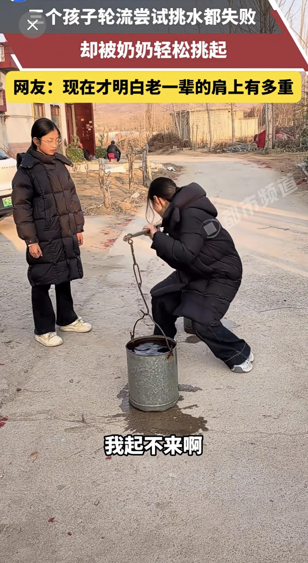 三个孩子轮流尝试挑水都失败,却被奶奶轻松挑起。网友:现在才明白老一辈的肩上有多重。