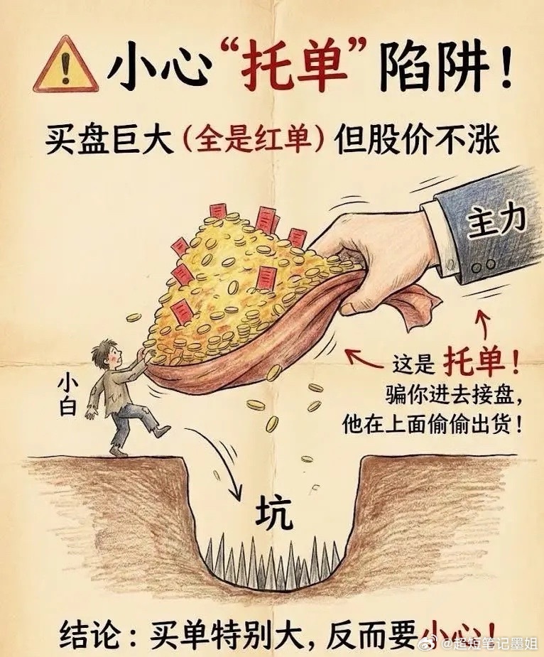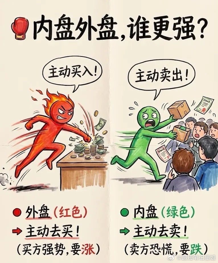 1. 盘口就是排队窗口。卖一到卖五,是想高价卖的人(柜台里的货)。买一到买五,是想低价买的人(门口排的队)。2. 外盘代表冲动,内盘代表恐慌。外盘大:说明买的人等不及了,直接按卖价抢货!这是真爱(利好)。内盘大:说明卖的人吓坏了,直接按买价砸盘!这是跑路(利空)。3. 买单大不一定是好事。如果你看到买盘挂着巨单(托单),股价却不涨。小心!那是主力请的“托儿”。他在下面假装接着,其实是在上面偷偷出货。口诀:外盘大于内盘,股价可能要涨。内盘大于外盘,股价可能要凉。买单巨大不涨,主力多半在装!存下来,盘中对照着看!
