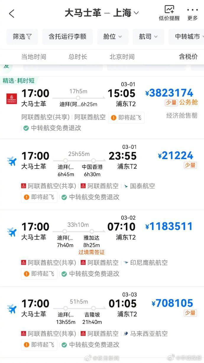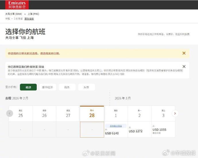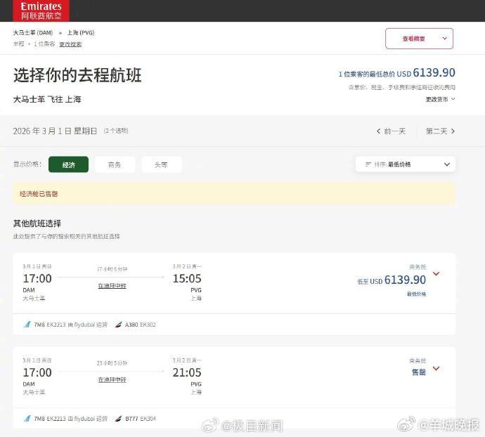 【购票平台大马士革飞上海机票涨至382万元?平台目前已无“天价机票”】#平台下架大马士革飞上海天价机票##知情者称382万天价机票系操作失误#2月28日,有消息称,有购票平台显示,当地时间17时从大马士革飞往上海浦东机场的航班,票价涨超382万元。28日晚,记者搜索发现,上述平台已无大马士革飞往上海浦东机场的“天价机票”售卖,而在阿联酋航空官网上,3月1日仍有2趟航班执飞,目前经济舱已售罄,可购买的最低价格为6139.9美元。据媒体报道,针对“当地17时起飞、售价超382万元”的航班,相关知情人士解释称,此类情况多为供应商后台人工操作录入价格失误,导致前端展示出现异常。“如果是真的高价票,肯定会让业务尽快下架,避免影响用户和舆论。”该人士同时强调,票务平台上的机票价格由供应商自行录入和销售,差价由供应商赚取,票务平台仅为展示和交易撮合平台,不会因此获益,也“没必要冒着风险去给供应商导流”。2月28日晚,极目新闻记者已向相关平台反映此事,暂未获回应。28日晚8点半,记者在该平台上搜索发现,已无叙利亚至北京、上海、香港等城市机票。半小时后,记者再次搜索发现,平台又出现了大马士革去往上海的机票,但只有土耳其航空一家航司,价格最高为1.6万余元。记者在阿联酋航空官网上搜索发现,2月28日已没有可购买的机票,3月1日仍有大马士革飞上海的两趟航班执飞,目前经济舱已售罄,可购买的最低价格机票为商务舱,售价为6139.9美元。记者注意到,3月2日和3日的经济舱机票尚未售罄,价格分别为1272、1055美元。#以色列宣布袭击伊朗##安理会应中俄要求紧急开会##伊朗一小学遭袭51人死60人伤##据称伊朗革命卫队总司令和防长身亡##伊朗称导弹击中美军舰#(极目新闻)(编辑:郑宗敏;审签:谢杨柳)