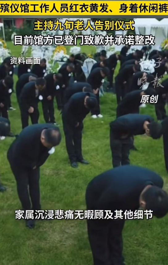 “你这样礼貌吗?”家中九旬老人离世,本是万分悲痛的肃穆时刻,殡仪馆工作人员却穿着大红衣服、染着黄发主持老人的告别仪式!宾客:“工作人员的着装与仪容,是对告别仪式严肃性及逝者的严重冒犯!”馆方:致歉并承诺整改! 事情发生在淮安市淮安区殡仪馆,2月25日清晨,不少亲友专程赶来,为一位九旬老人送别最后一程。 现场满眼都是黑白挽联,每个人脸上都带着悲戚,连空气里都飘着不舍,谁也没料到,一个突兀的身影打破了这份肃穆。 一名女子走进告别大厅,身上穿的不是贴合场合的素色衣物,而是一件亮眼的红色羽绒服,搭配休闲牛仔裤,一头披肩黄发格外扎眼。 起初有人以为她是鲜花店的工作人员,直到她拿起话筒,大家才惊觉,这竟是这场告别仪式的主持人。 前来送别的市民曹政,看着眼前的场景满是不解,在寄托哀思的场合,红色本就象征喜庆,与现场的悲戚氛围格格不入。 再加上随意的黄发和休闲装扮,没有半分殡葬服务应有的庄重,完全不像一个从业十年的老员工该有的样子——后来大家才知道,这名女子是殡仪馆的劳务派遣人员。 曹政随手拍下两张照片,简单配文后发到社交平台,没想到很快引发全网热议,网友们一致指责,这样的着装和仪容,不仅冲淡了哀悼氛围,更是对逝者的轻慢和冒犯。 说白了就是“没眼色”,连最基本的职业敬畏心都没有,更有人直指,问题根源在殡仪馆的管理疏漏。 而沉浸在丧亲之痛中的逝者家属,起初压根没注意到这个细节,老人离世后,全家上下乱作一团,整场丧事都委托给了丧葬一条龙服务,只顾着悲伤,根本无暇顾及其他。 直到看到网上的照片,家属才意识到问题的过分,但念及老人已经顺利入土为安,最终选择不再追究。 事件曝光后,淮安区殡仪馆很快作出回应,承认此事属实,坦言是节后员工思想松懈,加上馆方管理不到位所致。 据悉殡仪馆六七年前曾统一发放过一次工作服,后来因财政问题,就再也没有配发过,即便有明确的仪容仪表要求,也没能监管到位。 随后殡仪馆领导班子带着当班工作人员,登门向家属诚恳致歉,还公布了一系列整改措施:召开全馆作风建设会议,修订仪容仪表管理规定,明确禁止鲜艳服饰、奇装异服和怪异发色,成立监督小组常态化巡查,杜绝此类事件再发生。 一场本该庄重的告别,因一时疏忽引发争议,也给所有殡葬从业者提了个醒:敬畏职业,尊重逝者,从来都不是一句空话。