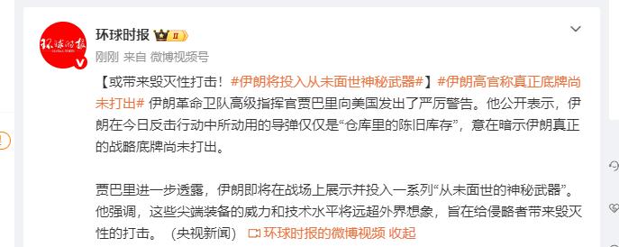 伊朗要放大招了吗? 伊朗革命卫队总司令顾问贾巴里准将表示,伊朗很快将展示“你们前所未见的武器”。另外他还表示目前正在用的仅仅是“仓库里的陈旧库存”。 很多网友看到后纷纷表示支持伊朗,希望伊朗这次强硬起来,要不然的话以后估计就没有机会了。 当然了伊朗到底有没有这样的神秘武器,估计也只有他们自己知道,也有很多网友怀疑是不是伊朗吓唬以色列的。 其实伊朗要是真有这样的神秘武器就应该直接使用,还等到什么以后再用,要是被以色列打残废了估计想用都用不了。毕竟是以色列先对他们动手的,自己有神秘武器还不拿出来用,真是让人替他们着急。 也有网友表示根据伊朗的条件,神秘武器应该是神秘国家给他们的,要不然在上次以色列打他们的时候就应该使用了。所以到底有没有就让人拭目以待了。 其实,自从今天以色列开始空袭伊朗以来,伊朗也开始第一时间反击,根据伊朗的报道称,伊朗的反击已经造成美军至少200人死伤。还有就是美军基地的一个雷达被打掉。要真是这样的话,那么伊朗还是很可以的,毕竟他们面对的可是美国和以色列。
