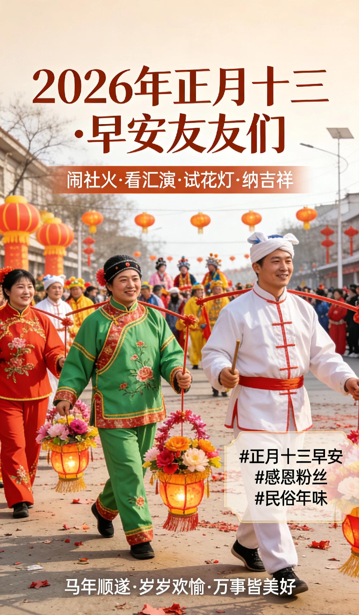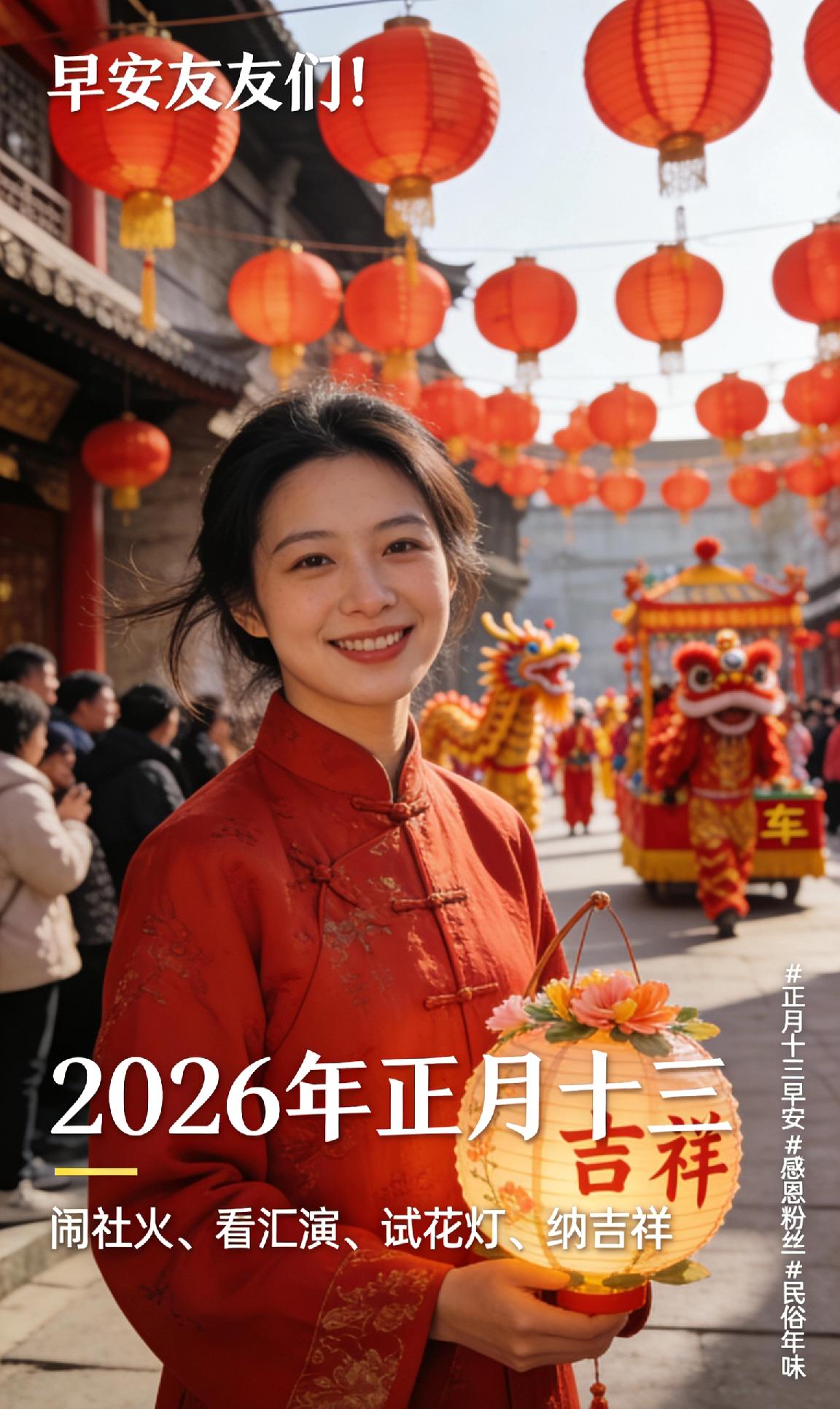 早安友友们!正月十三,闹社火、看汇演、试花灯、纳吉祥。年味未散,温情常伴,愿新晨新气象,好运天天有,平安喜乐不缺席。感谢大家的陪伴与支持,马年顺遂,岁岁欢愉,万事皆美好! ✨正月十三早安 感恩粉丝