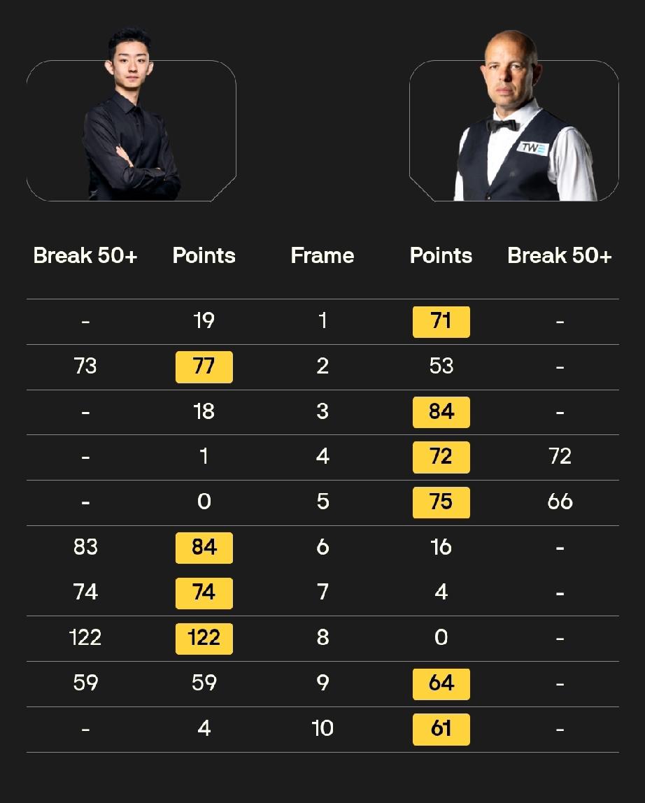吴宜泽:“那个黑球太可惜了!” 吴宜泽打出一杆破百四杆50+大比分4-6不敌巴里霍金斯,无缘威尔士公开赛决赛。赛后接受采访,吴宜泽表示: “输掉比赛感觉不太好,我本有机会5-4领先。赢的几局我打得很好、得分很强。” “第九局打黑球时突然失去专注,失误给了对手机会。关键就是细节和关键球。” “有时打球前没充分考虑,不够稳健,这是要改进的地方。” “这周整体表现不错,有遗憾但这就是体育,犯错就要付出代价。” “那个黑球太可惜了,不然可能结果不一样。”