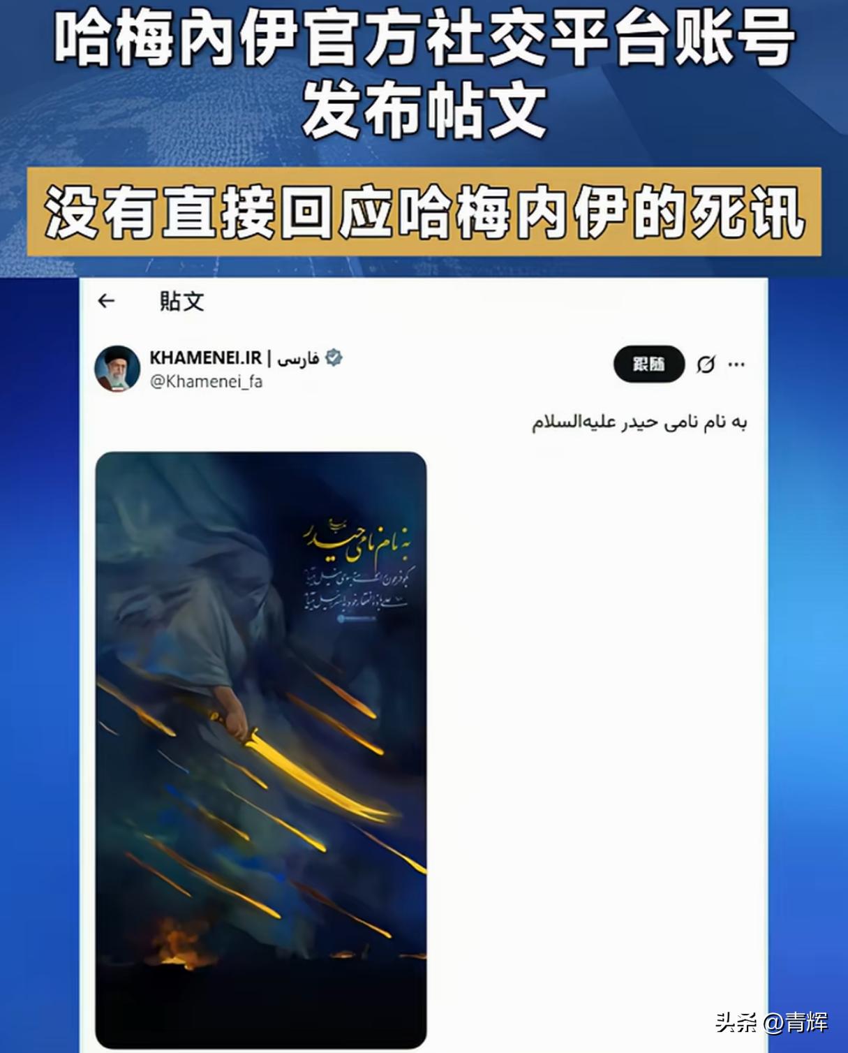 核心事件进展,哈梅内伊社交帐号更新动态:愿他平安 在以色列和美国都宣布已经干掉哈梅内伊8个小时以后,我们注意到哈梅内伊的社交帐号更新了一条动态。不过这条动态并没有直接回应哈梅内伊现在的具体情况,只是用了一张AI生成的图,然后写着愿他平安。 评论几句:目前的情况是以色列和美国一口咬定哈梅内伊已经被自己干掉了,而且说的有鼻子有眼!伊朗方面坚决否认,声称自己的最高领袖已经转移,并且仍然在正常的指挥战局,还说很快将会发布演讲。不过一直到现在为止,哈梅内伊本人的镜头无论在室内还是室外,确实没有公开露面。其实站在伊朗的角度上来看是可以理解的,毕竟如果哈梅内伊确实尚在人间的话,这个时候一旦露面极有可能会被美伊联军精准锁定,反而风险更大。 再说一下这次哈梅内伊社交帐号更新的这条内容,正常内容不仅不会澄清传闻,反而让情况变得更加扑朔迷离。尤其是“愿他平安”这4个字更是让人联想翩翩!这是不是表示这位伊朗的最高领袖现在虽然尚在人间,但受了重伤呢?