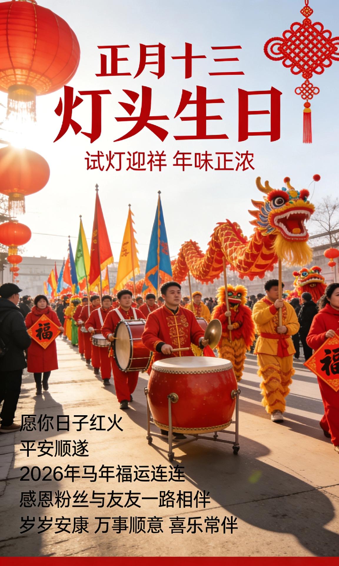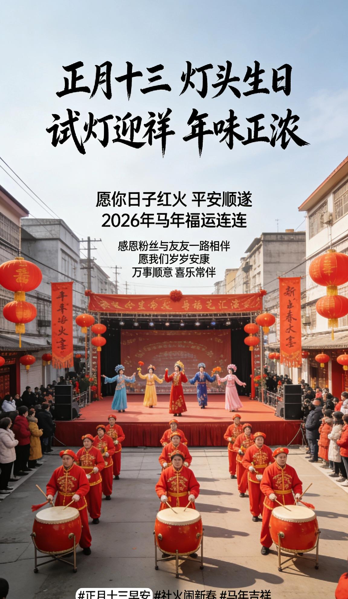 早安!正月十三,灯头生日,试灯迎祥,年味正浓。锣鼓喧天闹社火,文艺汇演庆新春,大街小巷喜气洋洋。愿你日子红火,平安顺遂,马年福运连连。感恩粉丝与友友一路相伴,愿我们岁岁安康,万事顺意,喜乐常伴! ✨正月十三早安 社火闹新春