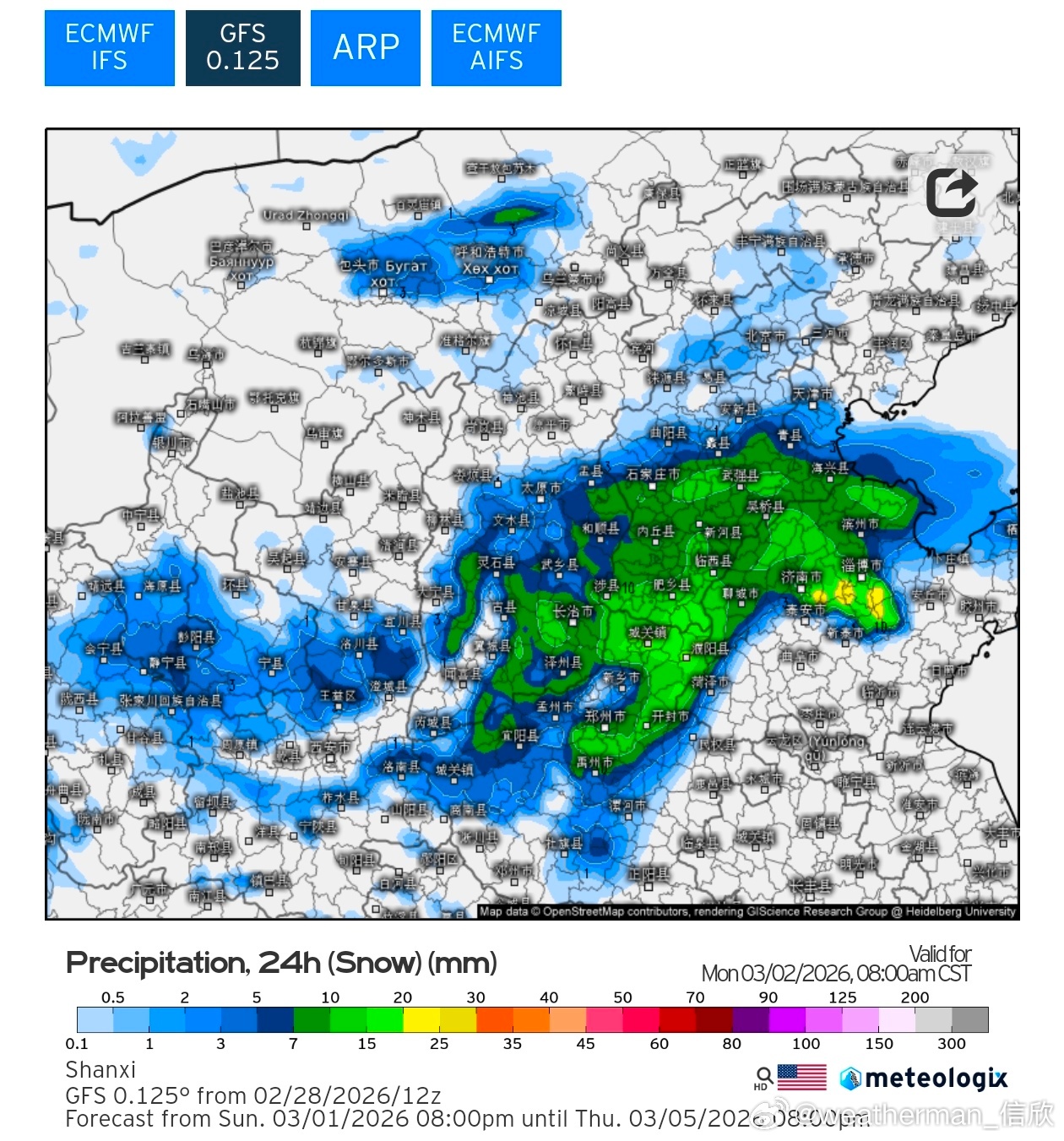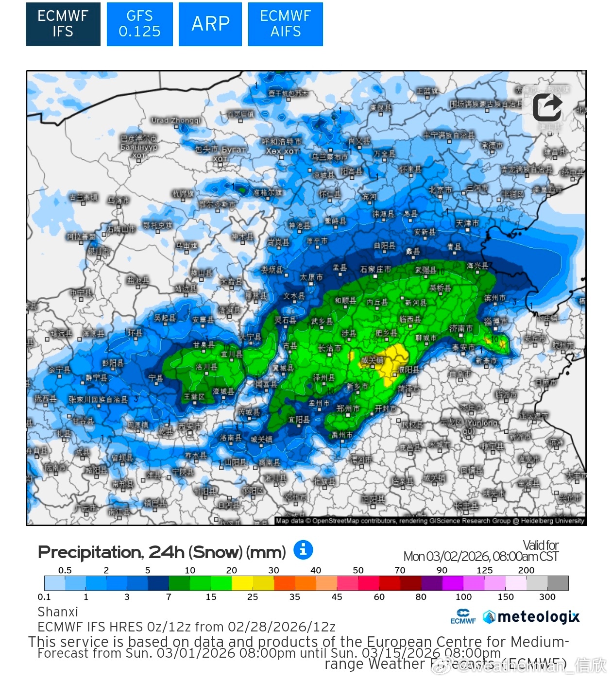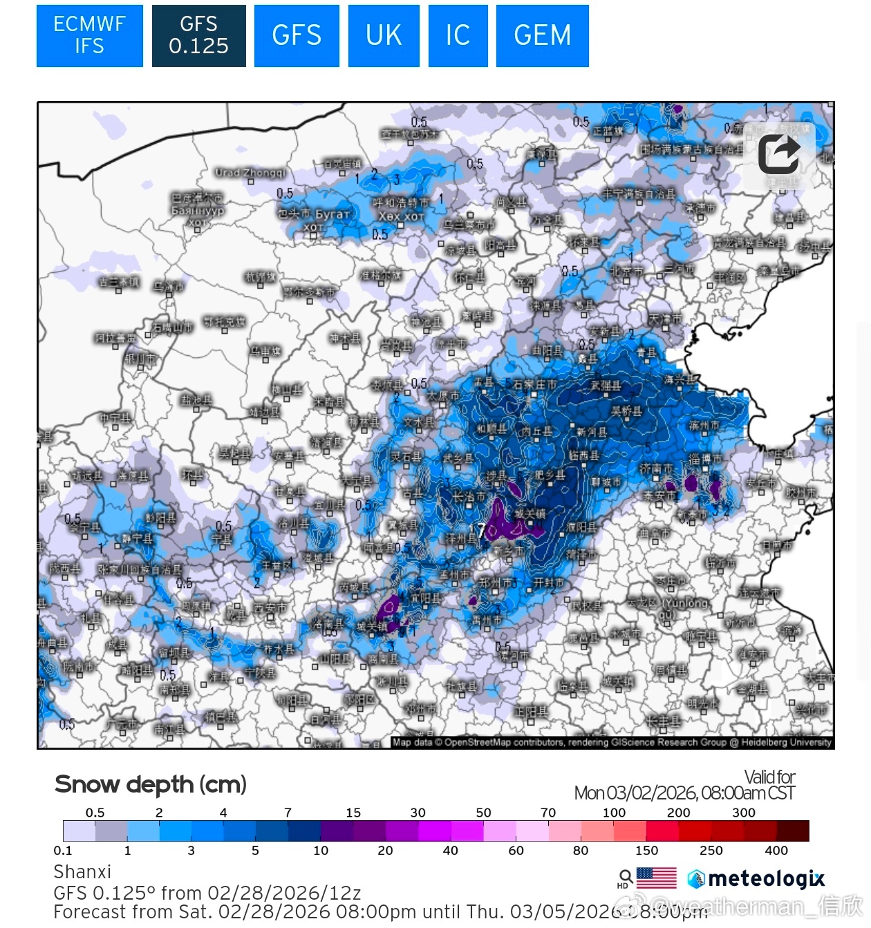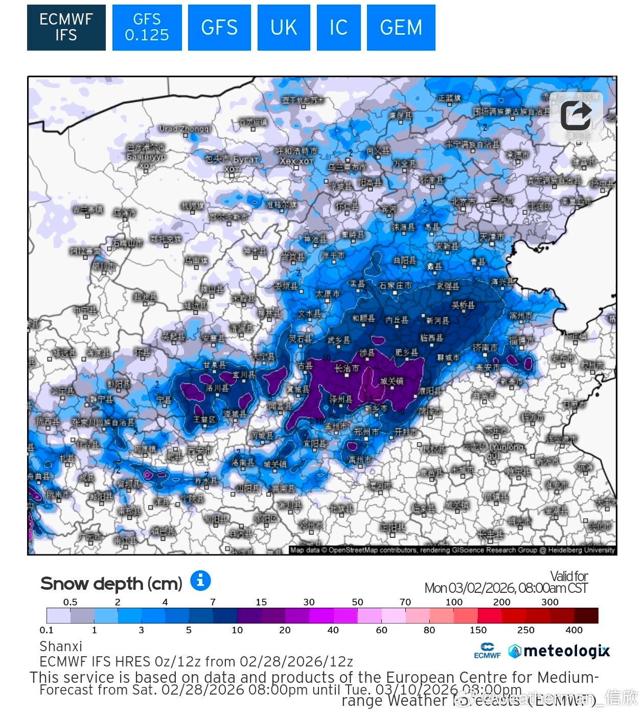 图2为官方报的强降雪落区,图3-4为欧美数值模式的降雪预报。图5-6为3月2日08时积雪深度预报。总体上欧洲报的降雪和积雪比美国报更多一些。河南北部的安阳一带,可能成为降雪和积雪核心区。这一带处于太行山东侧,偏东风输送的水汽,在高空槽前的动力抬升和太行山地形抬升的双重作用下,增强降水。而且因为冷空气从华北向南伸,形成了冷舌,低空温度低,雨雪相态,雪为主。