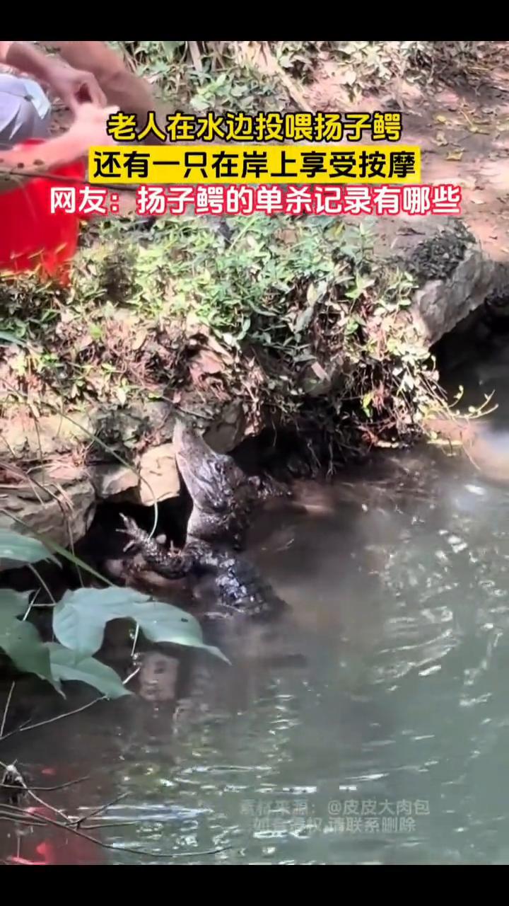 老人在水边投喂扬子鳄,还有一只在岸上享受按摩。 网友:扬子鳄的单杀记录有哪些?