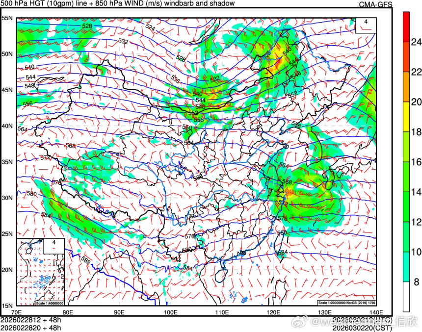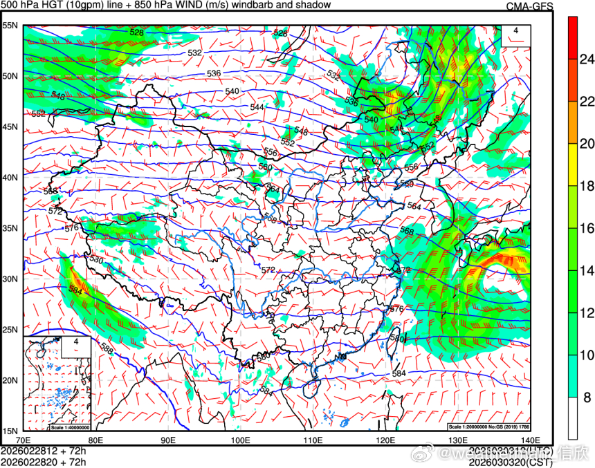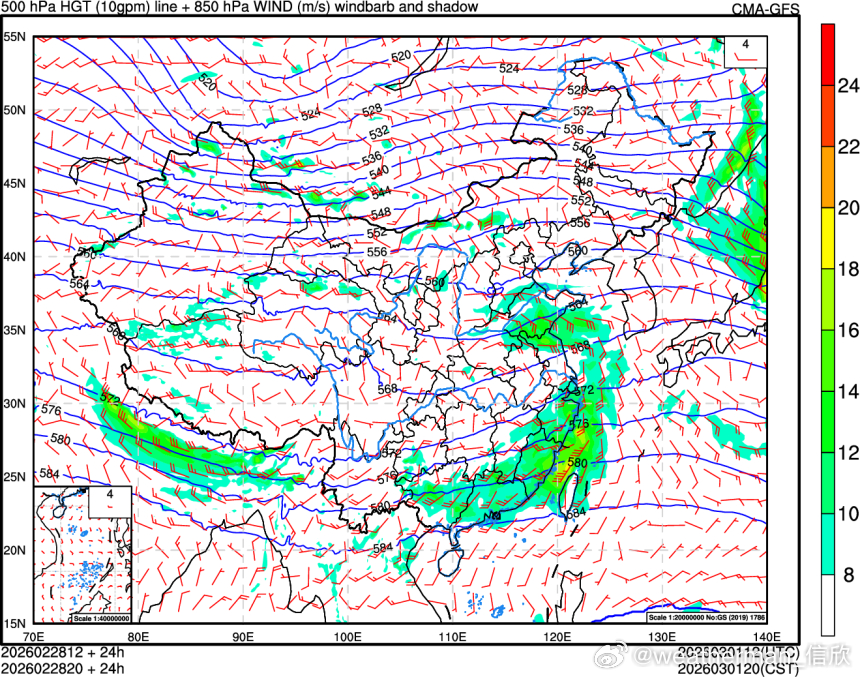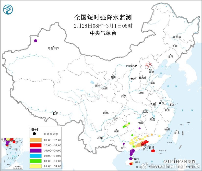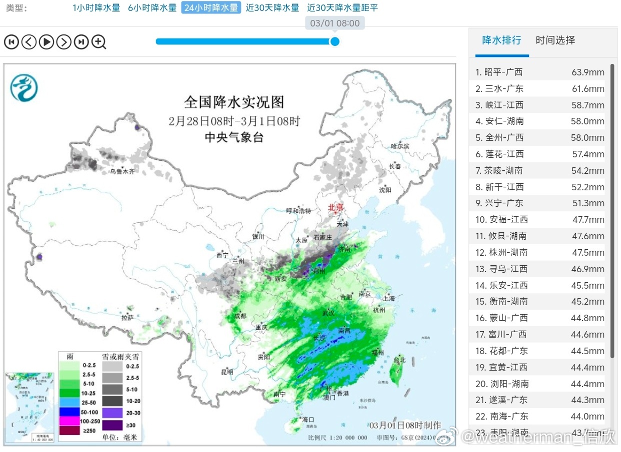 【强降雨】昨天到今晨,江南华南多地出现大雨,广西广东湖南江西部分站点出现暴雨,南方一些站点还监测到了单小时20毫米以上的短时强降雨。从今晨云图看,我国上空有大范围的降水云系,对应冷暖空气交汇。从形势场看,湖北一带有低涡,逆时针的环流,在其南侧和东侧,形成了南风和东风的水汽输送带。北方还有冷空气渗透南下,导致大范围降水。