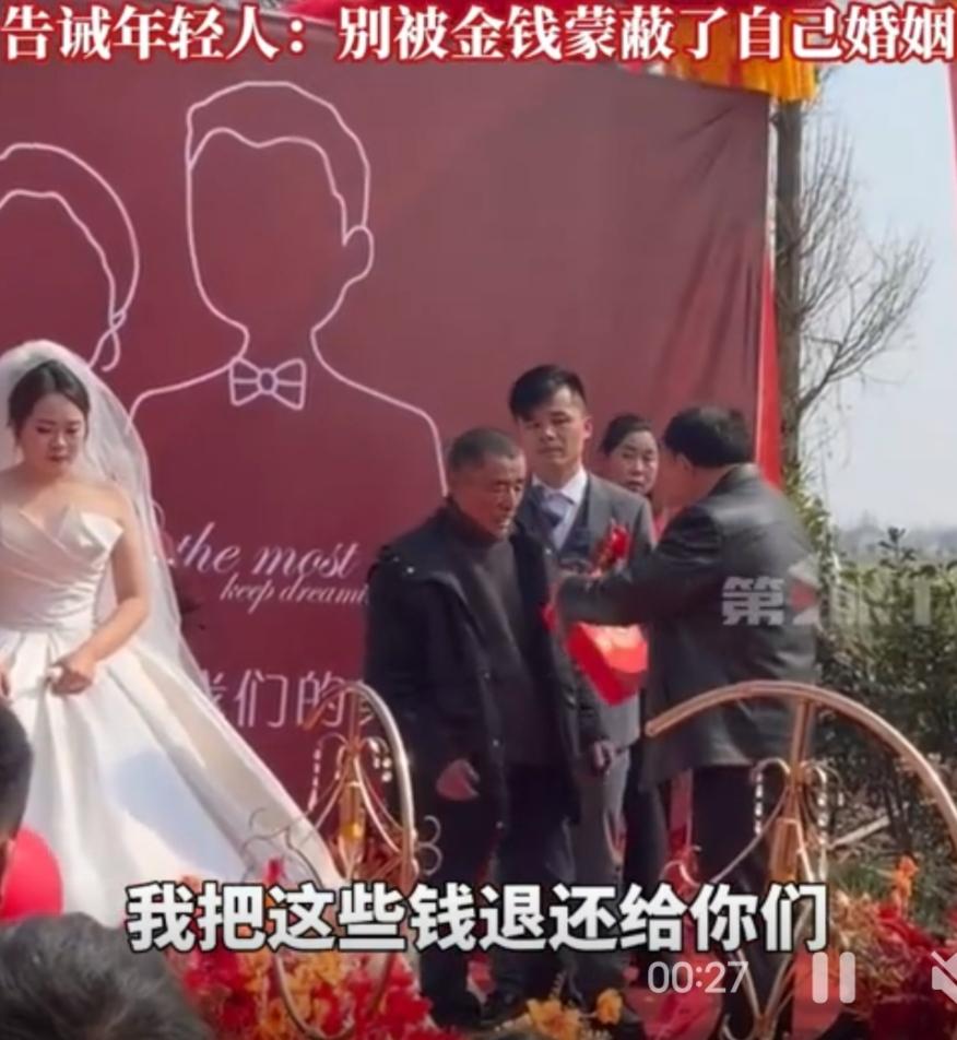 安徽一婚礼现场,新娘爸爸当场退还男方18万8彩礼,只拿走100元:意思到了就行,年轻人不要为金钱蒙蔽了自己的婚姻 现场瞬间鸦雀无声,所有人都瞪大眼睛,连司仪都忘了接话。新郎攥着双手,眼眶当场泛红,反复摆手说“叔,这是应该的,您一定要收下”。新娘站在一旁,眼泪止不住往下掉,她怎么也想不到,父亲会用这样的方式,给她最体面的嫁妆。 这18万8,不是小数目,是男方全家攒了多年、甚至找亲友周转才凑齐的心意,是沉甸甸的诚意,也是压在小两口心头的担子。很多人结婚,彩礼成了面子比拼、家庭博弈,少了被骂不重视,多了掏空家底,本该甜蜜的婚事,硬生生变成金钱拉锯战。多少情侣谈婚论嫁,卡在彩礼数字上;多少家庭为彩礼负债累累,婚后一地鸡毛;多少父母把女儿的幸福,明码标价成一串数字,忘了婚姻从来不是买卖,而是两家人帮一家人。 这位父亲太通透了。他留100元,是守礼数、领心意;退回全款,是护女儿、疼晚辈。他说“不要为金钱蒙蔽婚姻”,一句话戳破当下婚恋最扎心的真相:钱能买排场,买不来真心;能凑面子,凑不来安稳。真正的门当户对,是人品靠谱、三观相合、彼此心疼,不是存折上的数字、酒席上的排场。 这一幕之所以刷屏,不是因为钱多钱少,而是我们太久没见过这样纯粹的父爱与家风。不攀比、不贪心、不裹挟,只盼孩子日子轻松、夫妻同心。比起天价彩礼、豪华婚礼,这份通透与善良,才是最珍贵的陪嫁。 有人说他傻,放着钱不要;可懂的人都明白,他给女儿的,是无债一身轻的底气,是被尊重被疼爱的底气,是小家庭从零开始、踏实过日子的底气。 你觉得,这样的彩礼观,该不该成为主流?你身边有因为彩礼闹僵的事吗?评论区说说。18万的彩礼,到底合不合理