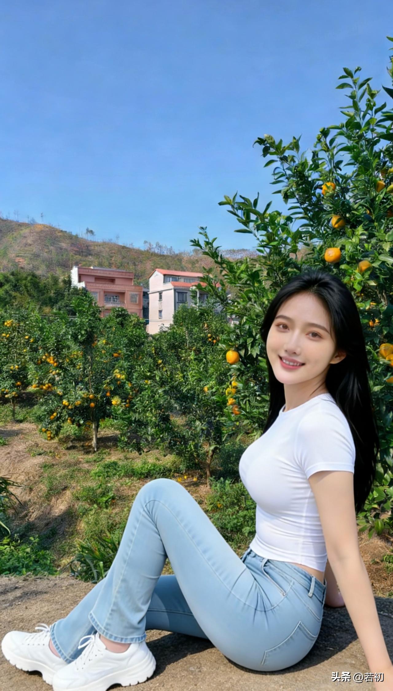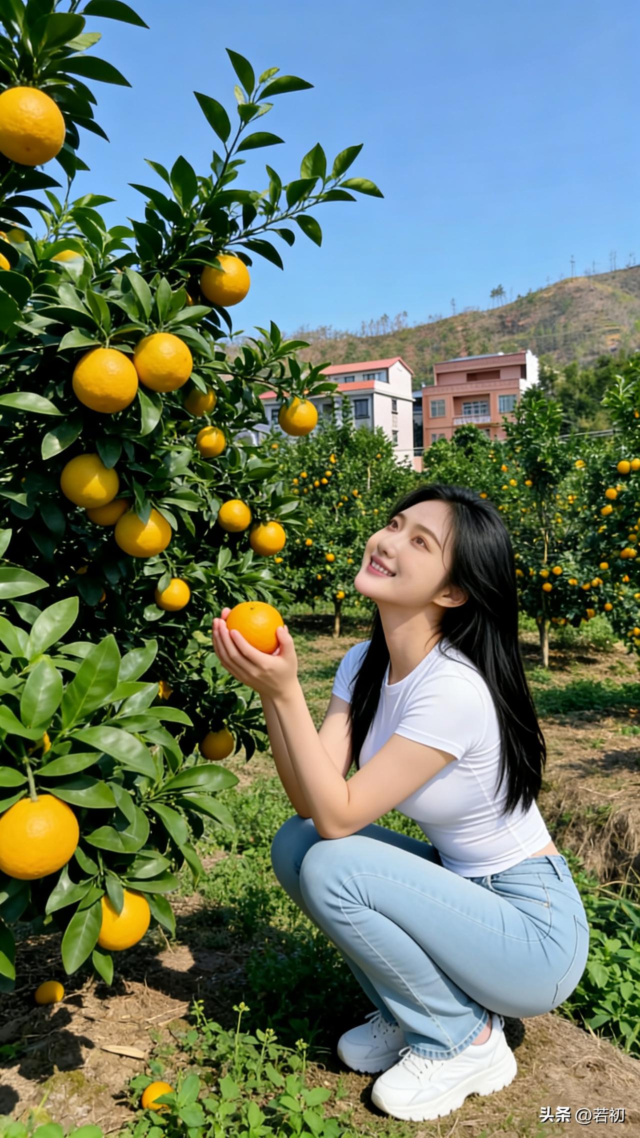 阳光明媚的果园里,元气少女与橙香相伴,笑靥如花。