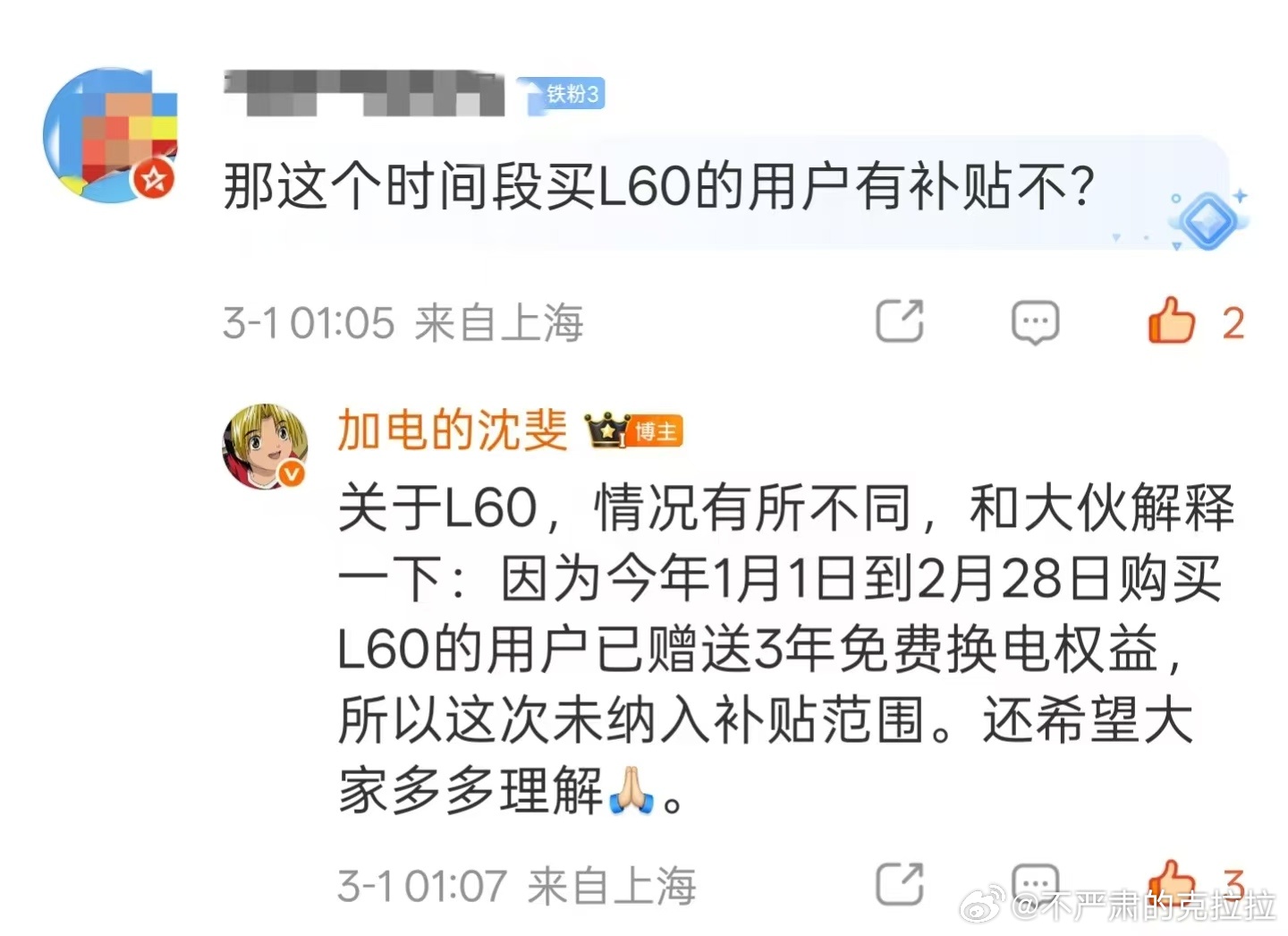 我看到沈博的微博底下有网友提问原来是乐道遭三月份调整了相应的购车政策七年超低息和购置税兜底同享