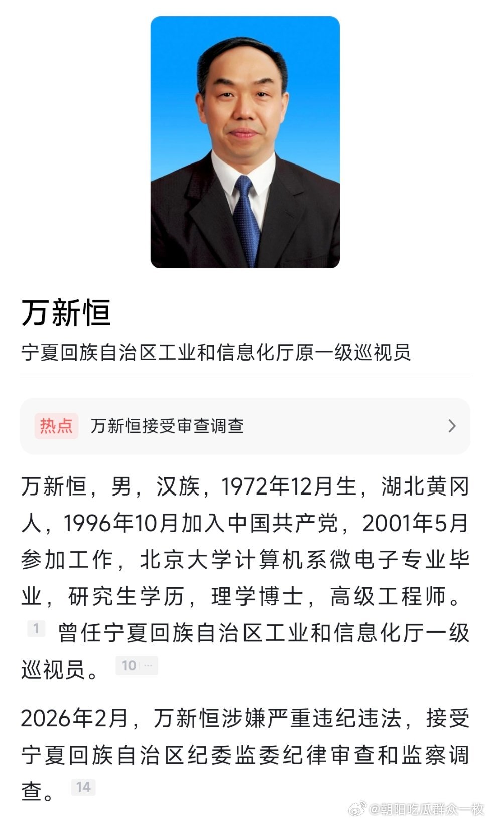 万新恒被查!曾任中卫市市长等职。