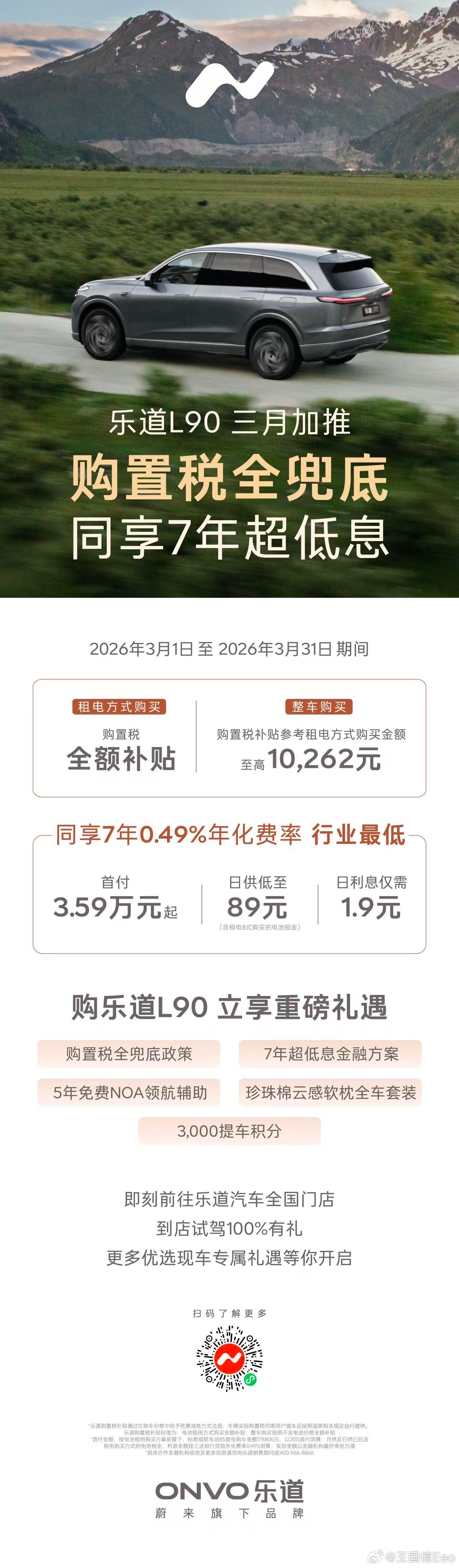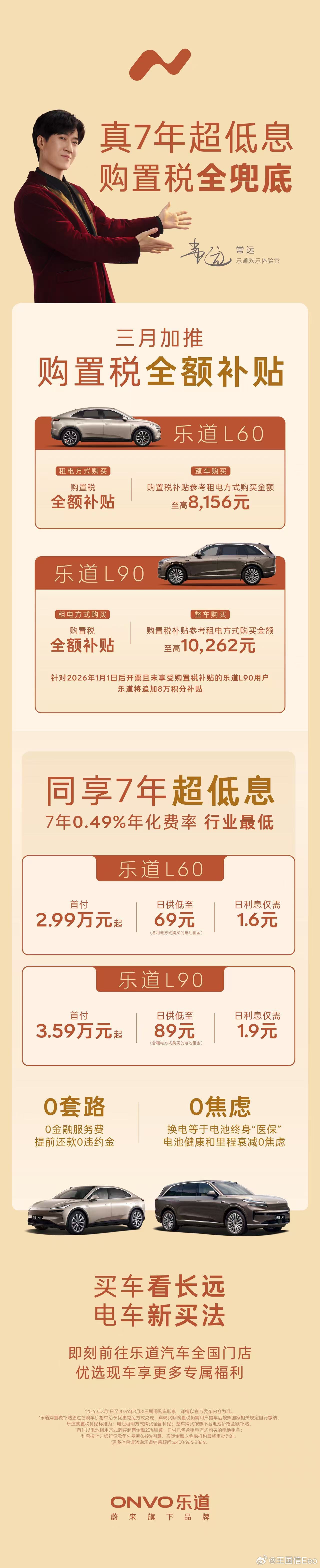 乐道在3月再推重磅购车优惠政策,继行业费率最低的7年超低息金融方案后,加推购置税全兜底政策,全系至高补贴10,262元。同时针对2026年1月1日后开票且未享受购置税补贴的乐道L90用户,乐道将追加8万积分补贴回馈。乐道推出的7年超低息金融方案,享行业最低7年0.49%年化费率,0服务费、提前还款0违约金。购买乐道L60,首付29,980元起,日供低至69元*;购买乐道L90,首付35,960元起,日供低至89元*。此次加推的购置税全兜底政策,电池租用方式购买,购置税全额补贴;整车购买,购置税补贴至高10,262元。此外,购车更享5年免费NOA领航辅助、云感舒享套装以及3,000提车积分等好礼。