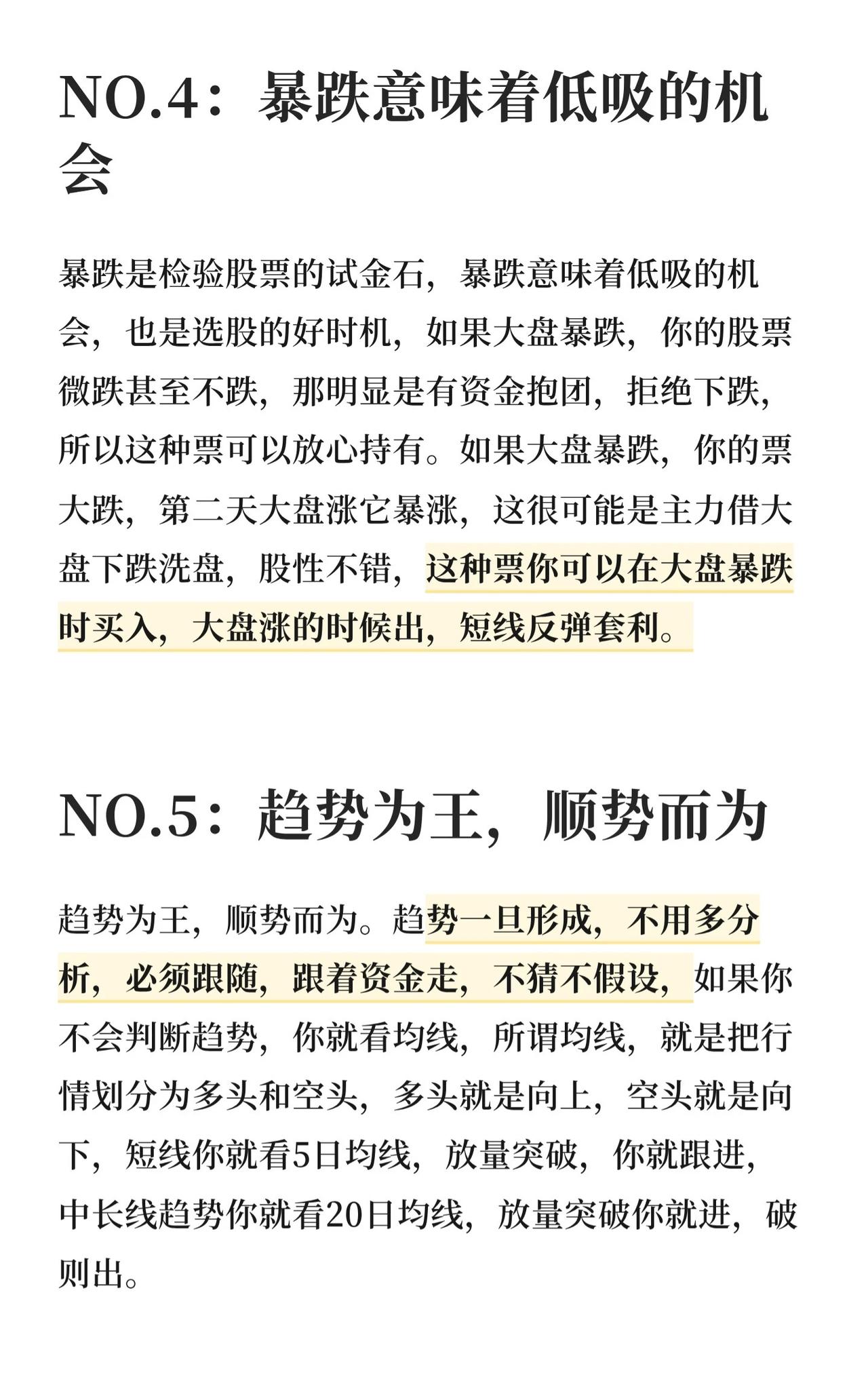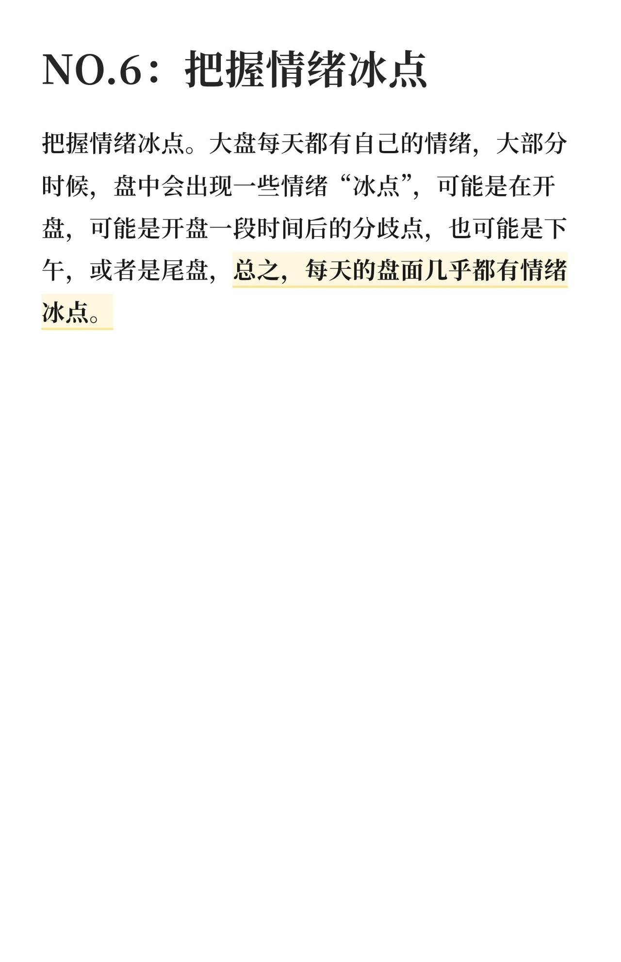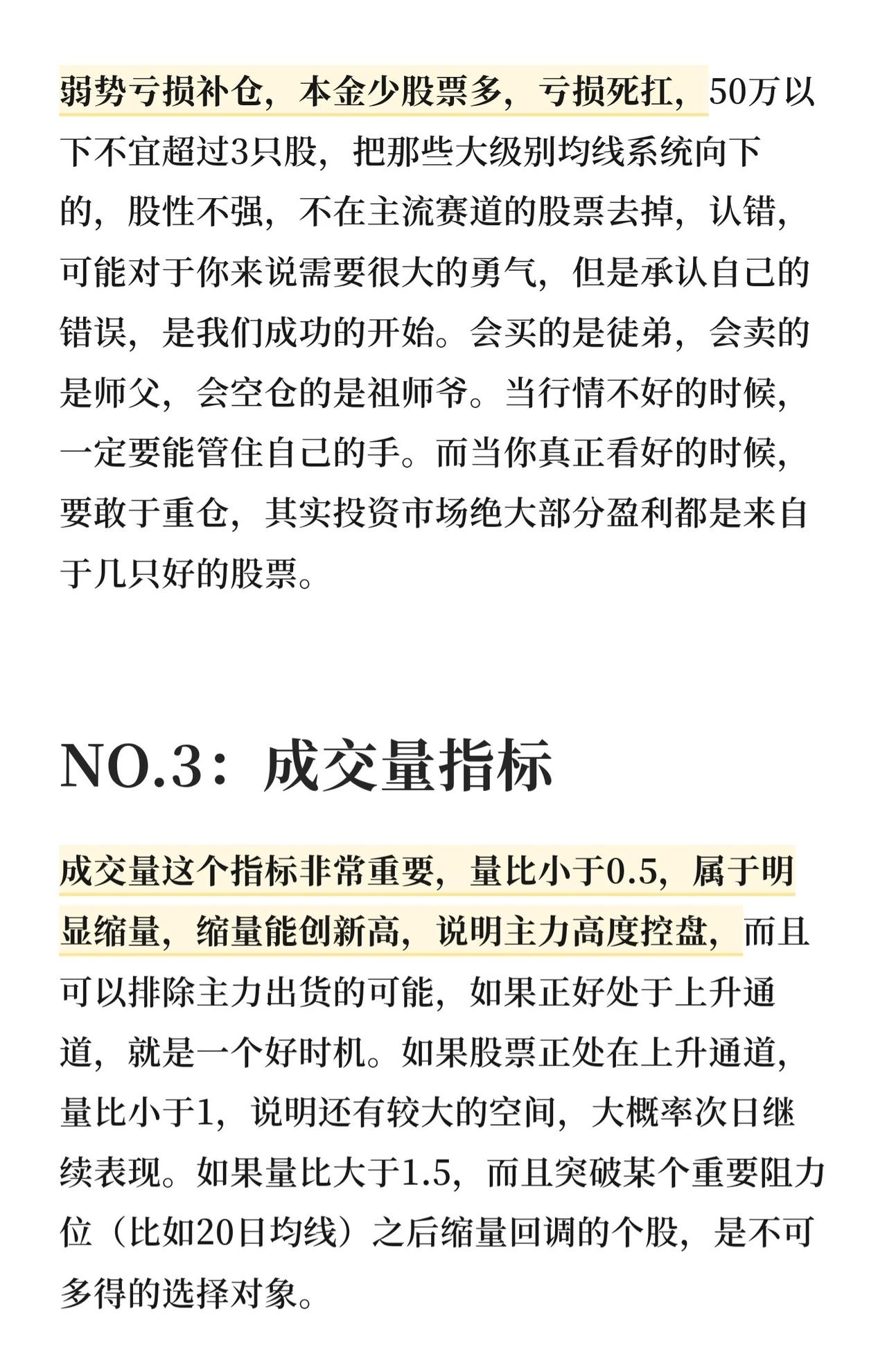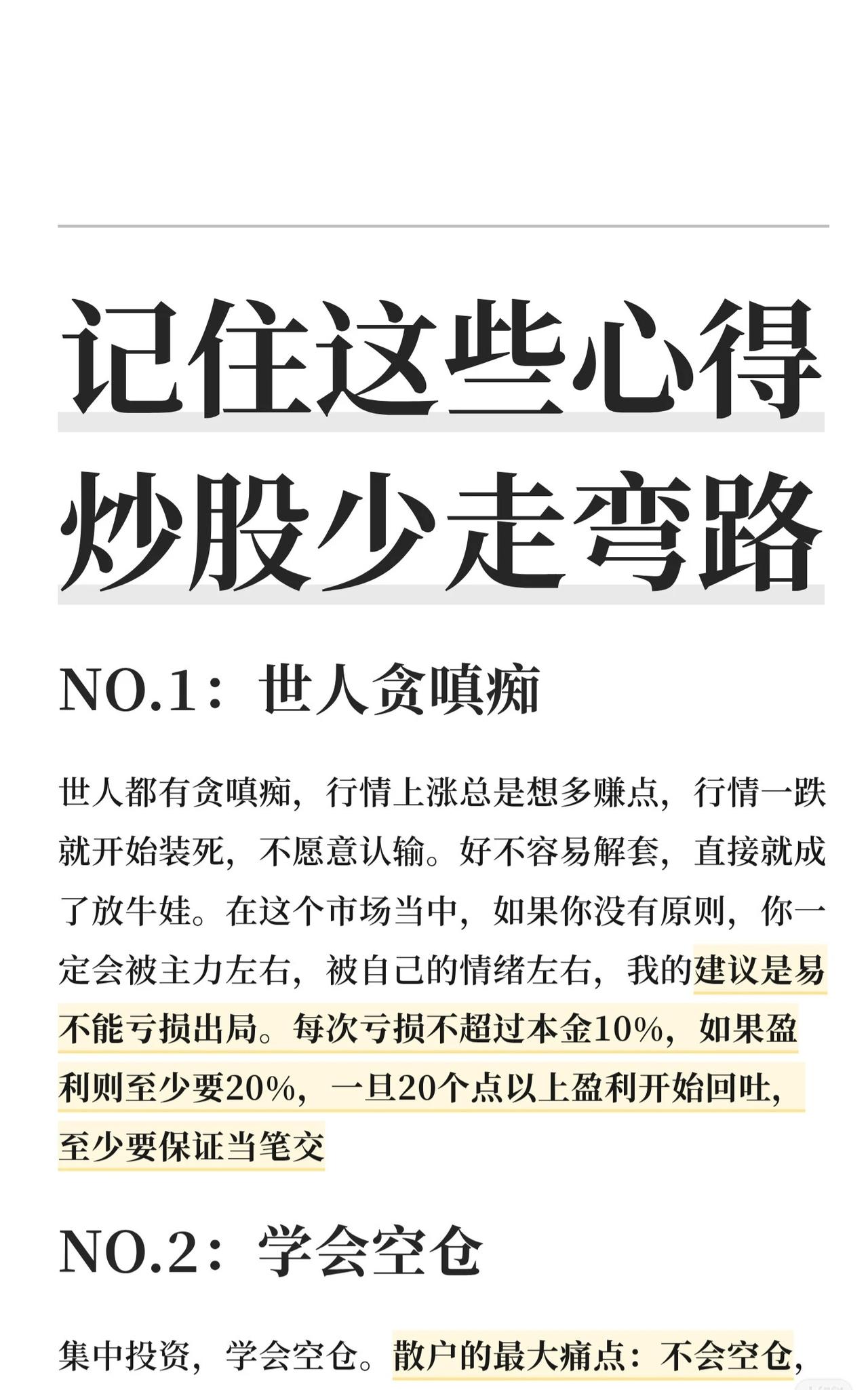 我为你整理了一份简明炒股心得汇总,便于快速回顾核心要点: NO.1 世人贪嗔痴 - 炒股常见心态问题:贪婪、不愿认输、解套就卖。 - 操作原则: - 每次亏损 ≤ 本金的 10%。 - 盈利 ≥ 20% 才考虑止盈。 - 盈利回吐到 20% 附近时,至少保住当笔交易利润。 NO.2 学会空仓 & 成交量指标 - 弱势/亏损时: - 本金少时持股 ≤ 3只。 - 剔除均线向下、股性差、非主流赛道股票。 - 敢于认错,行情差时管住手,行情好时敢于重仓。 - 成交量判断: - 量比 < 0.5:明显缩量,若创新高说明主力控盘,可关注。 - 上升通道 + 量比 < 1:上涨空间大,次日可能续涨。 - 量比 > 1.5 并突破阻力位后缩量回调:优质选择。 NO.3 暴跌与趋势 - 暴跌是试金石: - 大盘跌,个股抗跌 → 资金抱团,可持有。 - 大盘跌,个股大跌但次日暴涨 → 主力洗盘,短线套利机会。 - 趋势为王: - 短线看 5日均线:放量突破跟进,跌破止盈/止损。 - 中长线看 20日均线:同上原则。 NO.4 把握情绪冰点 - 大盘每日都有情绪冰点(开盘、盘中分歧点、下午或尾盘)。 - 识别并利用情绪低点寻找入场机会。 ✅ 核心思路:控制风险(止损止盈)+ 顺势而为(均线趋势)+ 精选标的(成交量、抗跌性)+ 把握节奏(空仓与情绪冰点)。