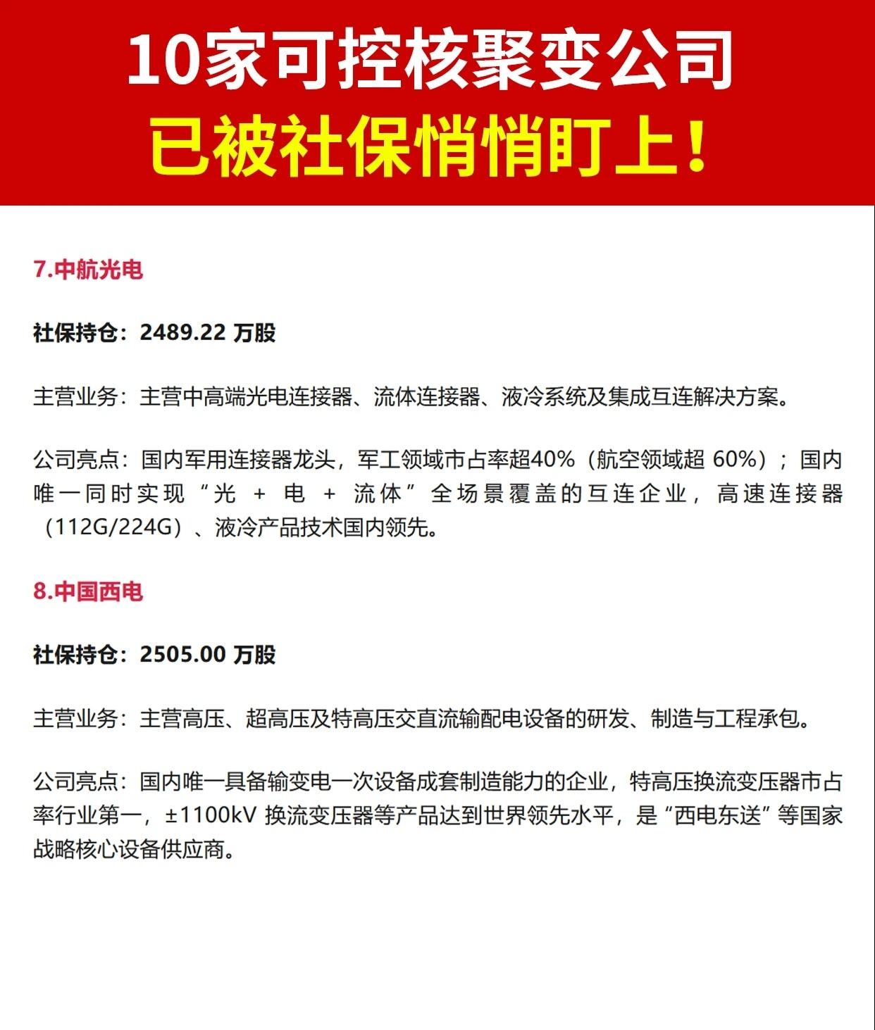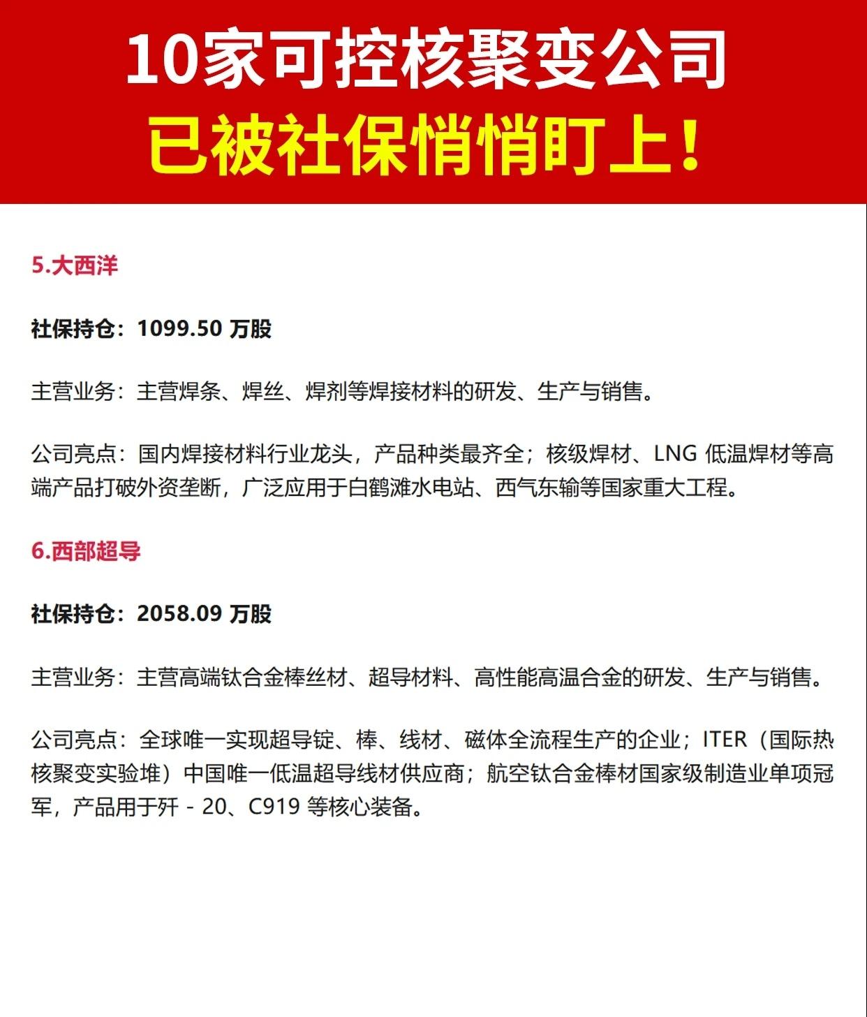 汇总了 社保基金近期重仓的 10 家可控核聚变概念上市公司,涵盖持股数量、主营业务及核心亮点。信息如下(按排名整理): 1. 永鼎股份 - 社保持仓:400.00 万股 - 主营业务:光通信、高温超导材料、新能源汽车线束、海外电力工程 - 亮点:全球唯一量产第二代高温超导带材企业,国内市占率超 80%;100G EML 光芯片获头部验证,800V 高压线束进入比亚迪、特斯拉供应链。 2. 中钨高新 - 社保持仓:437.04 万股 - 主营业务:钨精矿、硬质合金、PCB 钻针、光伏钨丝等全产业链 - 亮点:中国五矿旗下钨产业唯一上市平台,全球硬质合金产量第一;高端数控刀片、PCB 微钻打破海外垄断,光伏钨丝卡位 TOPCon/HJT 切割耗材,资源自给率 >80%。 3. 川仪股份 - 社保持仓:733.85 万股 - 主营业务:工业自动化仪表及控制系统研发、制造、集成 - 亮点:国内最大、产品最全的自动化仪表企业,14 项产品突破“卡脖子”技术,智能压力变送器、电磁流量计市占率国内领先,服务中石油、国家电网。 4. 东方钽业 - 社保持仓:1036.72 万股 - 主营业务:钽粉、钽丝、钽铌制品、超导铌材 - 亮点:钽丝全球市占率 >55%(全球第一);国内唯一量产 6N 级半导体高纯钽材,进入中芯国际 7nm 制程;铌超导腔占国内大科学装置 90%份额,ITER 铍材核心供应商。 5. 大西洋 - 社保持仓:1099.50 万股 - 主营业务:焊条、焊丝、焊剂等焊接材料 - 亮点:国内焊接材料龙头,产品最全;核级焊材、LNG 低温焊材打破外资垄断,应用于白鹤滩水电站、西气东输等国家工程。 6. 西部超导 - 社保持仓:2058.09 万股 - 主营业务:高端钛合金棒丝材、超导材料、高性能高温合金 - 亮点:全球唯一实现超导锭—棒—线材—磁体全流程生产企业;ITER 中国唯一低温超导线材供应商;航空钛合金棒材国家级制造业单项冠军,用于歼-20、C919。 7. 中航光电 - 社保持仓:2489.22 万股 - 主营业务:中高端光电连接器、流体连接器、液冷系统及集成互连方案 - 亮点:国内军用连接器龙头,军工市占率 >40%(航空 >60%);唯一实现“光+电+流体”全场景覆盖,高速连接器(112G/224G)、液冷技术国内领先。 8. 中国西电 - 社保持仓:2505.00 万股 - 主营业务:高压、超高压、特高压输配电设备研发制造与工程承包 - 亮点:国内唯一具备输变电一次设备成套制造能力企业,特高压换流变压器市占率行业第一,±1100kV 产品世界领先,服务“西电东送”国家战略。 9. 杭氧股份 - 社保持仓:4064.59 万股 - 主营业务:空分设备制造、工业气体供应、低温石化装备及 EPC - 亮点:全球空分设备龙头,6 万及以上等级特大型空分设备产销量全球第一;国内唯一可控核聚变低温系统核心设备供应商,技术打破国际垄断。 10. 久立特材 - 社保持仓:7544 万股 - 主营业务:高端无缝管、油气复合管、特种合金管材/管件 - 亮点:工业用不锈钢及特种合金管材龙头,国内唯二供应三代核电蒸发器 U 形管,全球唯一批量供应 ITER 核聚变导管,突破半导体、储氢、高温合金等“卡脖子”材料。 核心总结: 这 10 家公司均被社保基金重仓持有,业务覆盖 高温超导、钽铌材料、高端焊接、钛合金、光电连接、输配电、空分设备、特种管材 等,均直接或间接参与可控核聚变产业链的关键环节,部分在全球或国内处于技术领先地位。
