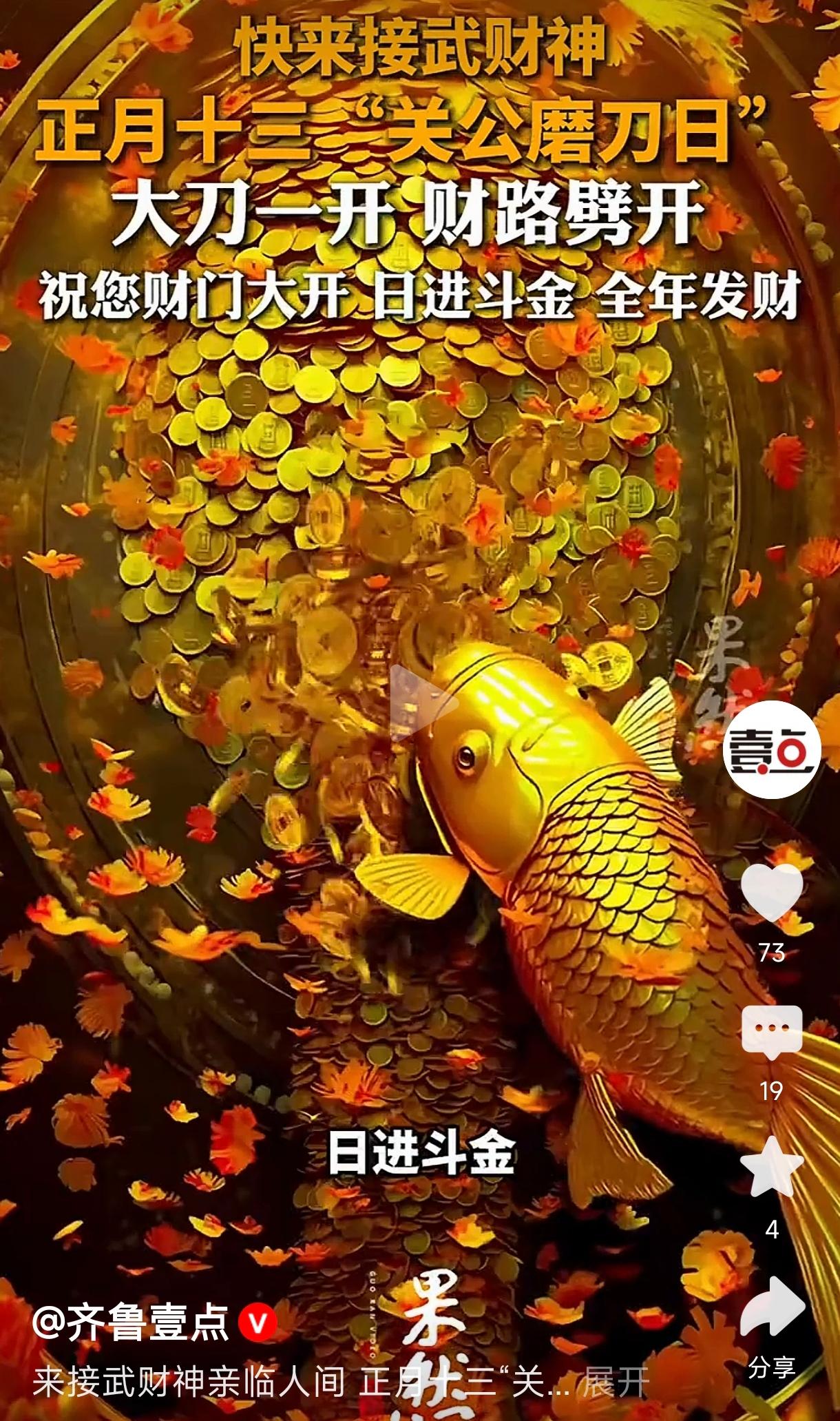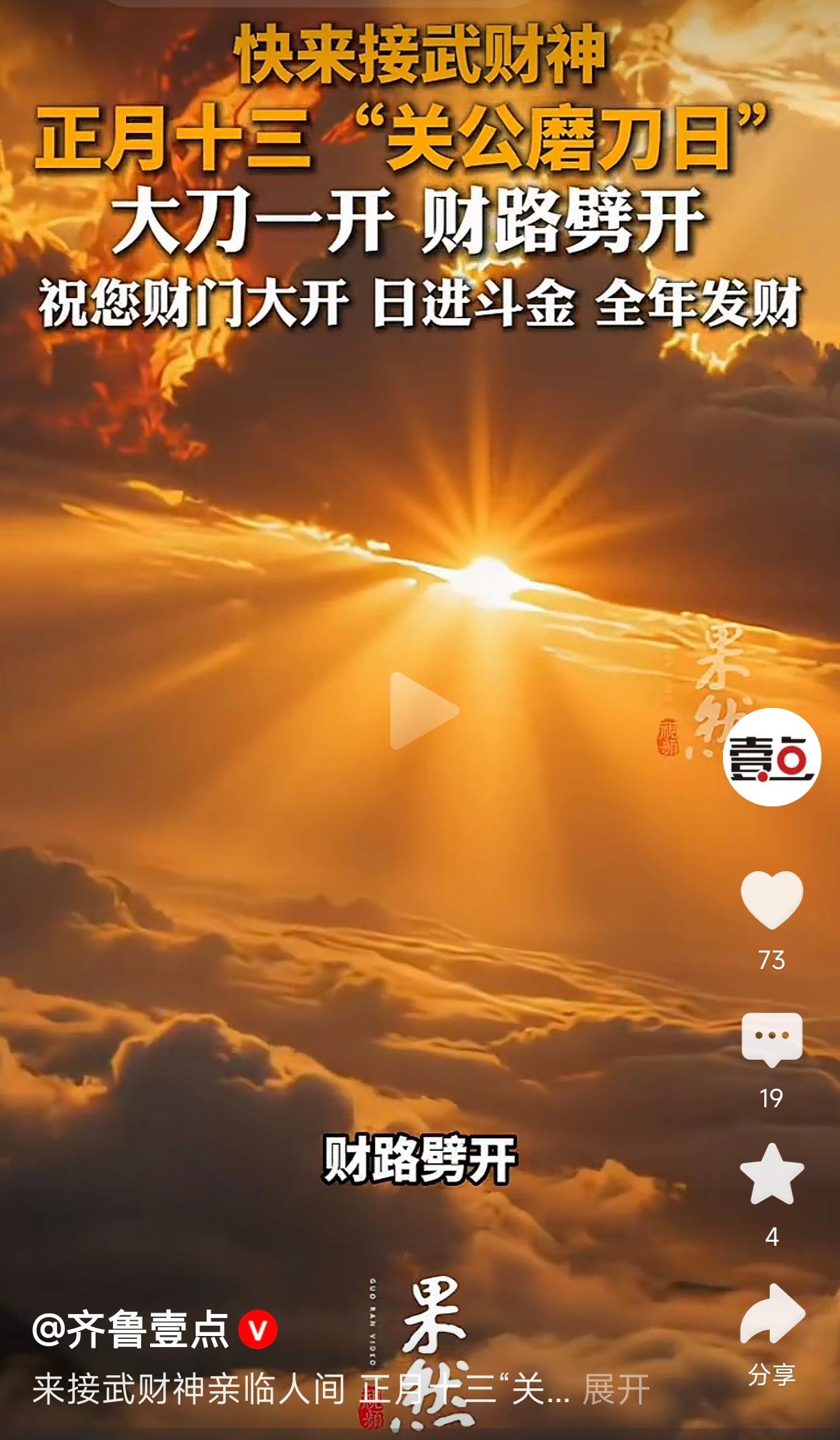 正月十三接武财神 正月十三迎接武财神的传统习俗,称这一天是“关公磨刀日”,寓意“财路劈开”,象征着新的一年财运亨通、财门大开、日进斗金、全年发财。 如果你想了解更多关于正月十三迎财神的习俗、历史渊源,或者如何在这一天进行相关的祈福活动,我可以为你详细介绍。需要吗?五点财神