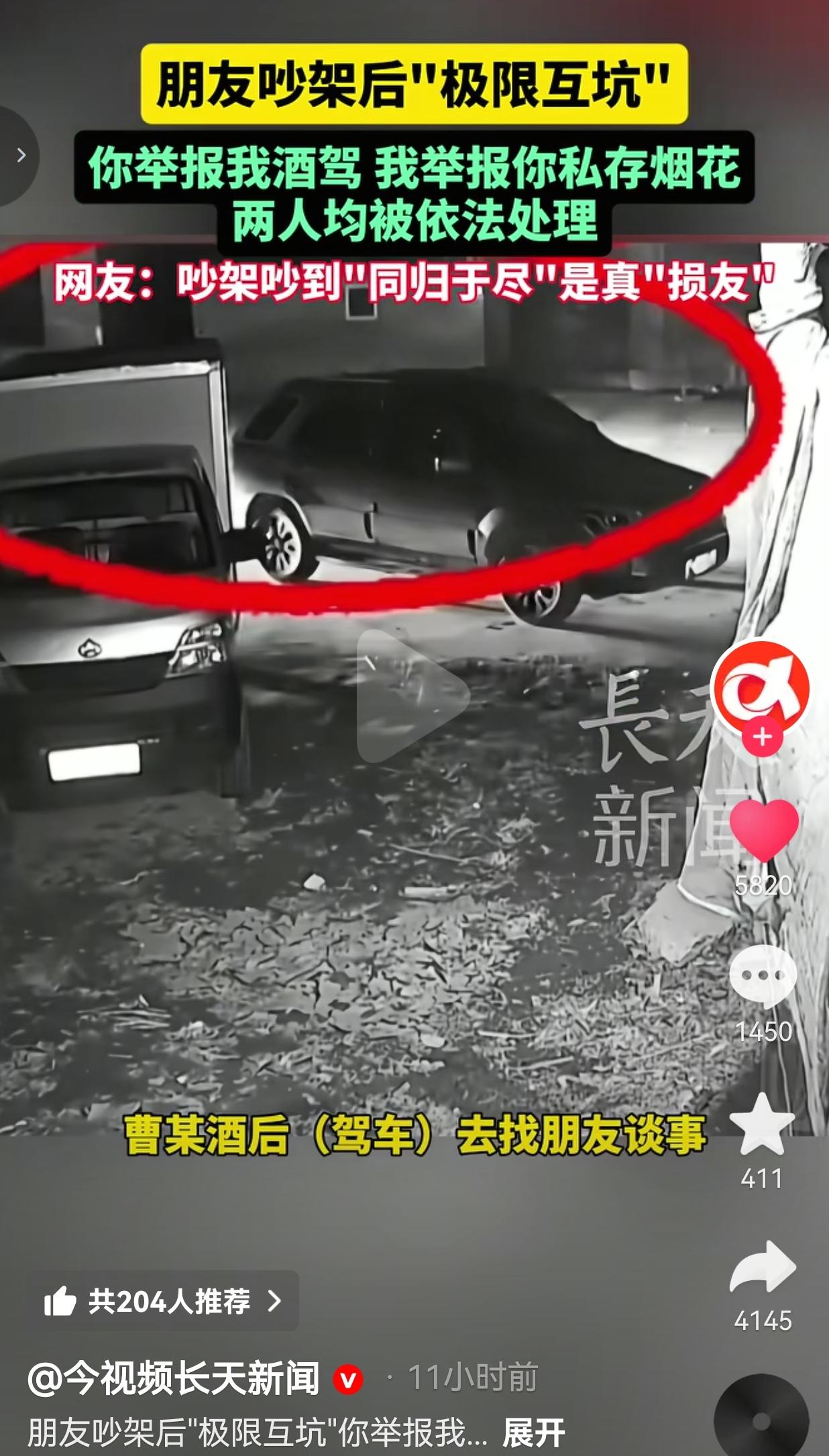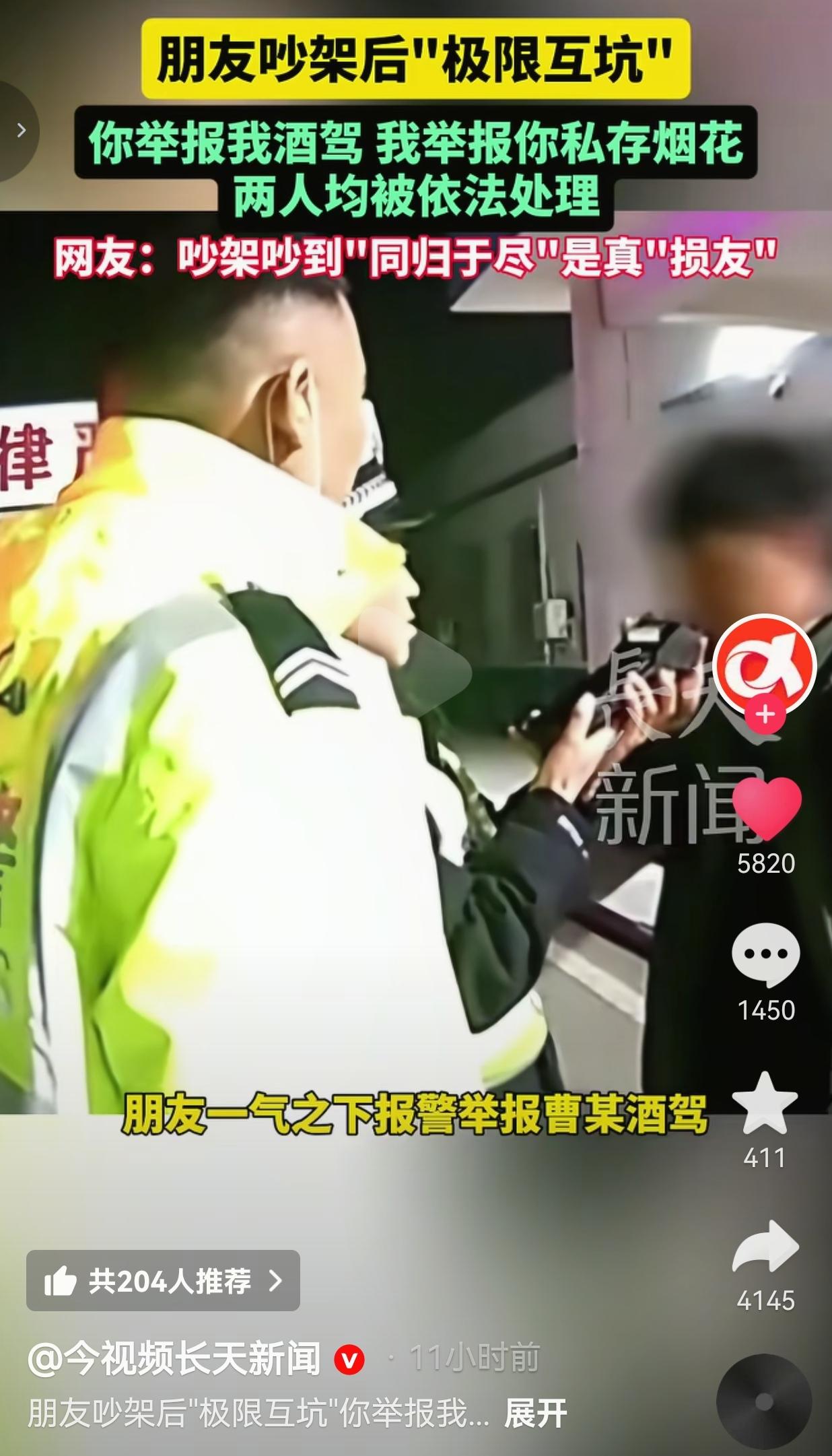 这真的是“损友”!近日,安徽亳州出了这么一档子事,看完真是让人又好气又好笑,还忍不住心里一紧。 事情是这样的:亳州的曹某,酒足饭饱之后,抱着侥幸心理,开着车就去找朋友“谈事”。谁知道俩人一见面就话不投机,没说几句就吵得面红耳赤,从“谈事”直接升级成了“互呛”。 朋友被气得上头,直接掏出了手机,当着曹某的面就报了警,在报警中声称:“警察同志,我要举报!他刚才喝酒了,还开车过来的!” 民警接到报警后,很快赶到现场,一测之下,曹某血液里的酒精含量高达188.5mg/100ml,远超醉驾标准,这下是跑不掉了。 可就在民警处理酒驾的时候,曹某也不甘示弱,当场就来了个“极限反杀”,对着民警大喊:“你举报我酒驾是吧?行!我也举报你!你家里私藏了烟花爆竹!” 这一下,连民警都愣住了。顺着曹某提供的线索一查,好家伙,他朋友家里还真藏着不少非法储存的烟花爆竹,民警随后果然查获了相关物品。 这下好了,一出朋友间的闹剧,直接变成了“案中案”。 最终,曹某因为醉驾,涉嫌危险驾驶罪,驾驶证被吊销,还得面临刑事处罚。他的朋友也因为非法储存危险物质,被警方立案调查。 两个曾经的朋友,就因为一时的口角,一个要坐牢,一个要被拘留,真是把“同归于尽”四个字演绎得淋漓尽致,堪称“极限互坑”的典型。 此事引发网友的热议,有的网友说:“真的是塑料兄弟情天花板,你送我踩缝纫机,我送你去吃牢饭。” 也有的网友说:“这根本不是朋友的做法,这是生死仇人啊!” 还有的网友说:“本来都是小事,非要互相捅刀子,最后把自己玩进去了。” 我想,这俩人事后肯定肠子都悔青了。本来就是朋友间的一点小矛盾,非要争个你死我活,结果把自己都搭进去了,双双把自己送进了法律的制裁名单。 你说曹某,明知道喝酒不能开车,还心存侥幸,这是对自己和他人生命的不负责。他朋友呢,家里私藏烟花爆竹,这玩意儿就是个定时炸弹,万一出点事,后果不堪设想。 他们俩都以为自己手里握着对方的“黑料”,就能在争吵中占上风,结果呢?谁也没占到便宜,反而把自己送进了法律的制裁名单里。 这事儿给我们所有人都提了个醒:千万别心存侥幸:酒驾、私藏烟花,这些都是法律明确禁止的红线,碰了就一定会付出代价。 情绪上头的时候,千万别做决定:吵架的时候,人最容易失去理智,做出让自己后悔一辈子的事。 真正的朋友,不是互相拆台,而是互相提醒:如果当时有一个人能冷静下来,劝对方一句“别冲动”,或者“这事违法,赶紧处理掉”,结局可能就完全不一样了。  大家觉得呢?欢迎大家评论区讨论留言。