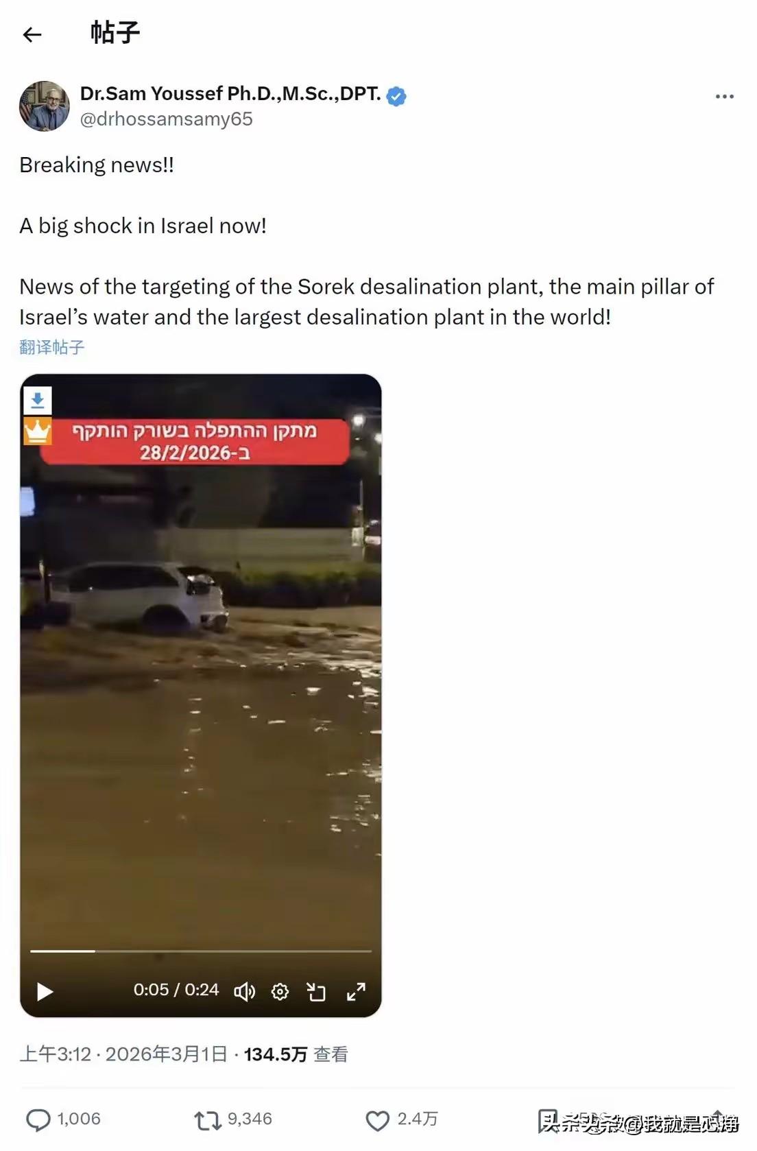 最新消息,伊朗终于对以色列的海水淡化厂发动攻击了 此次袭击造成了以色列国内巨大的惊恐,看来哈梅内伊的死,对伊朗人的刺激是巨大的 炸掉以色列所有的海水淡化装置,炸掉所有的电厂 攻击大城市里面所有的cbd高楼 这种攻击手段要比打军事目标更有效 现在要看伊朗人能不能撑得住,伊朗和美以联盟现在就是一个相互消耗弹药的阶段 看看谁能熬到最后阶段 大家放心吧,特朗普提前准备的弹药量大概也就能用一周 熬干了,他们肯定要谈判的,到那个时候,就看看伊朗人会不会再次上当吧